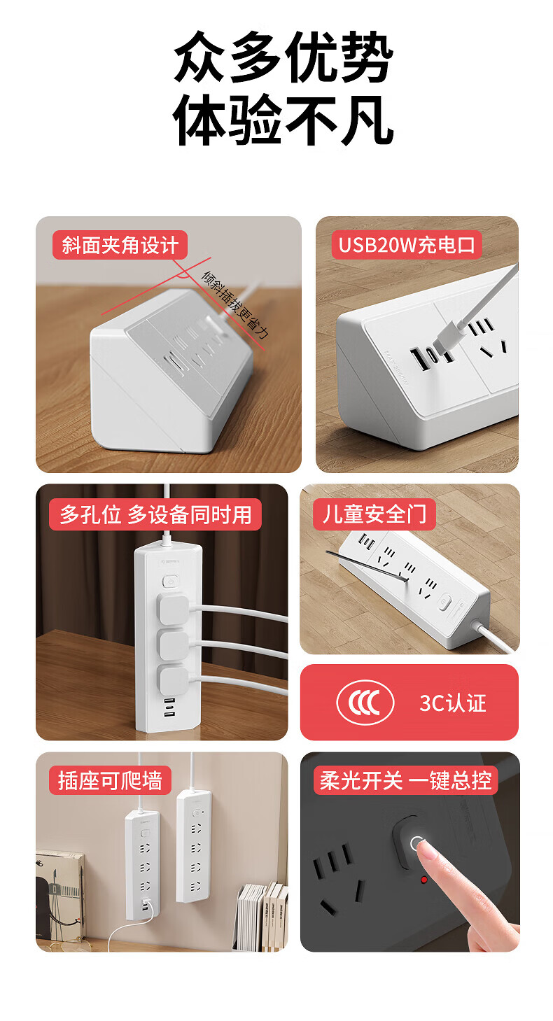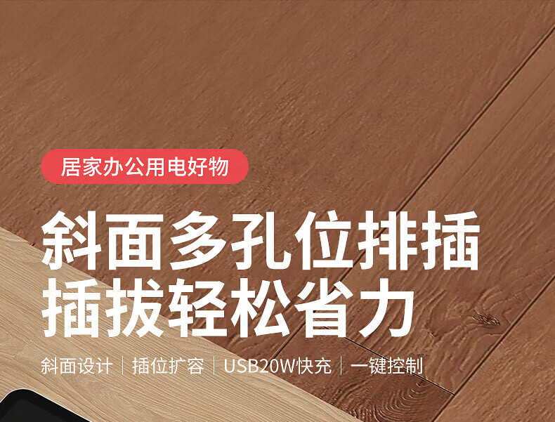 国际电工斜面三角插座带线排插快充USB家用办公宿舍桌面接线板多孔位插排 四位20孔【一键总控】线长0.3米