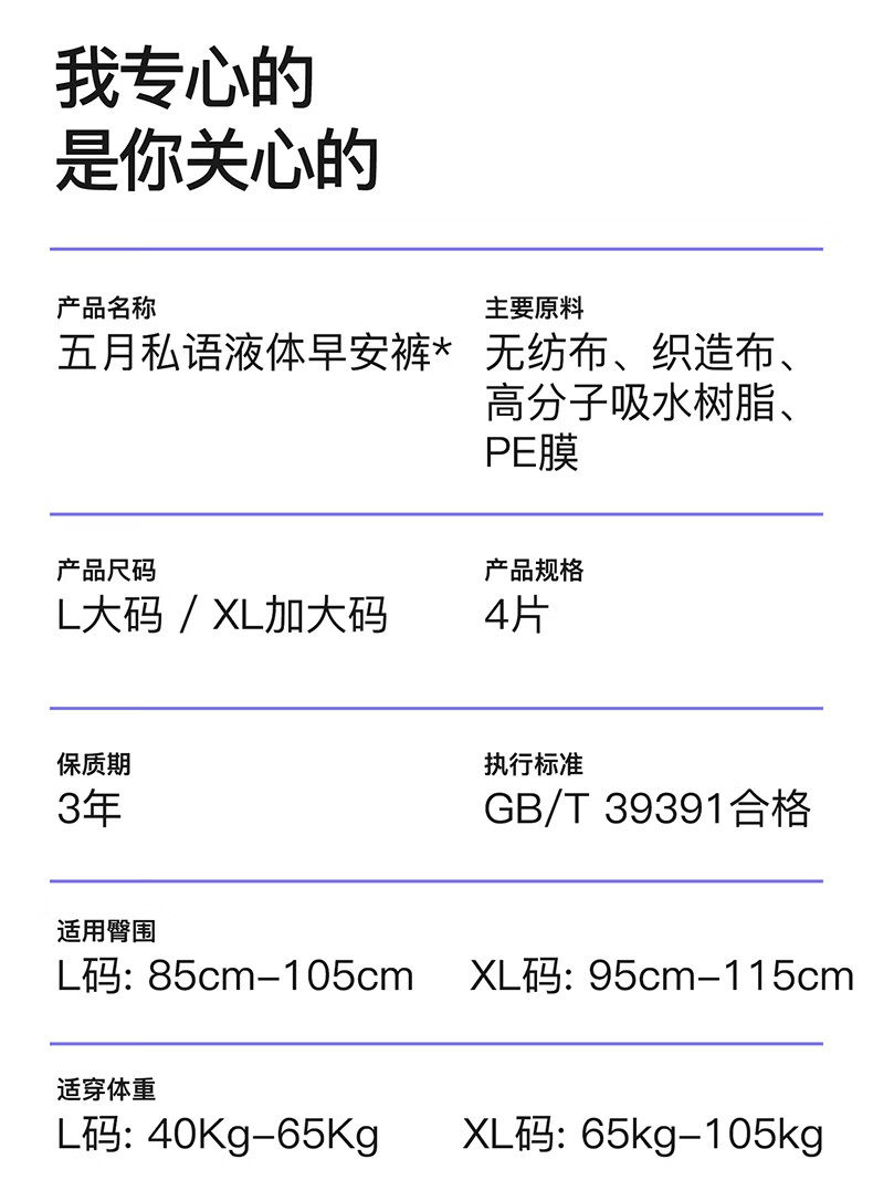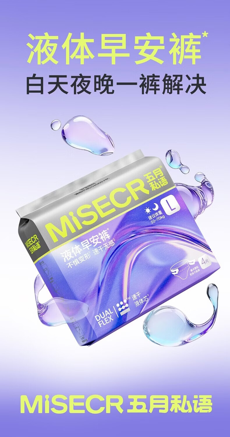 五月私语【关晓彤代言】液体早安裤速干芯科技隐血无感瞬吸超薄粘贴式囤货 XL 4片 130-210斤 婴儿级 【限时加赠】轻云安睡裤XL码*10片(建议140-210斤)
