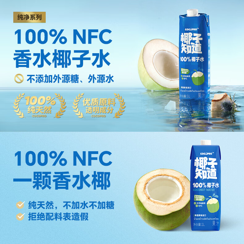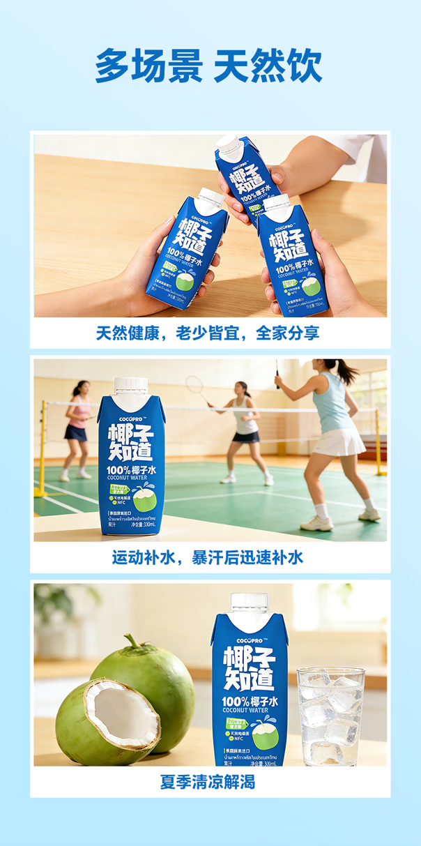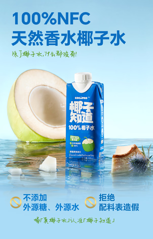 椰子知道100%NFC香水椰子水果汁电解质饮料孕妇可喝泰国进口果蔬汁330ml 【尝鲜装】330ml*3瓶