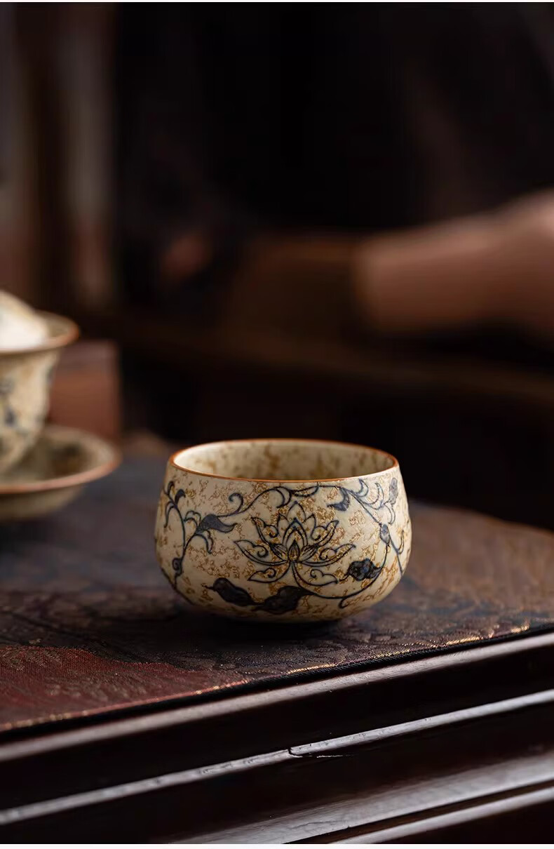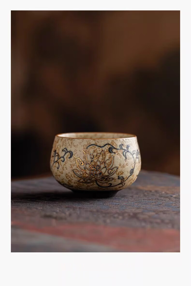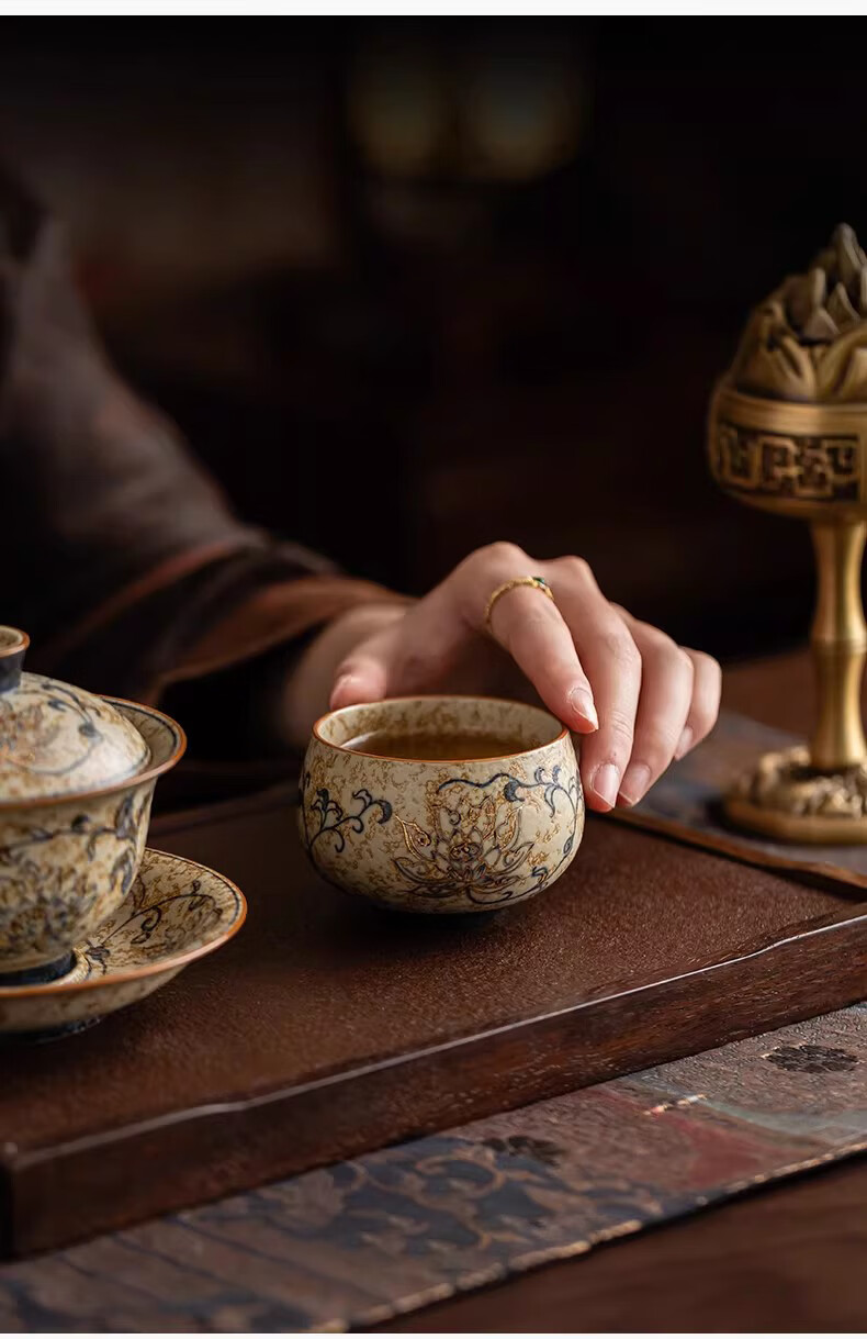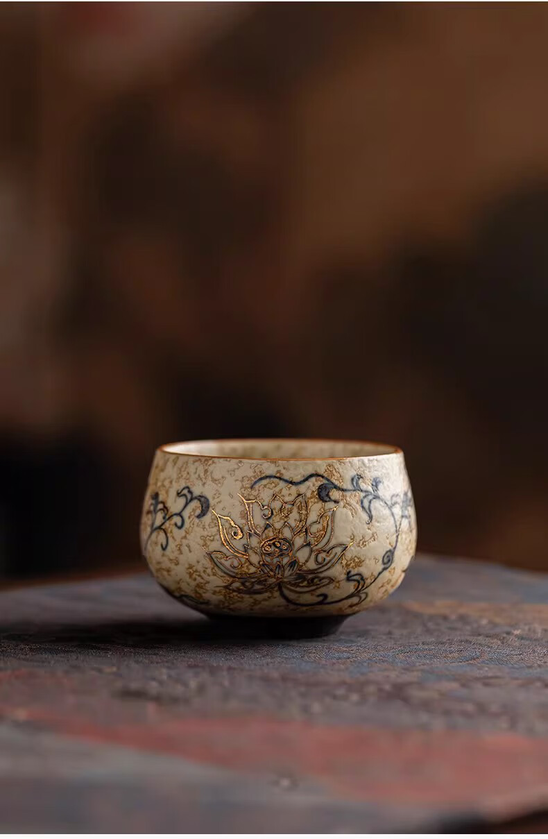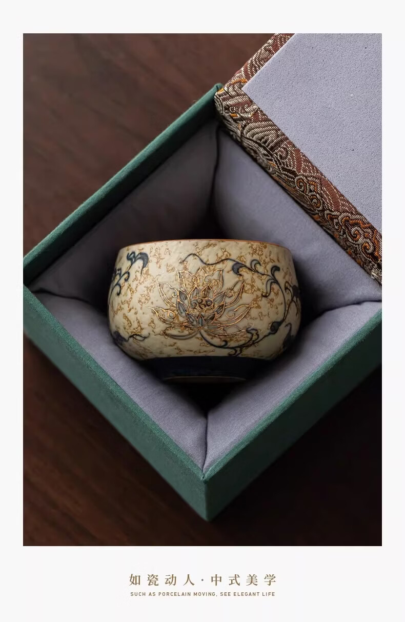 BOSSY敦煌手绘描金青花缠枝莲茶杯主人杯轻奢高档办公室家用品茗杯送礼 九色鹿丨手绘描金禅定对杯【礼盒装】