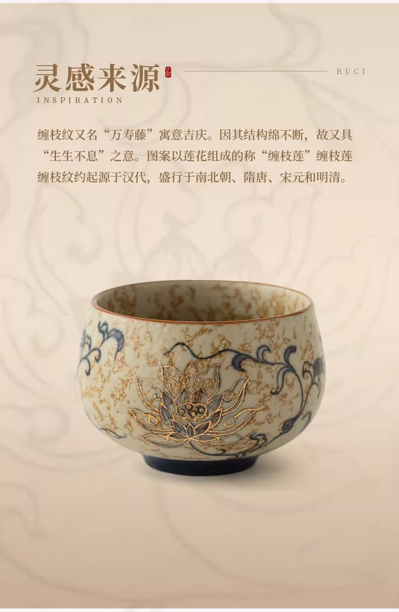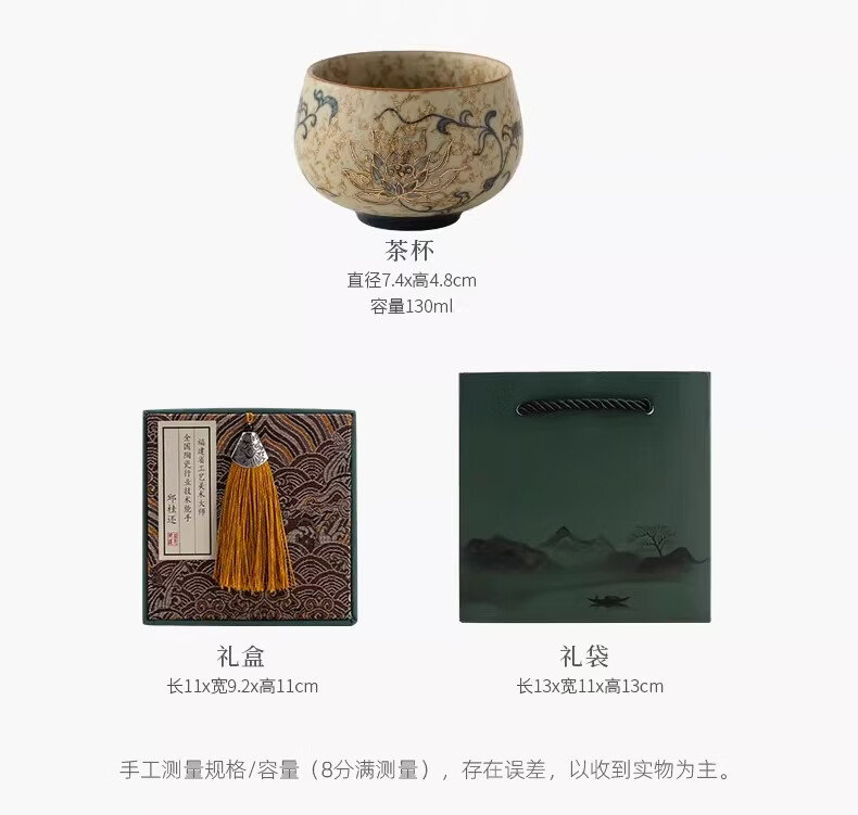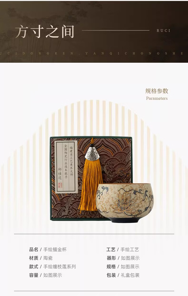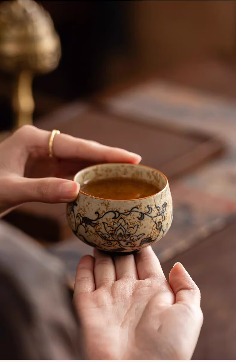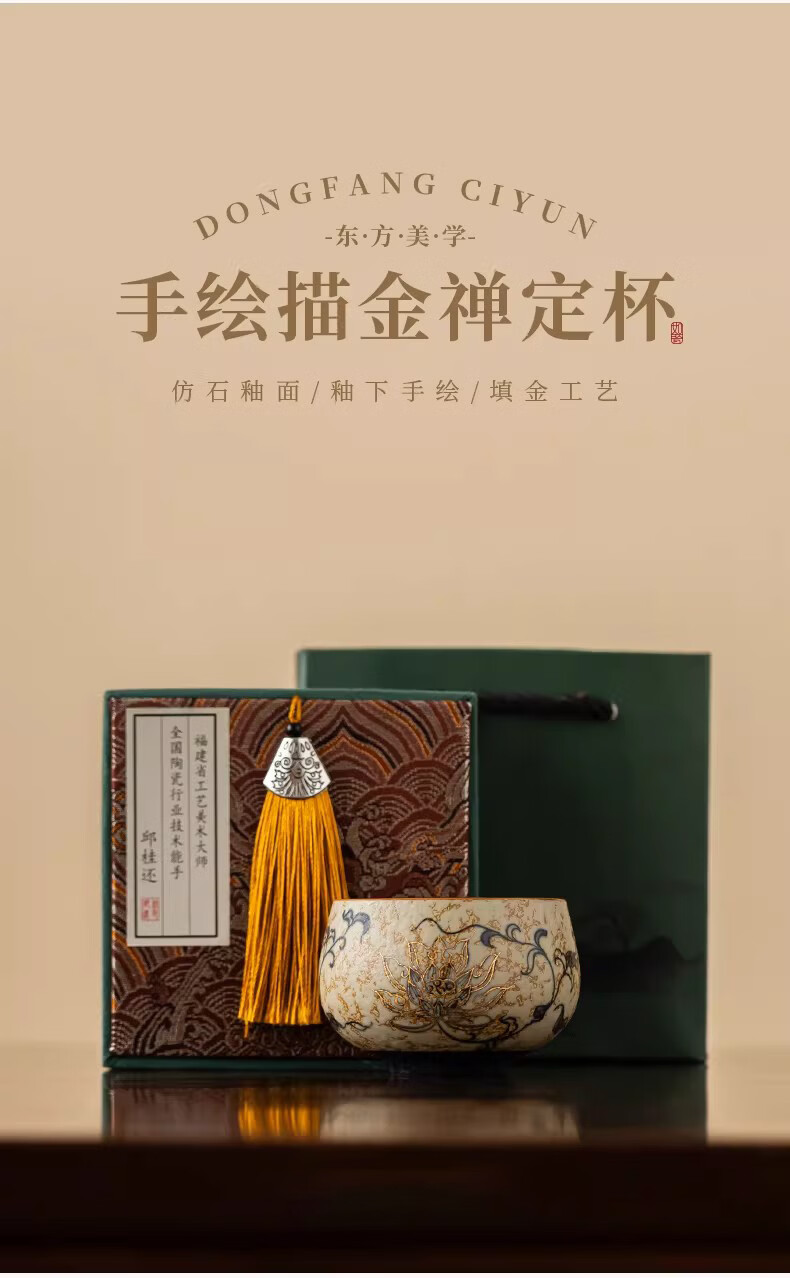 BOSSY敦煌手绘描金青花缠枝莲茶杯主人杯轻奢高档办公室家用品茗杯送礼 九色鹿丨手绘描金禅定对杯【礼盒装】