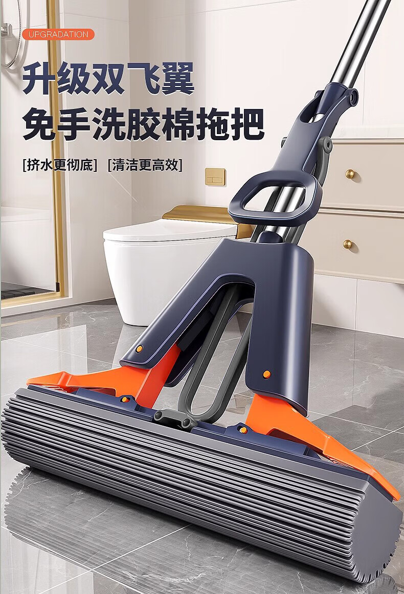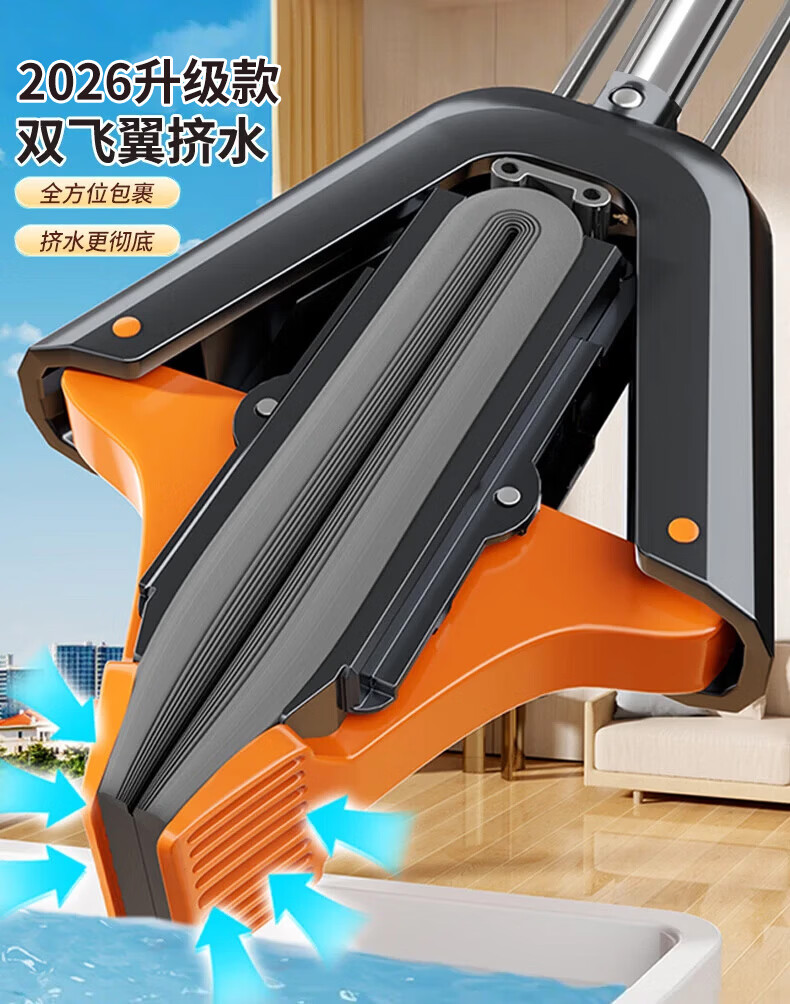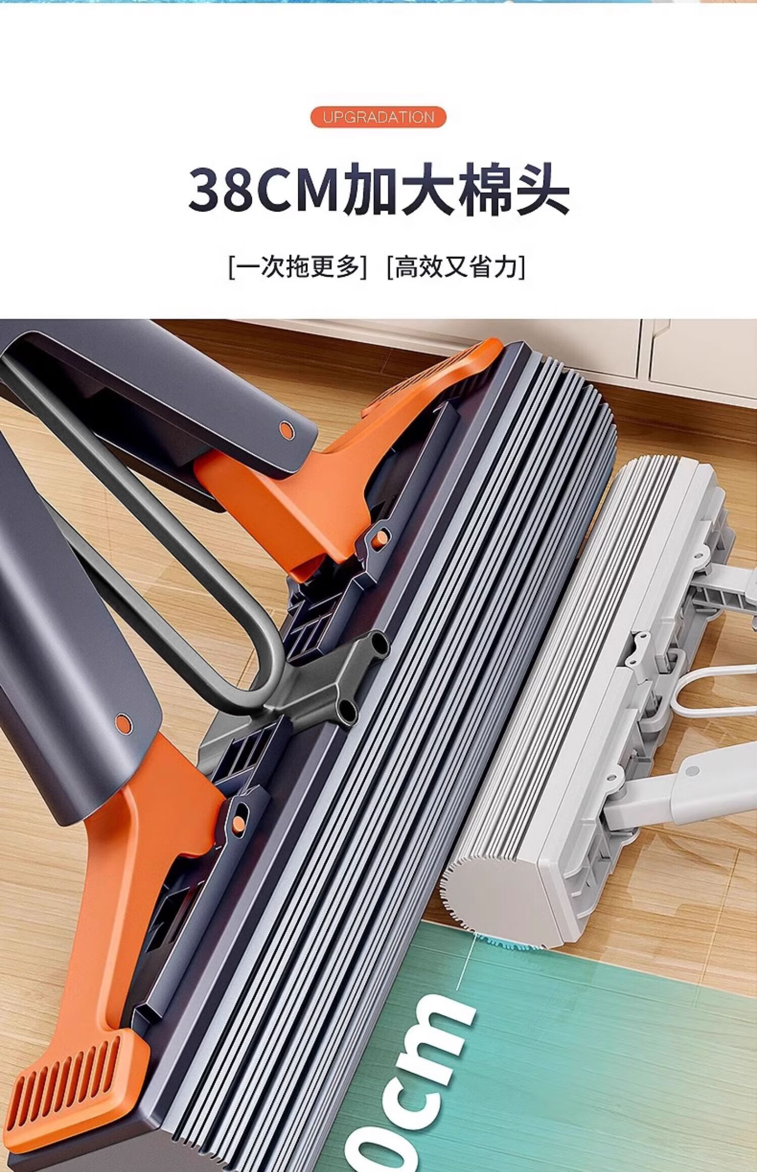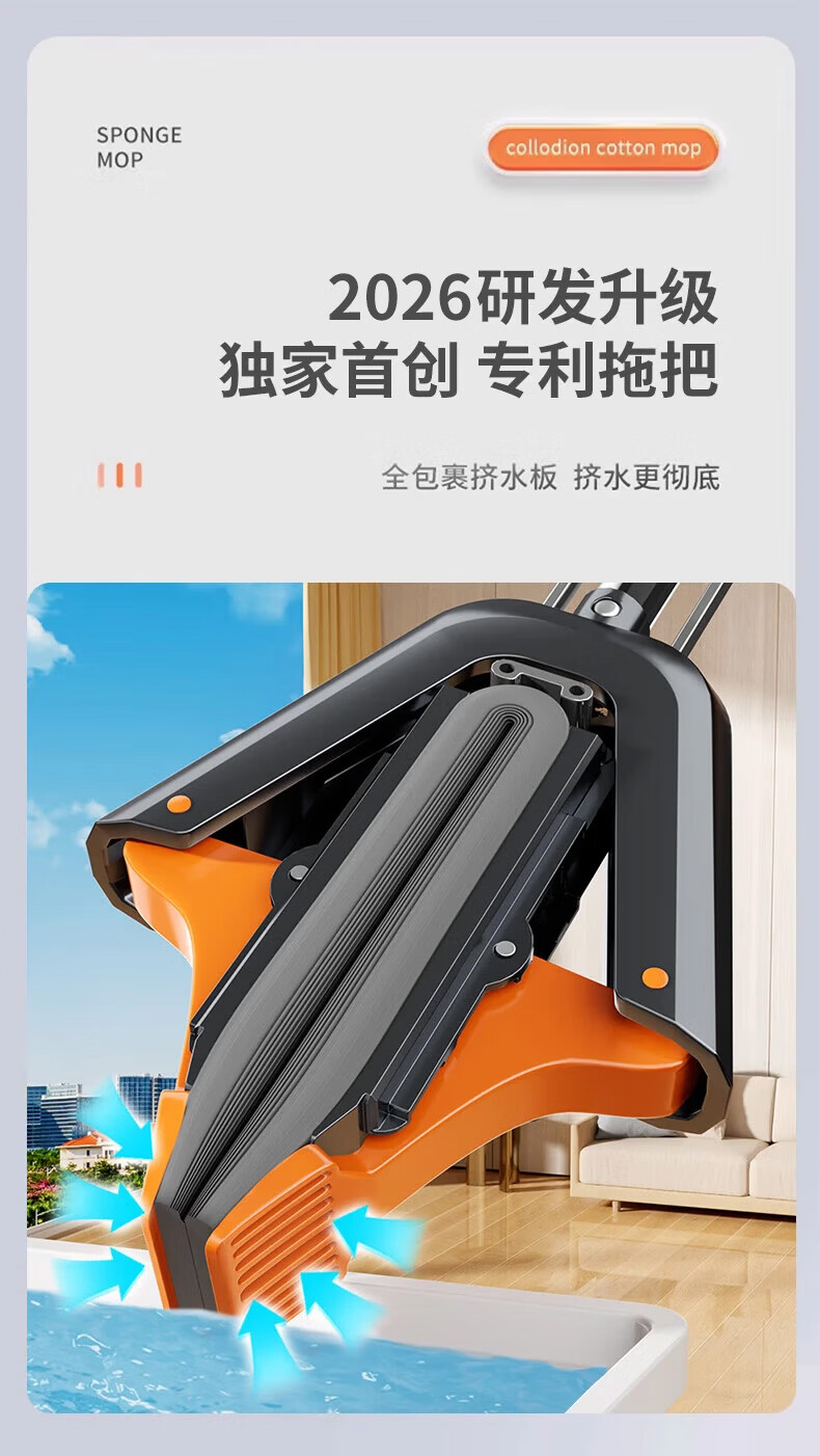 佳帮手海绵拖把2026新款双飞翼家用一拖净干湿两用吸水免手洗胶棉头拖布 38cm拖把+2块棉头+不锈钢加强杆