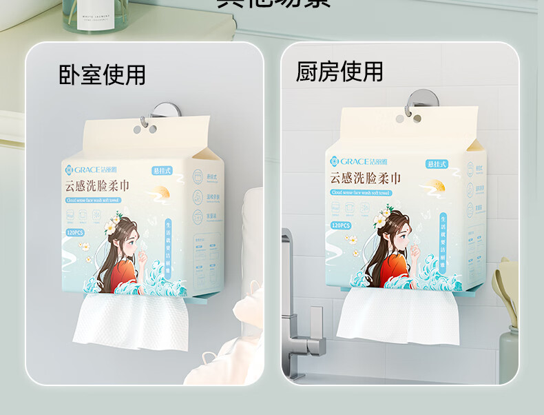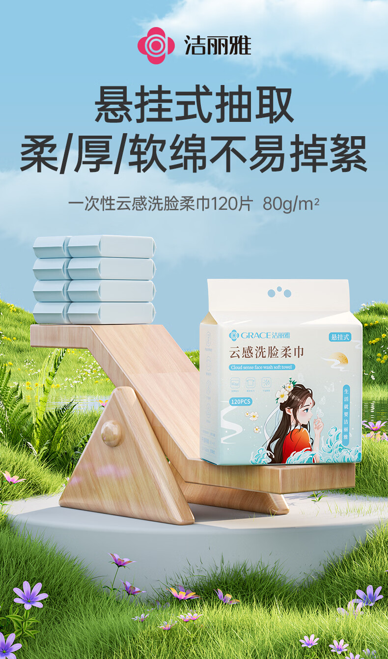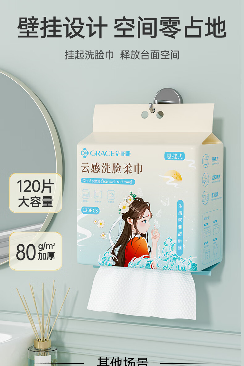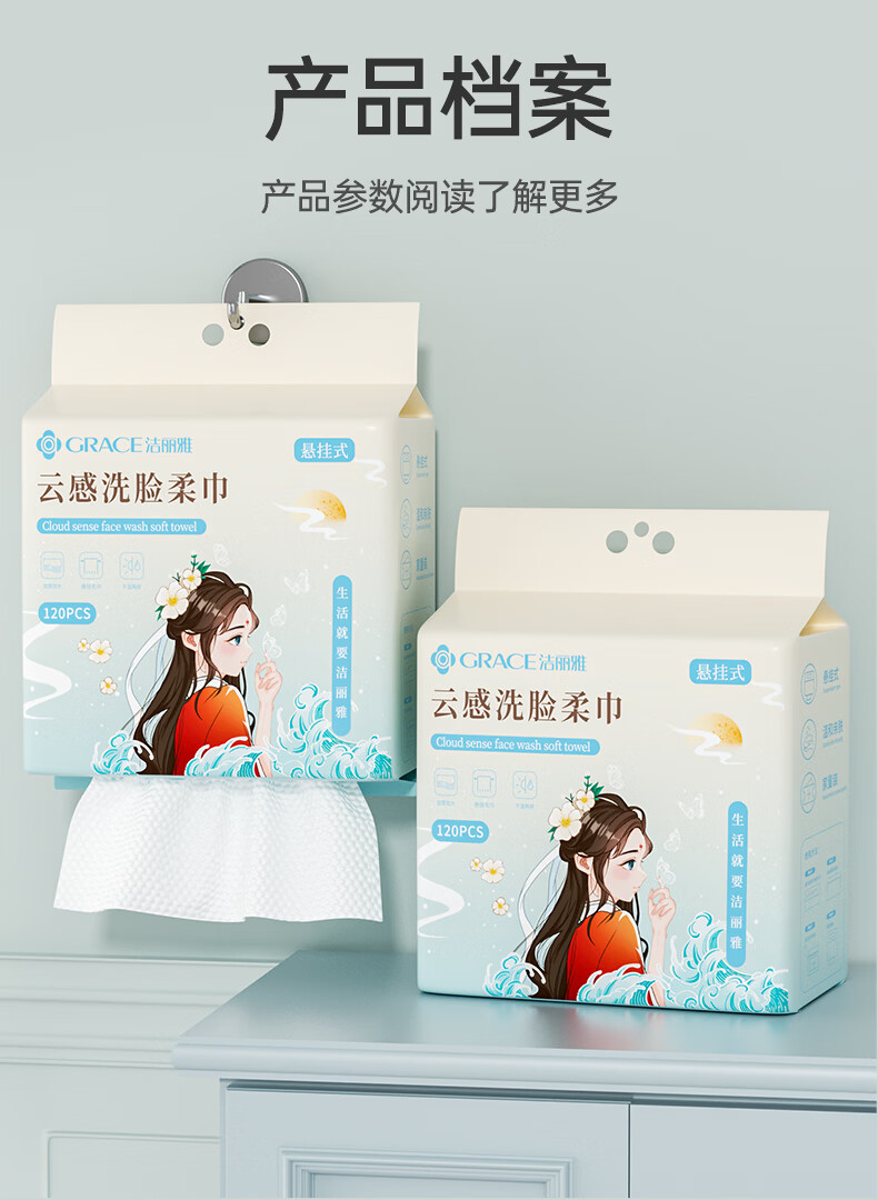 洁丽雅(Grace)洗脸巾120抽*2提悬挂式加厚国风擦脸一次性洁面巾小毛巾