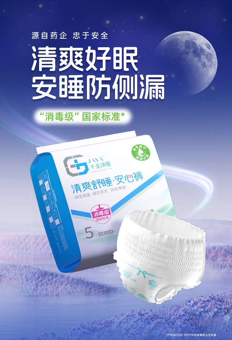千金净雅清爽舒睡纯棉透气裤型卫生巾XL码*5片*1包京东自营安睡裤安心裤
