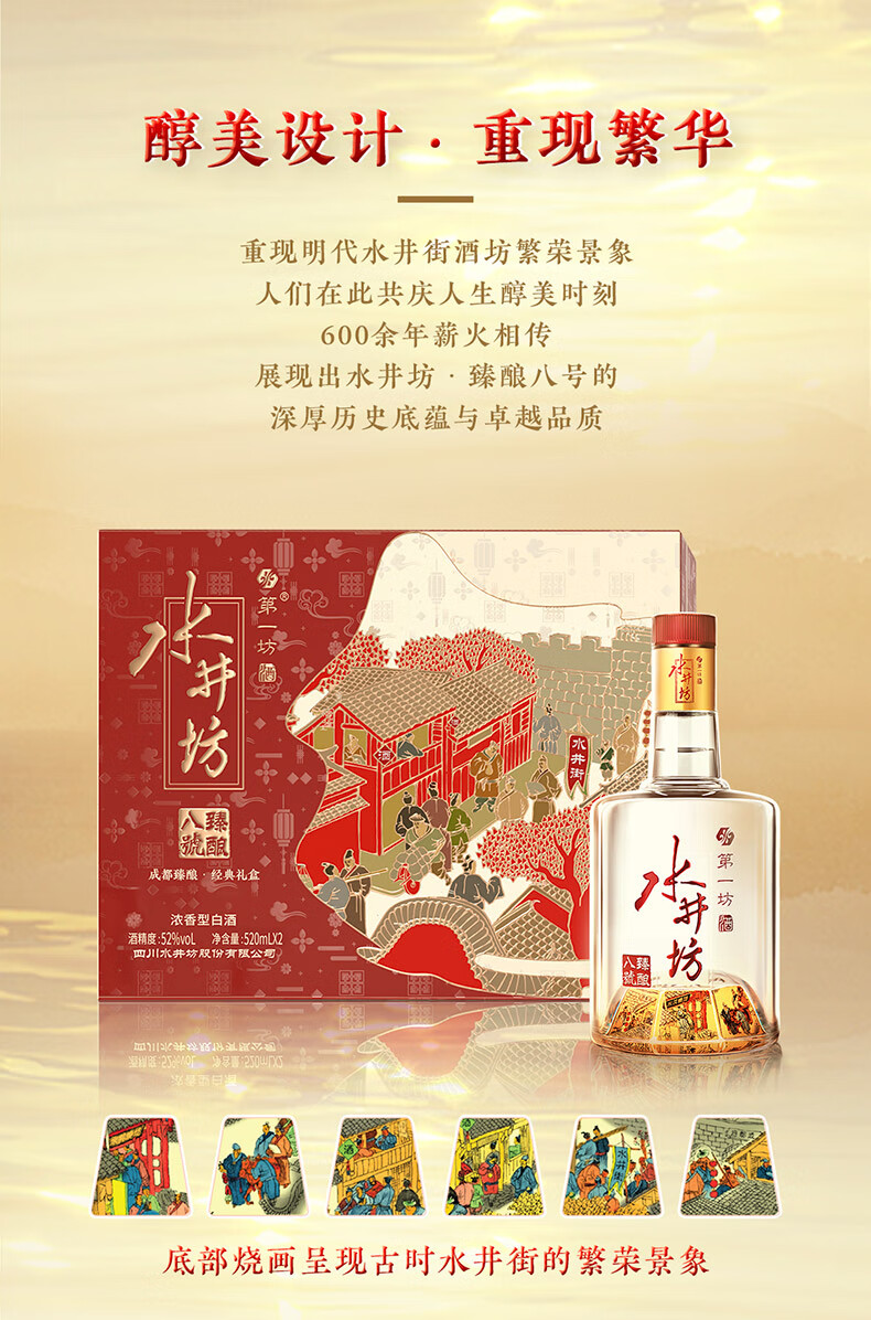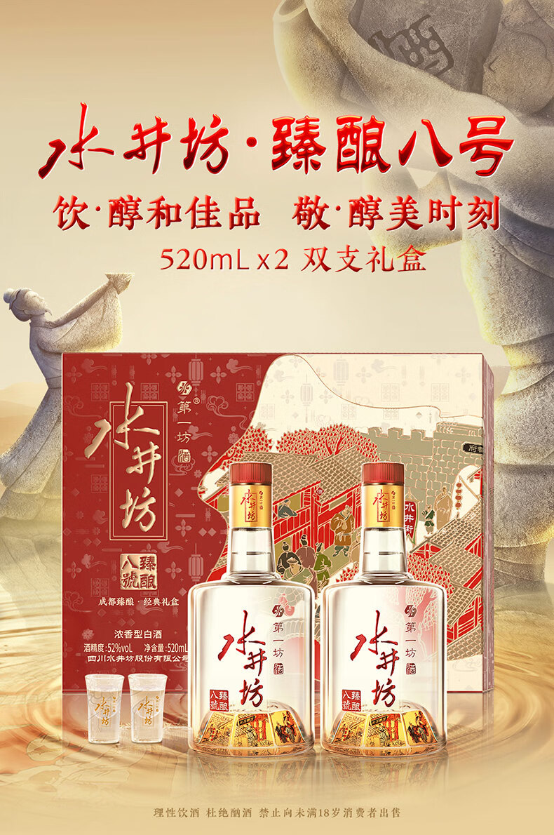 水井坊 臻酿八号 浓香型白酒 52度 520mL 2瓶 *3礼盒 整箱装