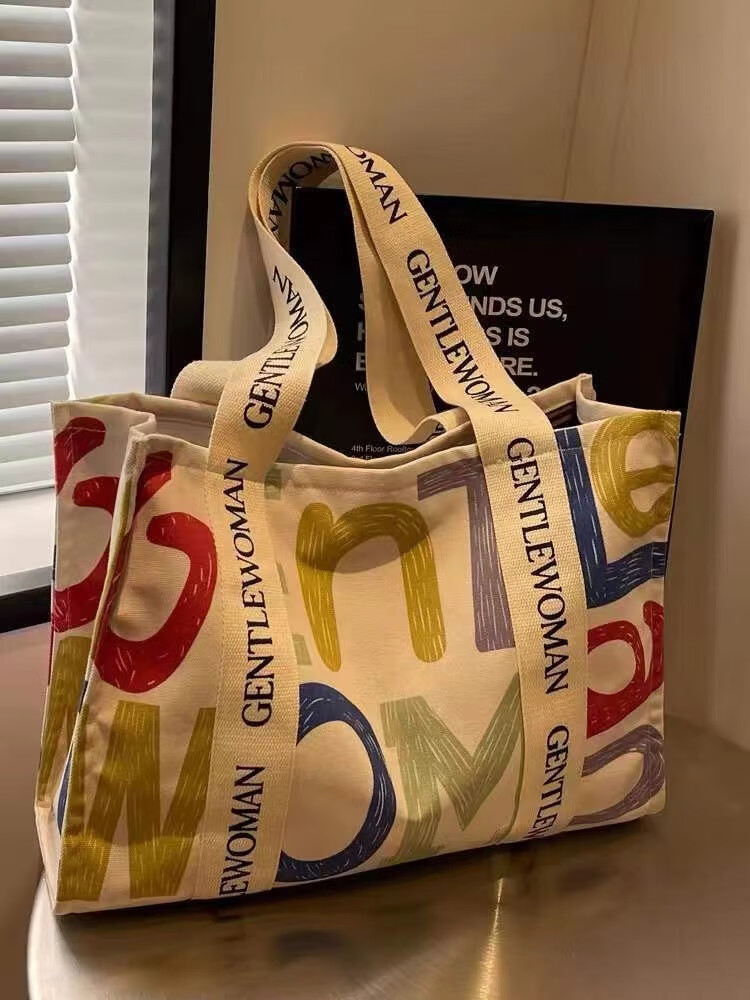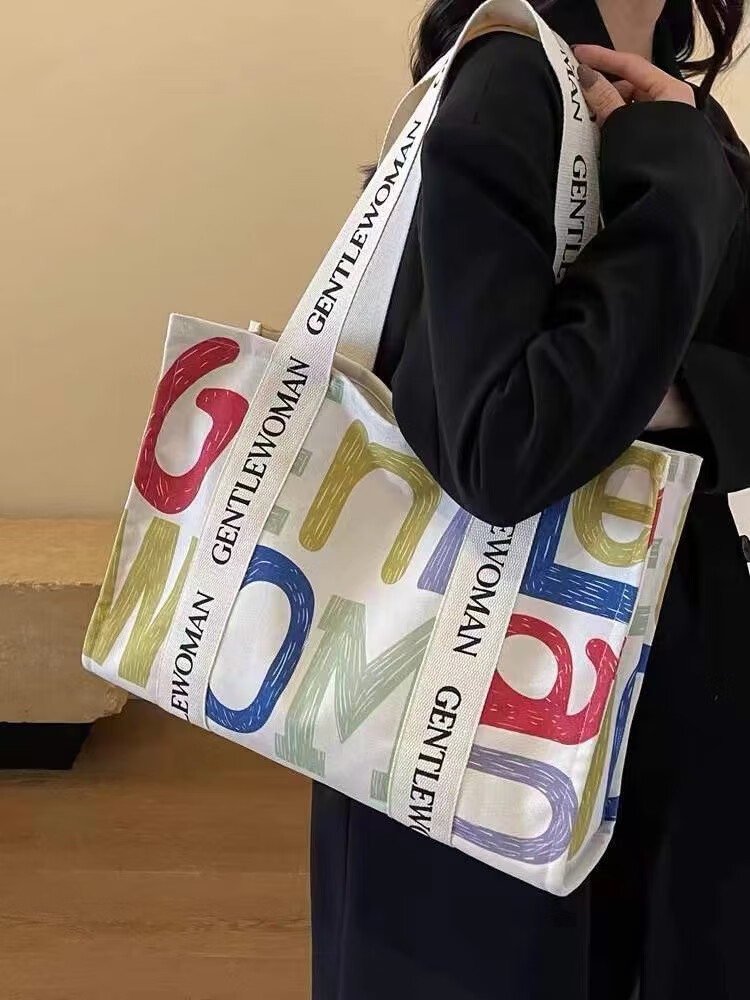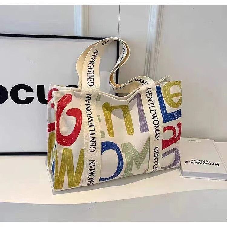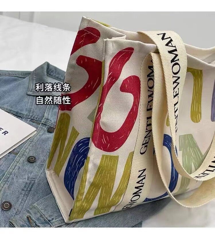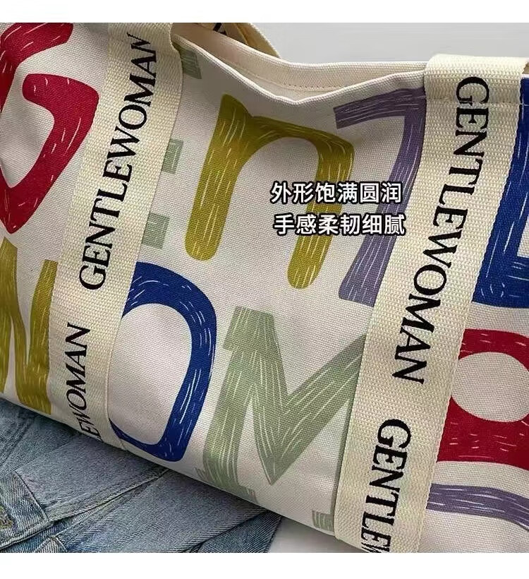 大容量帆布包女秋季外出短途旅行包休闲上班通勤托特包手提购物袋 彩字母 大包