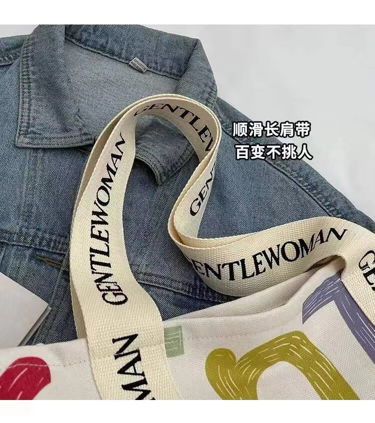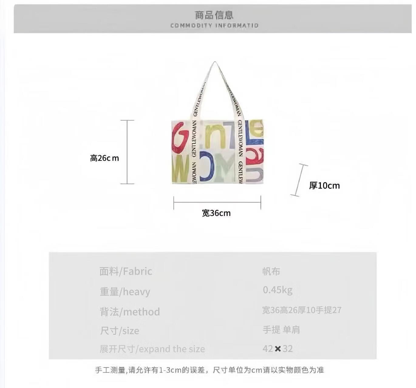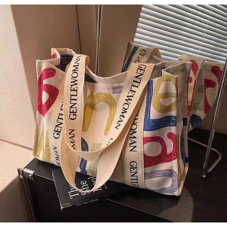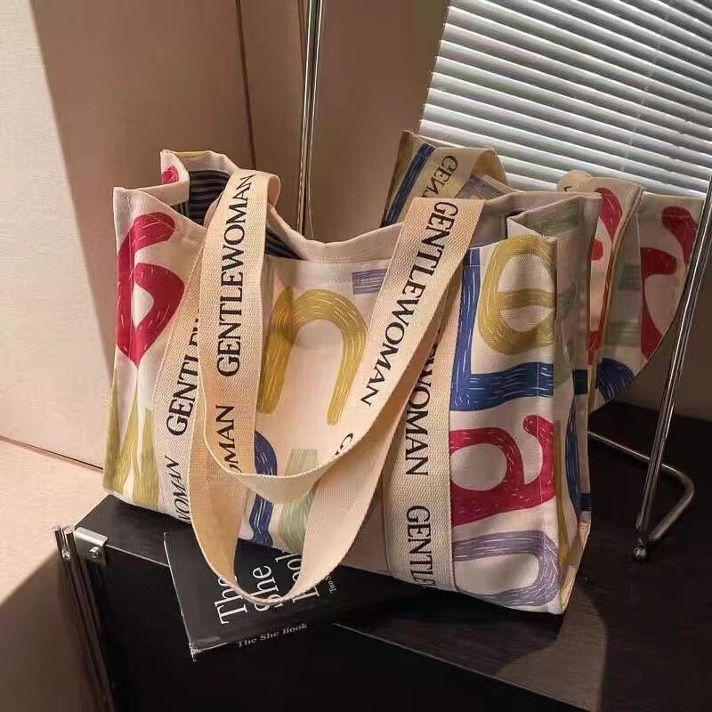 大容量帆布包女秋季外出短途旅行包休闲上班通勤托特包手提购物袋 彩字母 大包