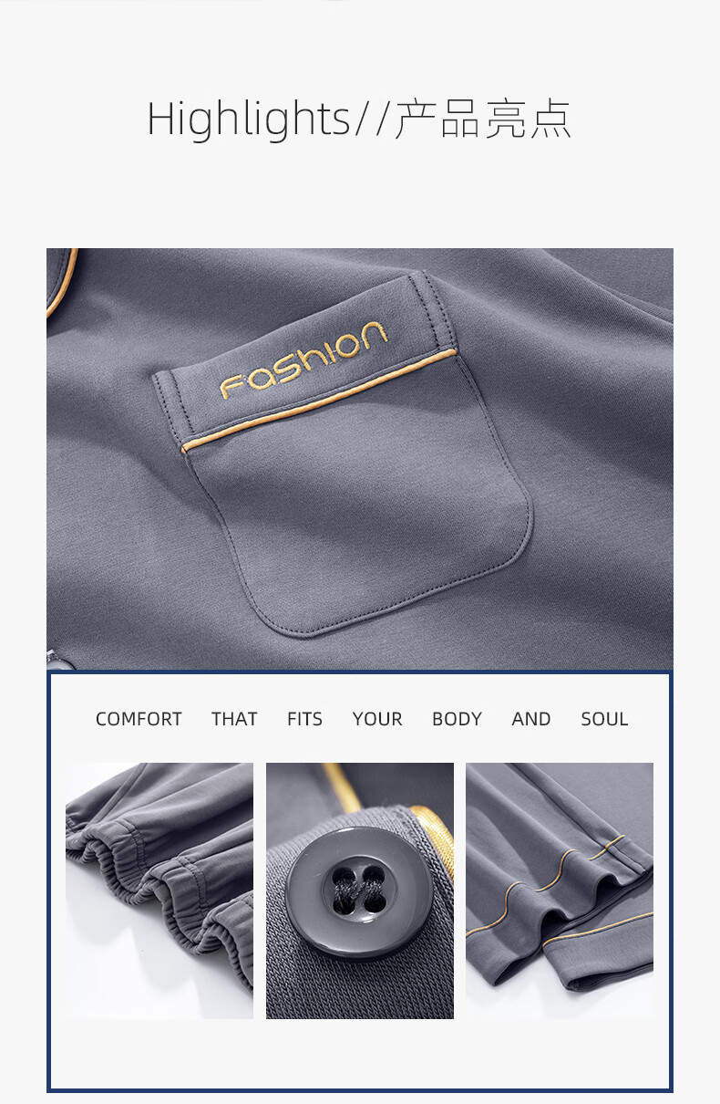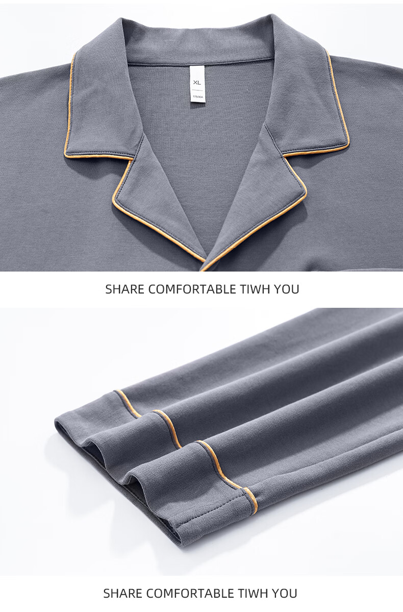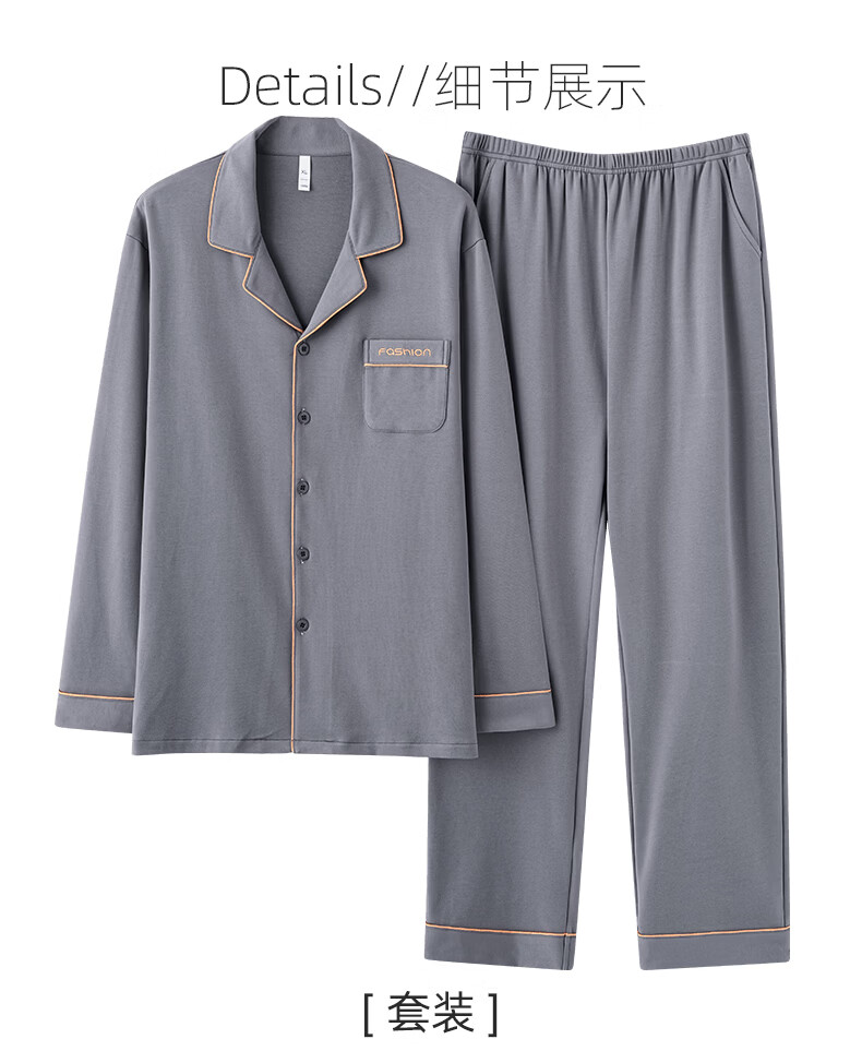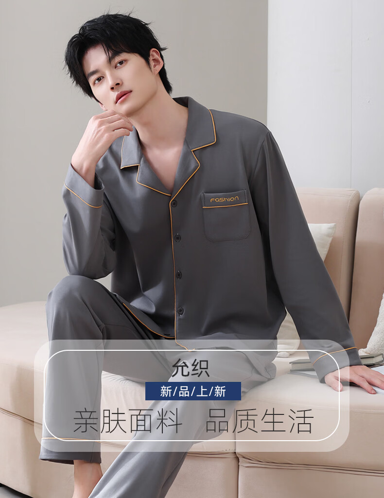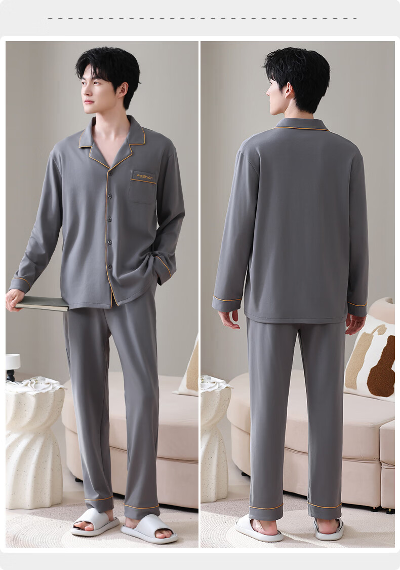 允织莱卡棉睡衣男士春秋季纯棉长袖套装2026年新款男款开衫家居服休闲 8705-灰色 L (170) :建议100-135斤穿着