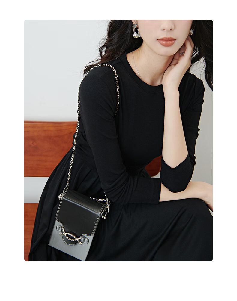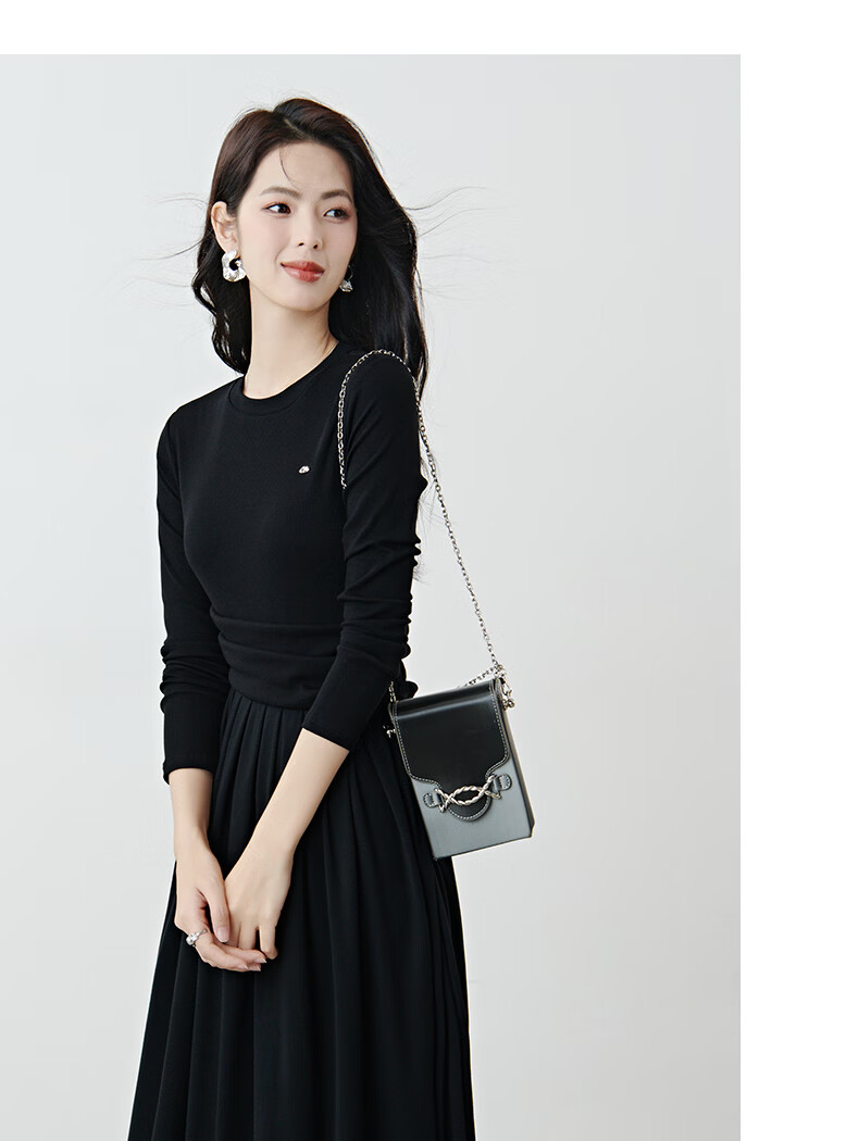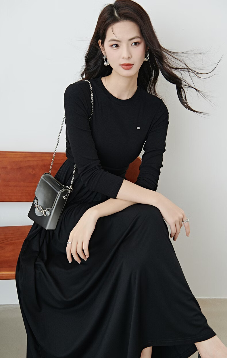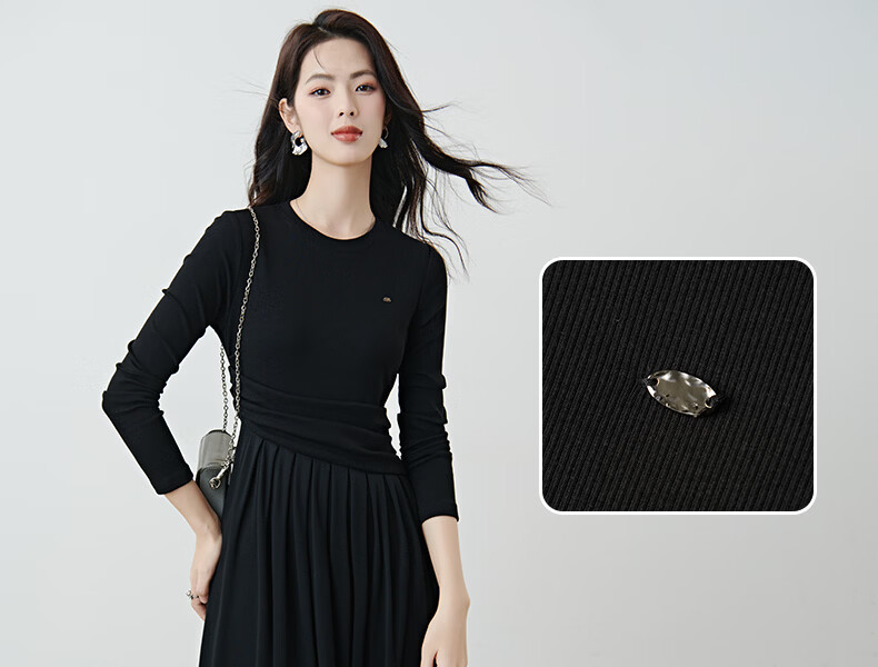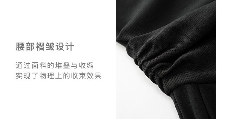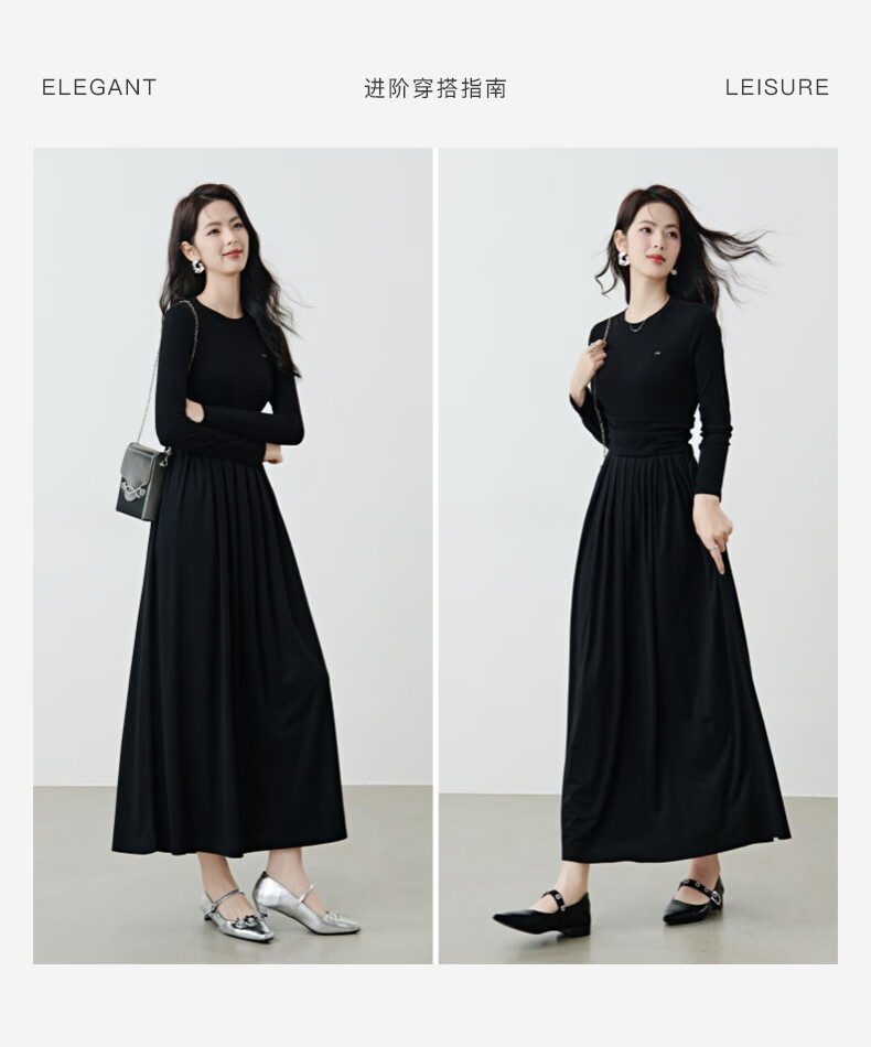 晚白【加长版】2026春气质假两件赫本风小黑裙高温压褶收腰显瘦连衣裙 黑色 L 建议158cm以上拍