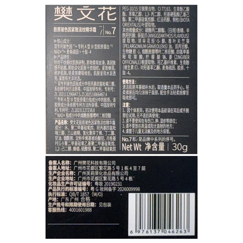 樊文花7号胶原玻色因紧致淡纹精华霜50%玻色因抗皱保湿舒缓修护面霜女生 30g