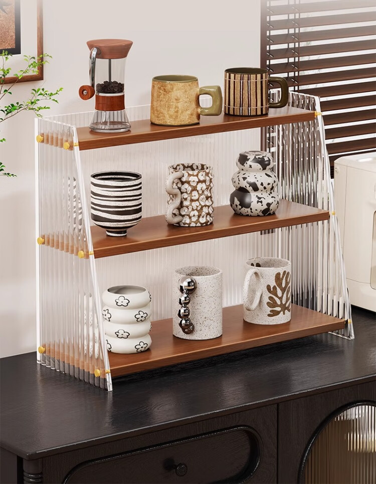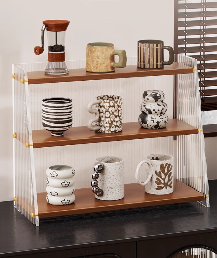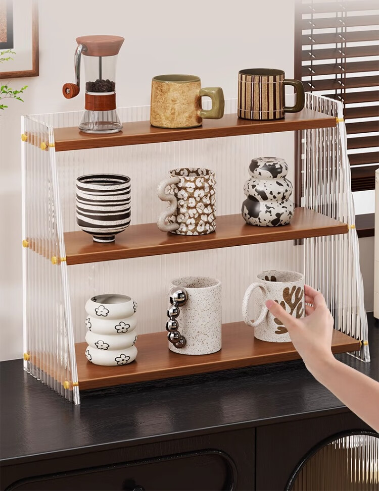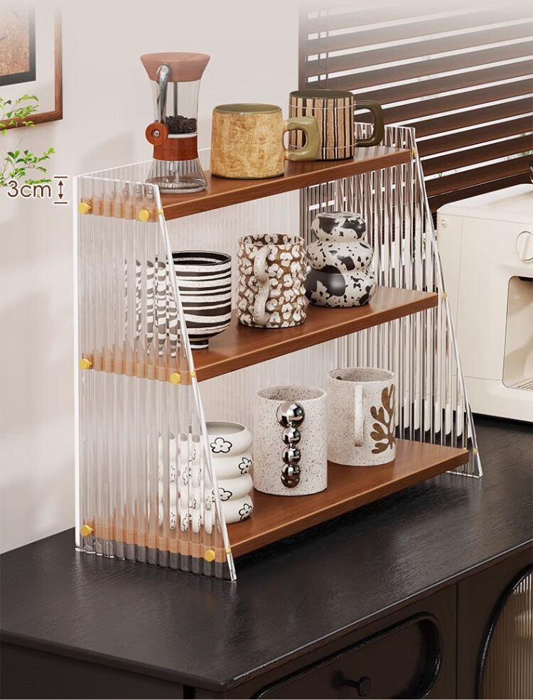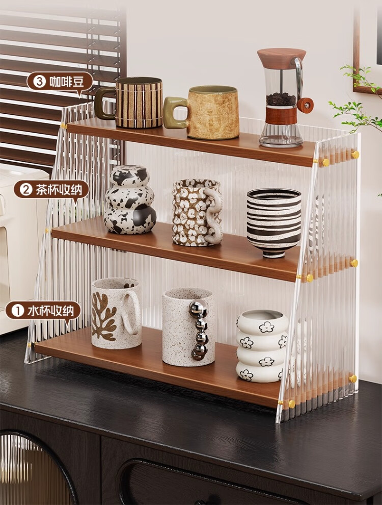 尔思家厨房置物架桌面多层茶具收纳架台面杯子收纳柜多功能台置式储物架 海棠色36cm【进口实木】
