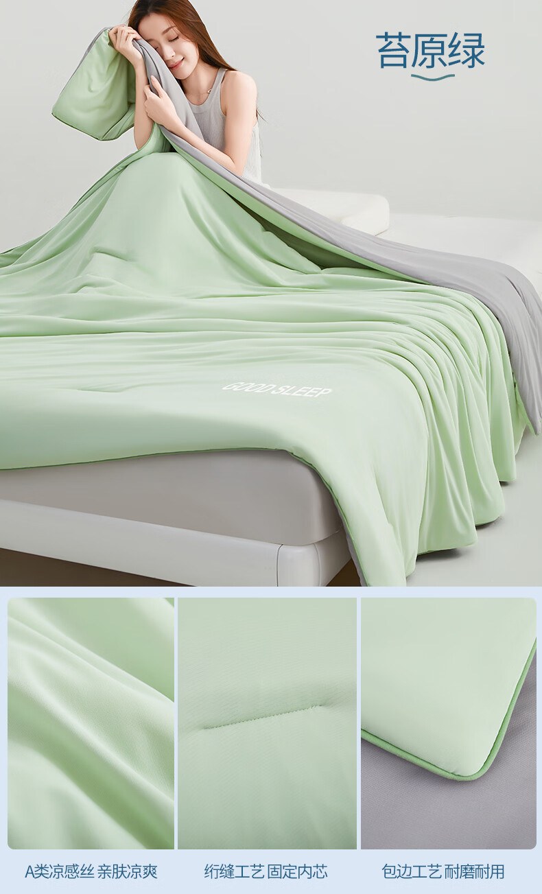 苏萱2026新款热卖水洗冰丝夏被四件套夏季夏凉被空调被可机水洗单双人 亚丁绿+冰川灰 单人夏被-150*200cm
