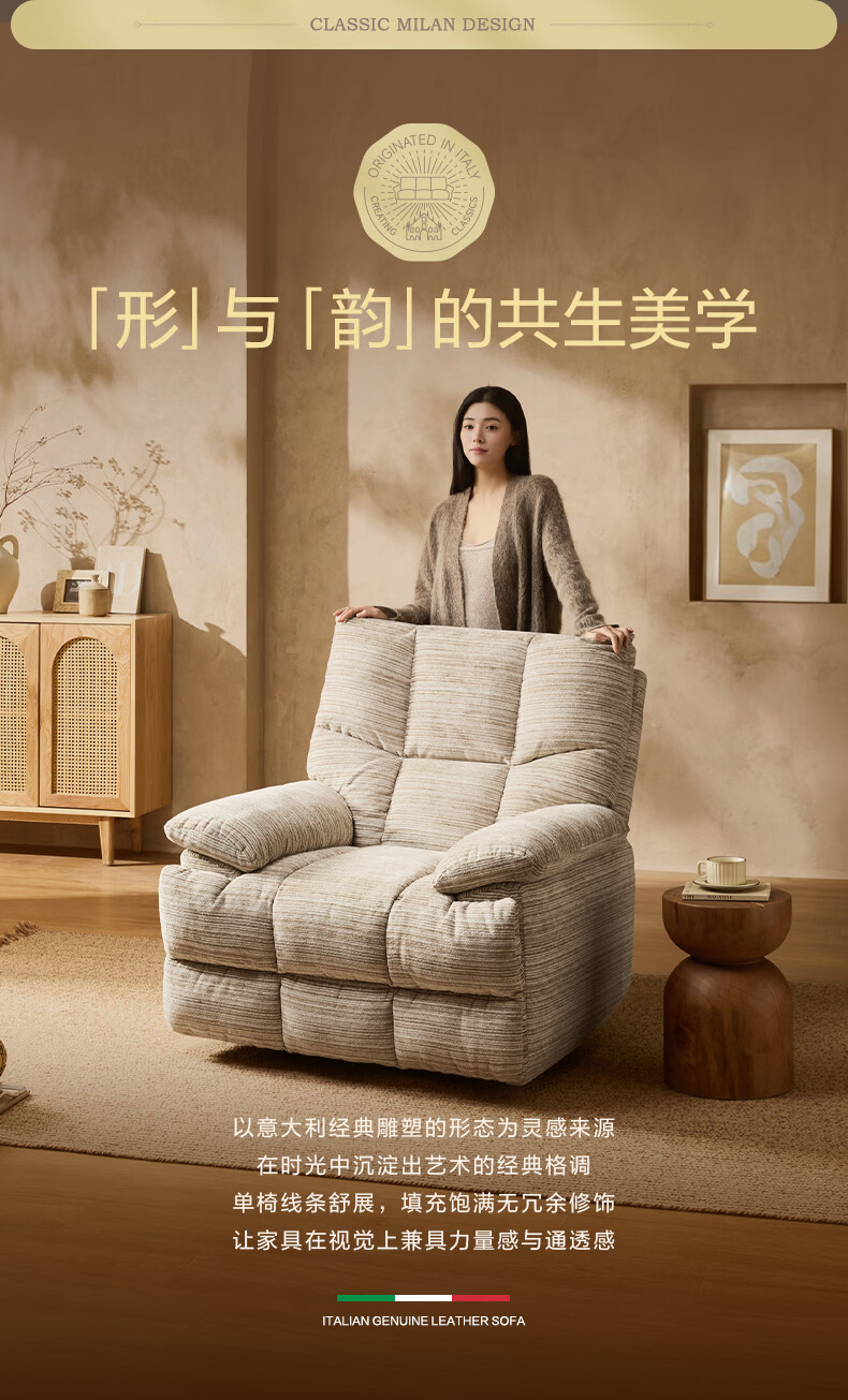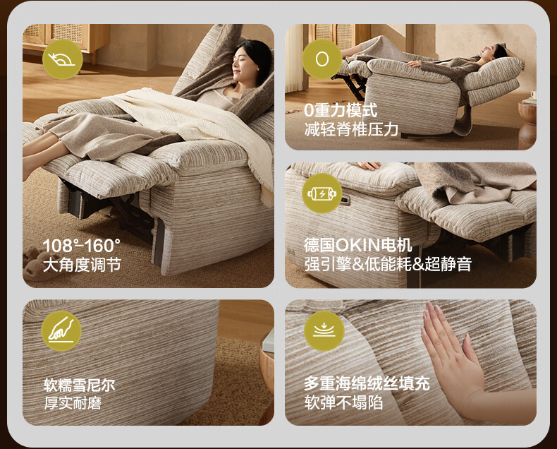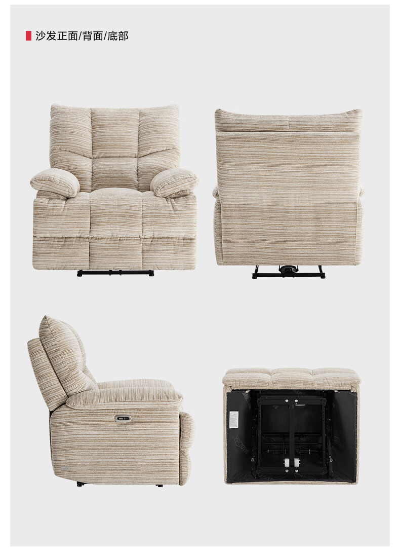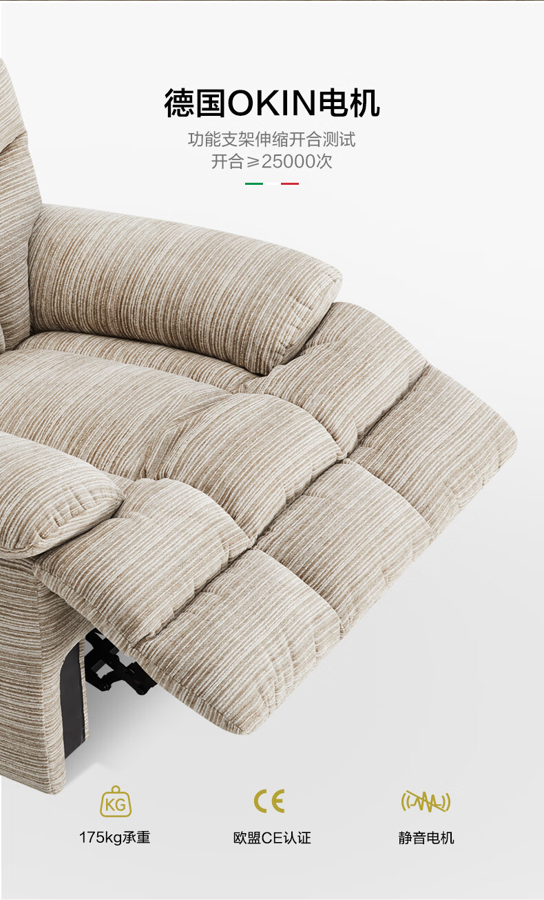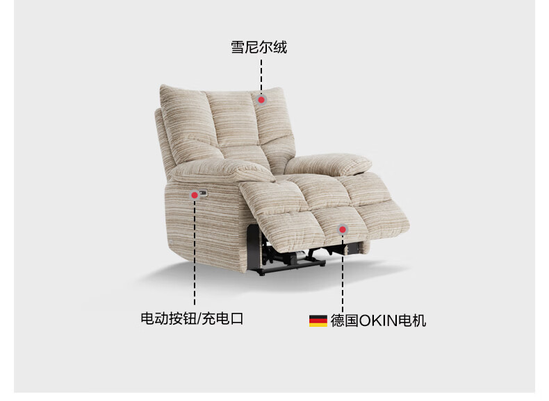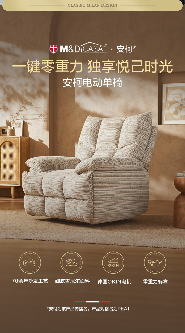 M&D CASA安柯电动功能单人沙发零重力躺椅客厅2026新款布艺雪尼尔休闲椅 石纹米棕|雪尼尔|电动单椅