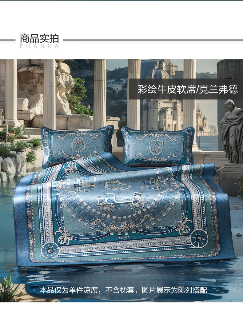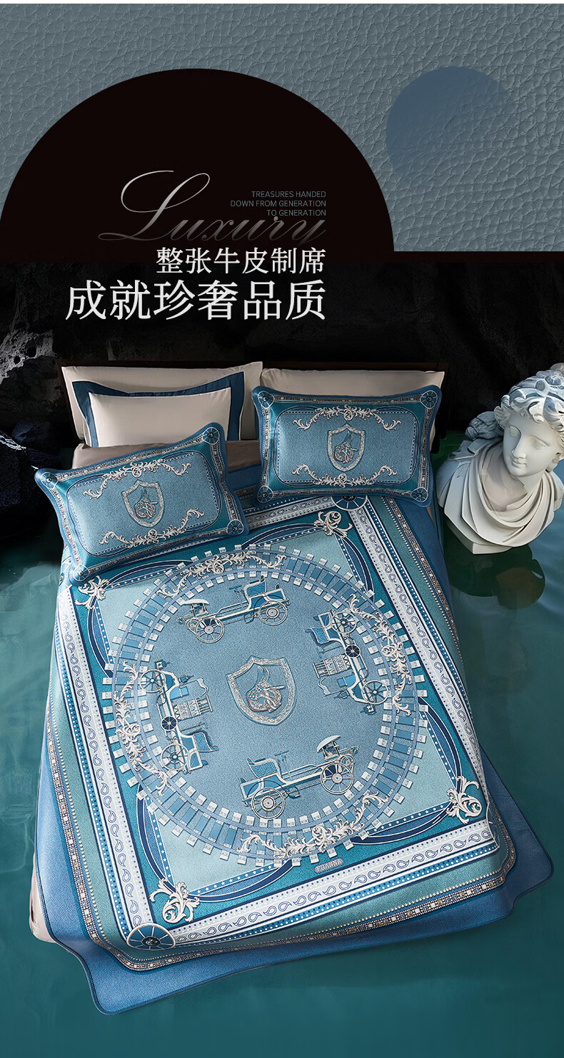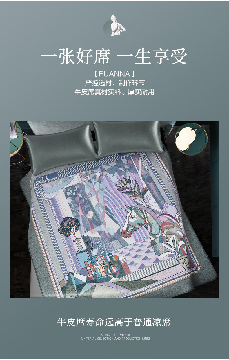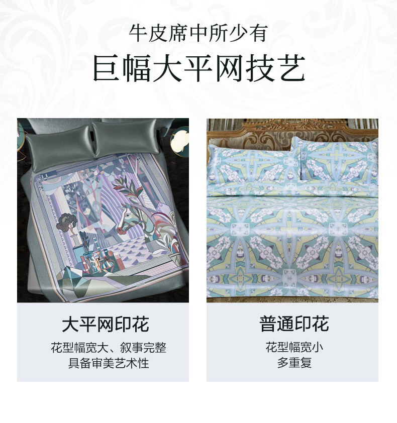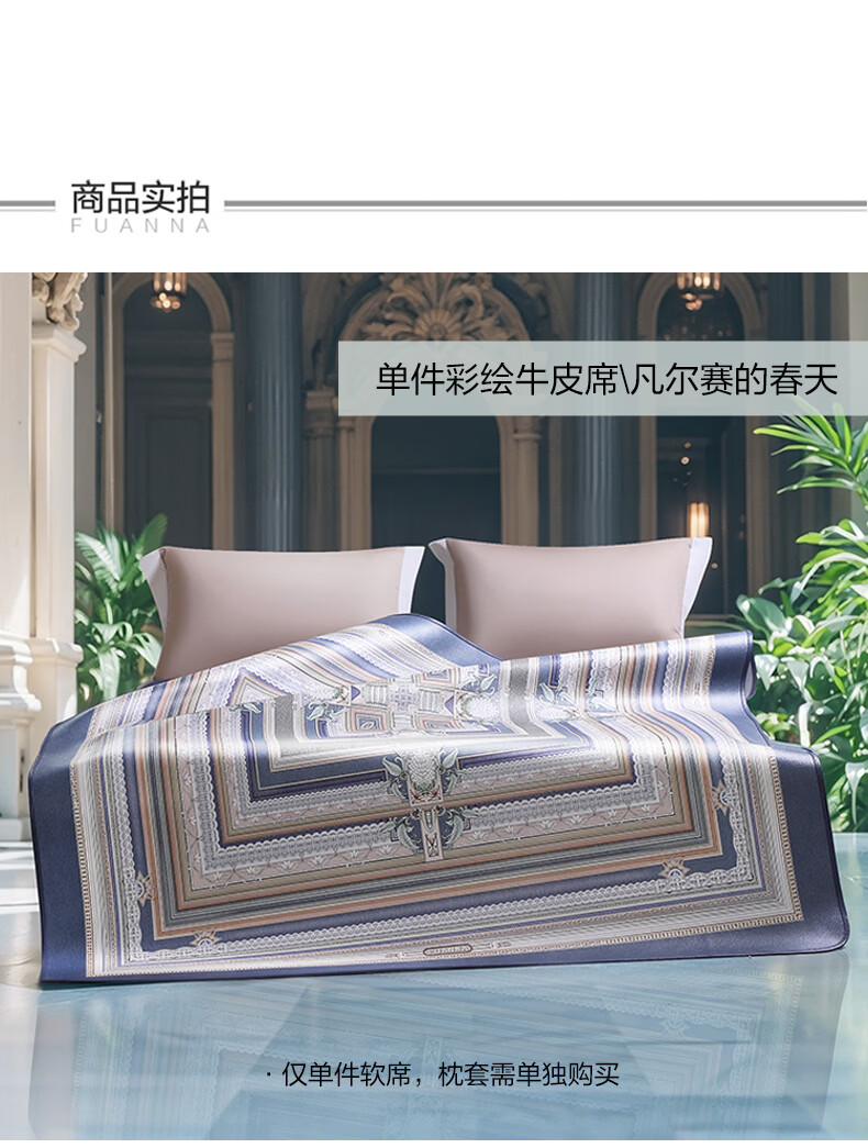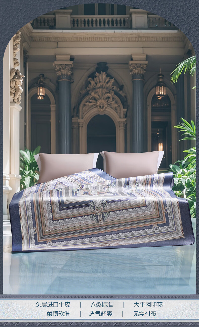 富安娜 独幅平网印花 头层牛皮 高端牛皮席双人凉席 头层水牛皮-庄园【单席】 1.5米床 200cm*150cm