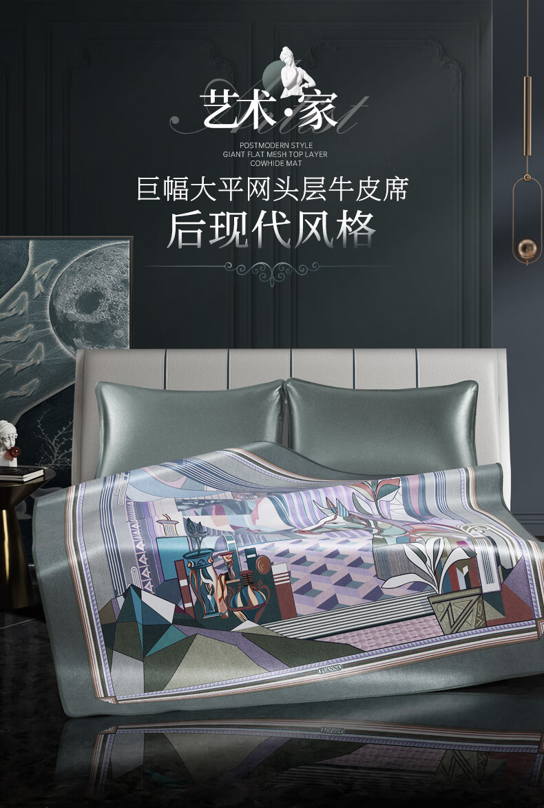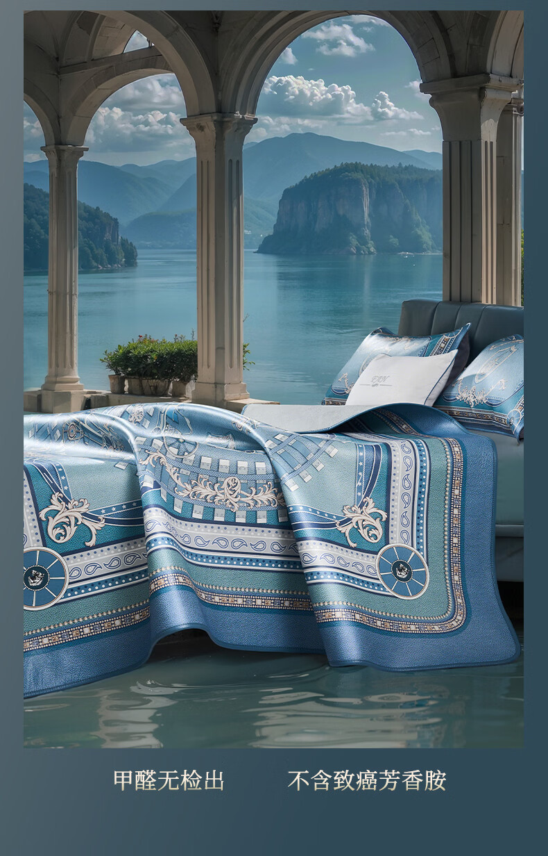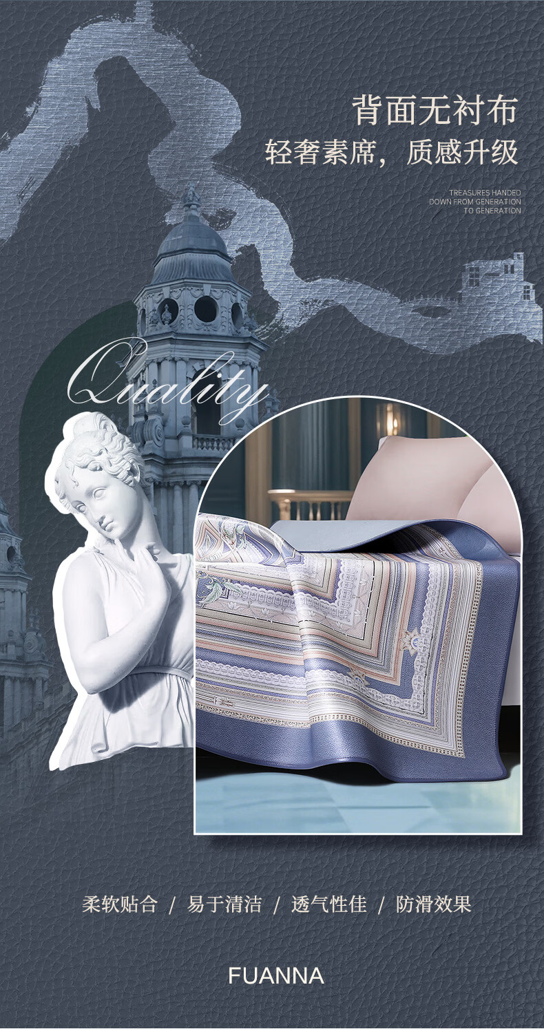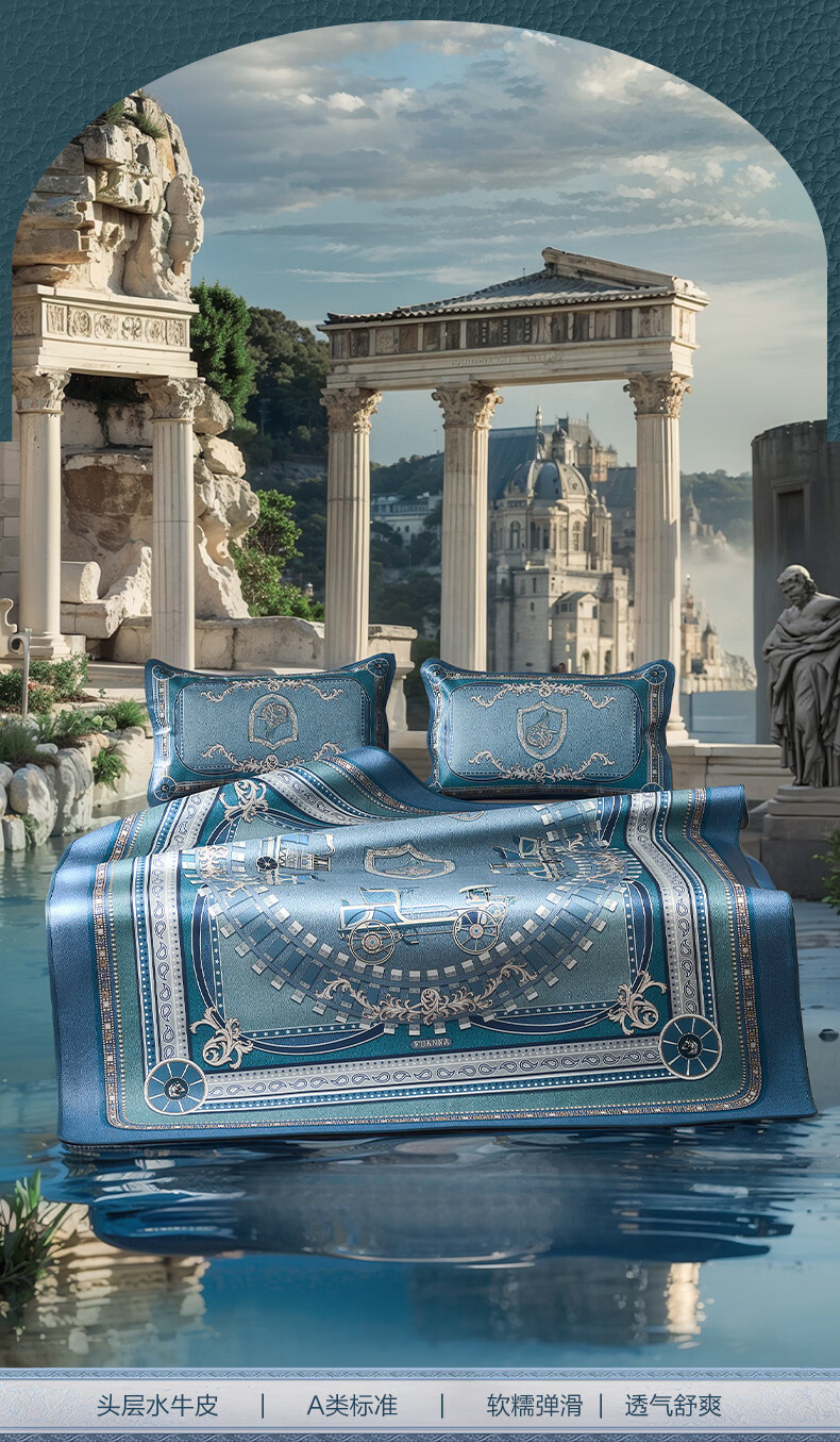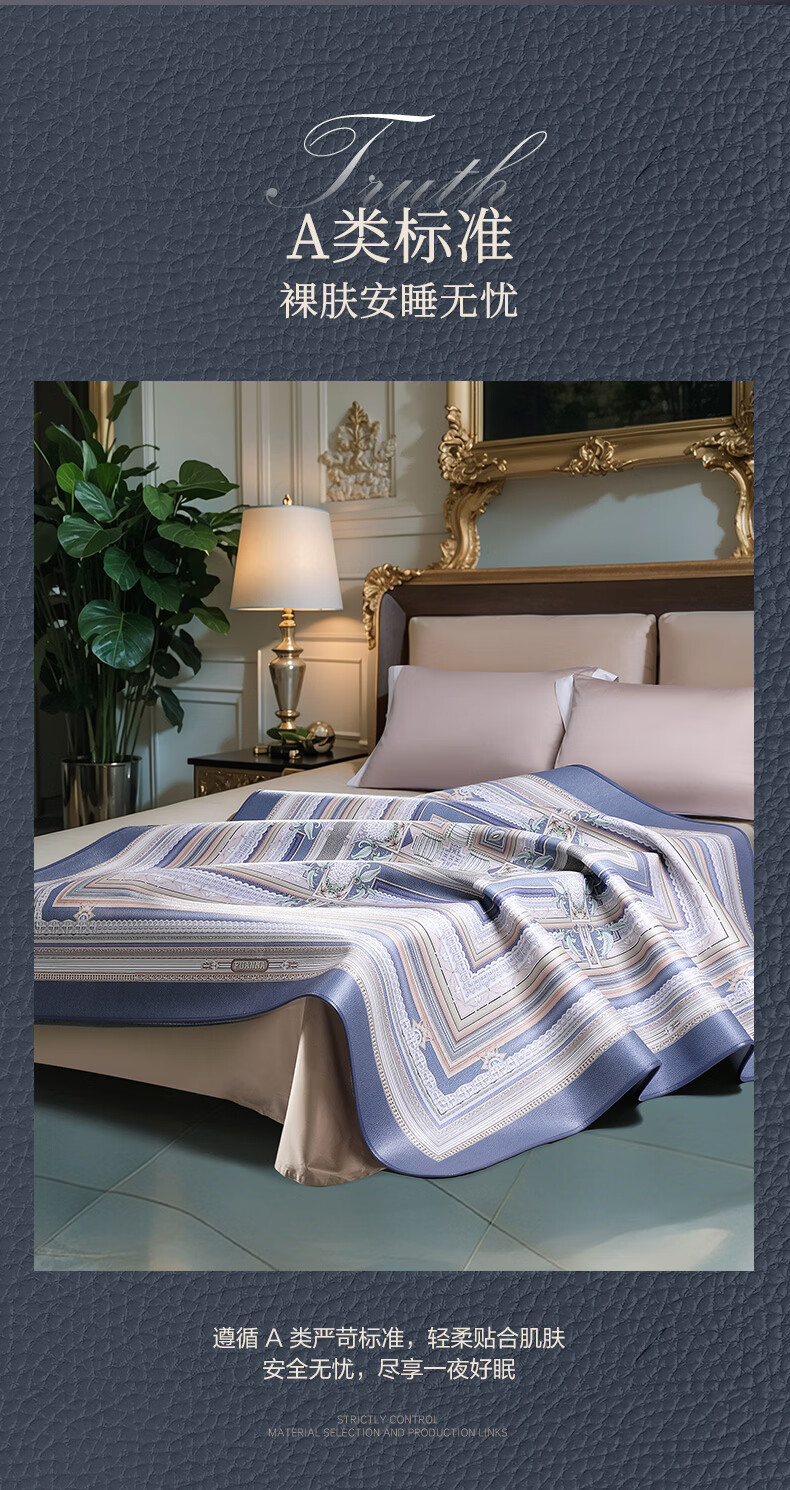 富安娜 独幅平网印花 头层牛皮 高端牛皮席双人凉席 头层水牛皮-庄园【单席】 1.5米床 200cm*150cm