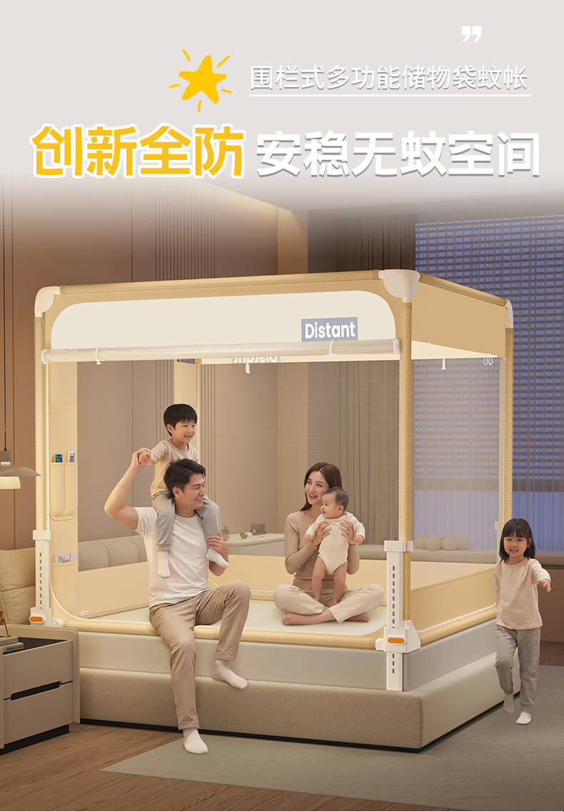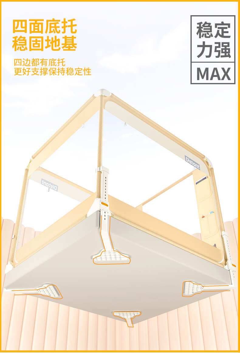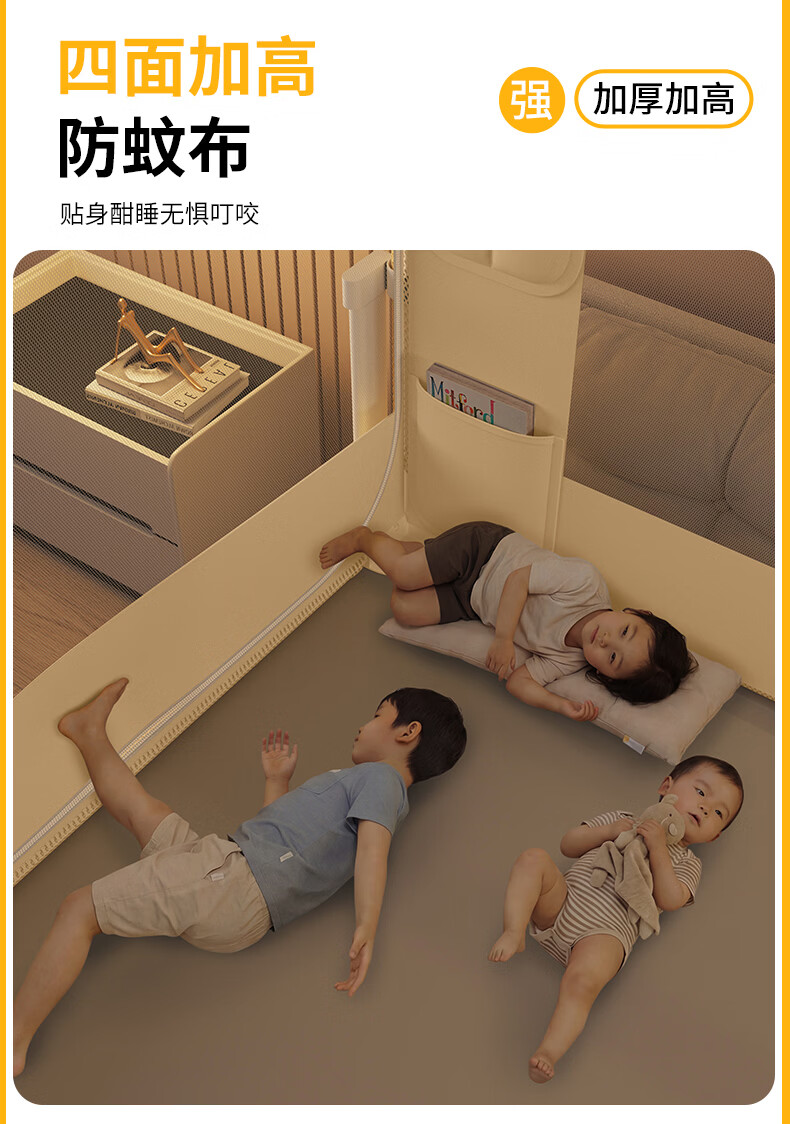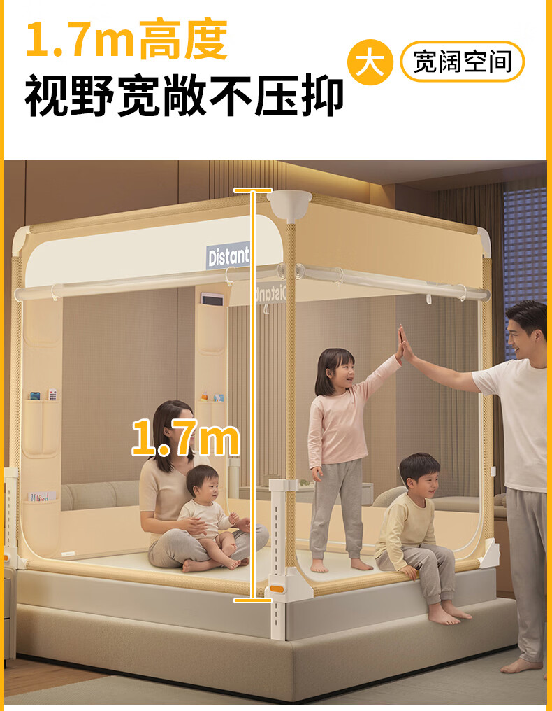 无印良品婴儿防摔蚊帐1.5米x2米免安装家用卧室全底宝宝防掉床围栏三开门 夏末格调米【单帐纱】 1.5m床-宽150x长200x高170cm【围栏支架】
