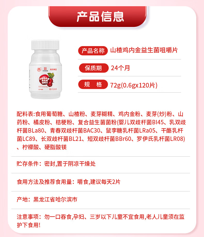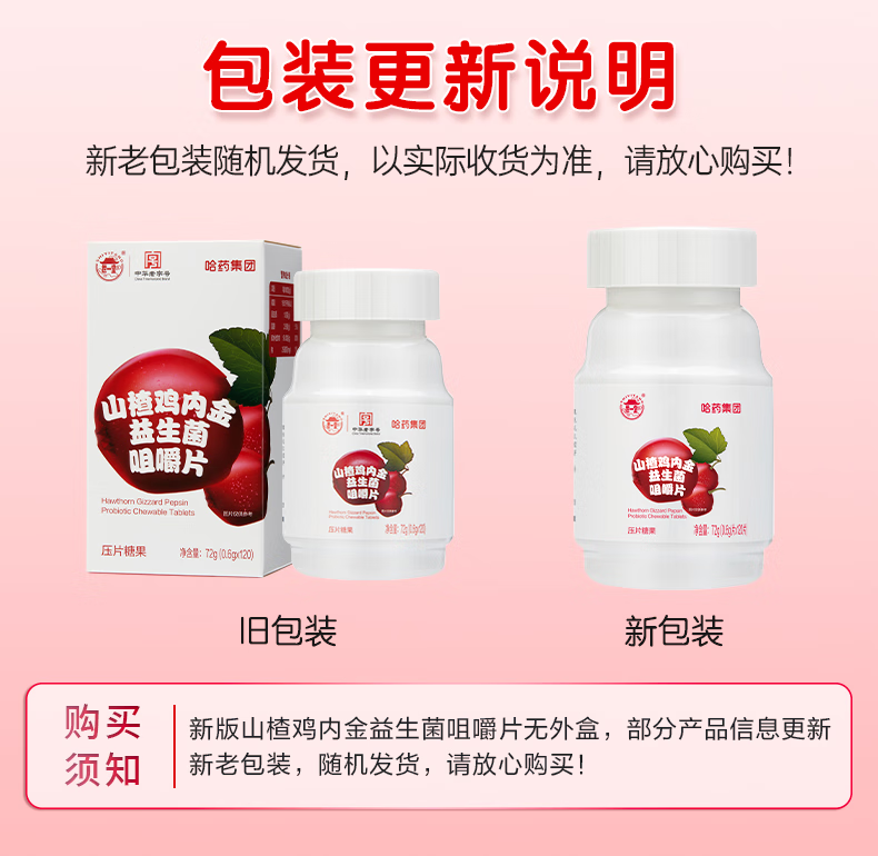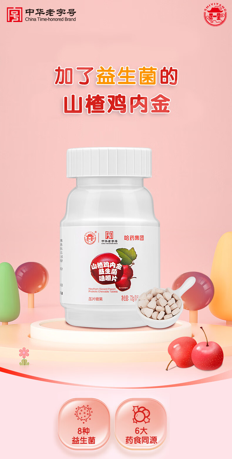 哈药 (世一堂) 山楂鸡内金益生菌压片糖果 酸甜零食山楂鸡内金咀嚼片 4瓶