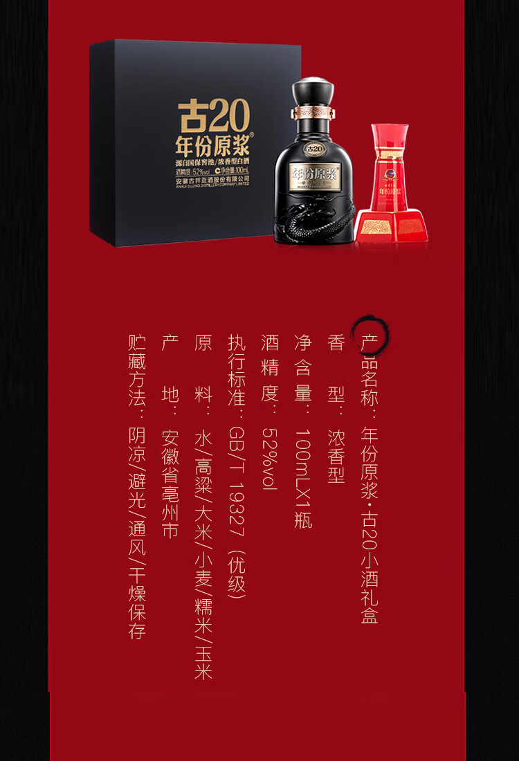 古井贡酒 年份原浆古20 浓香型白酒 52度 100mL*1瓶 礼盒装
