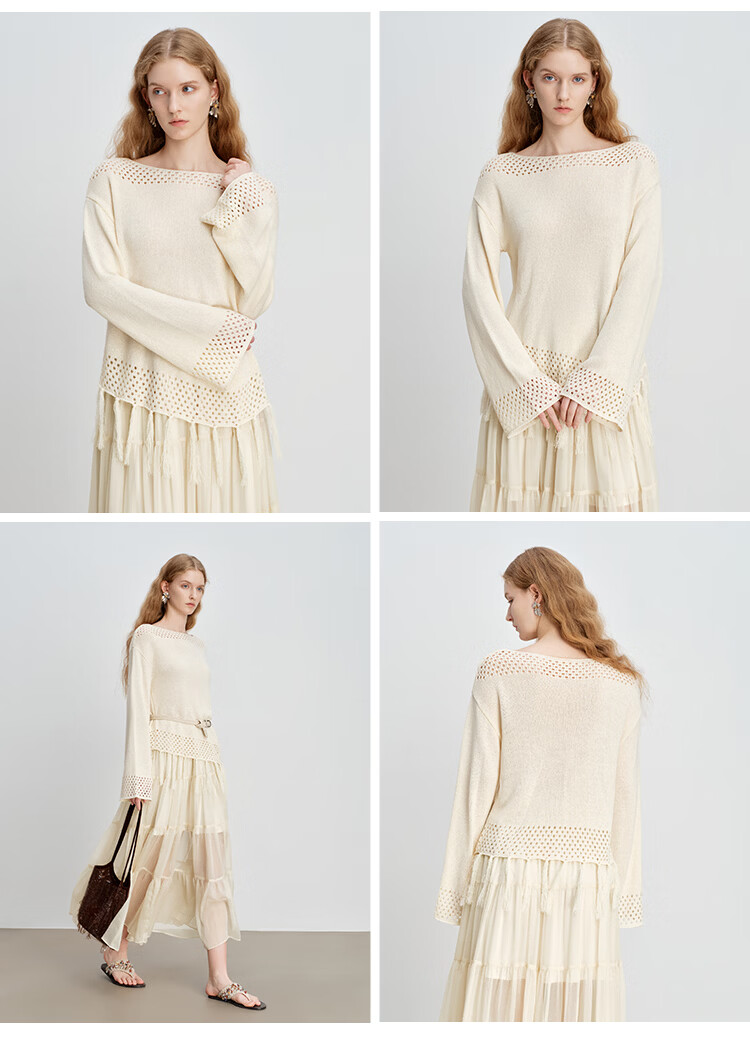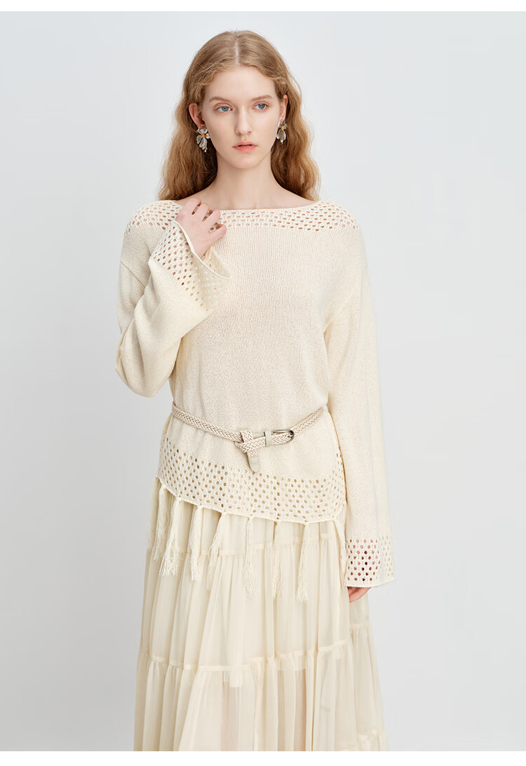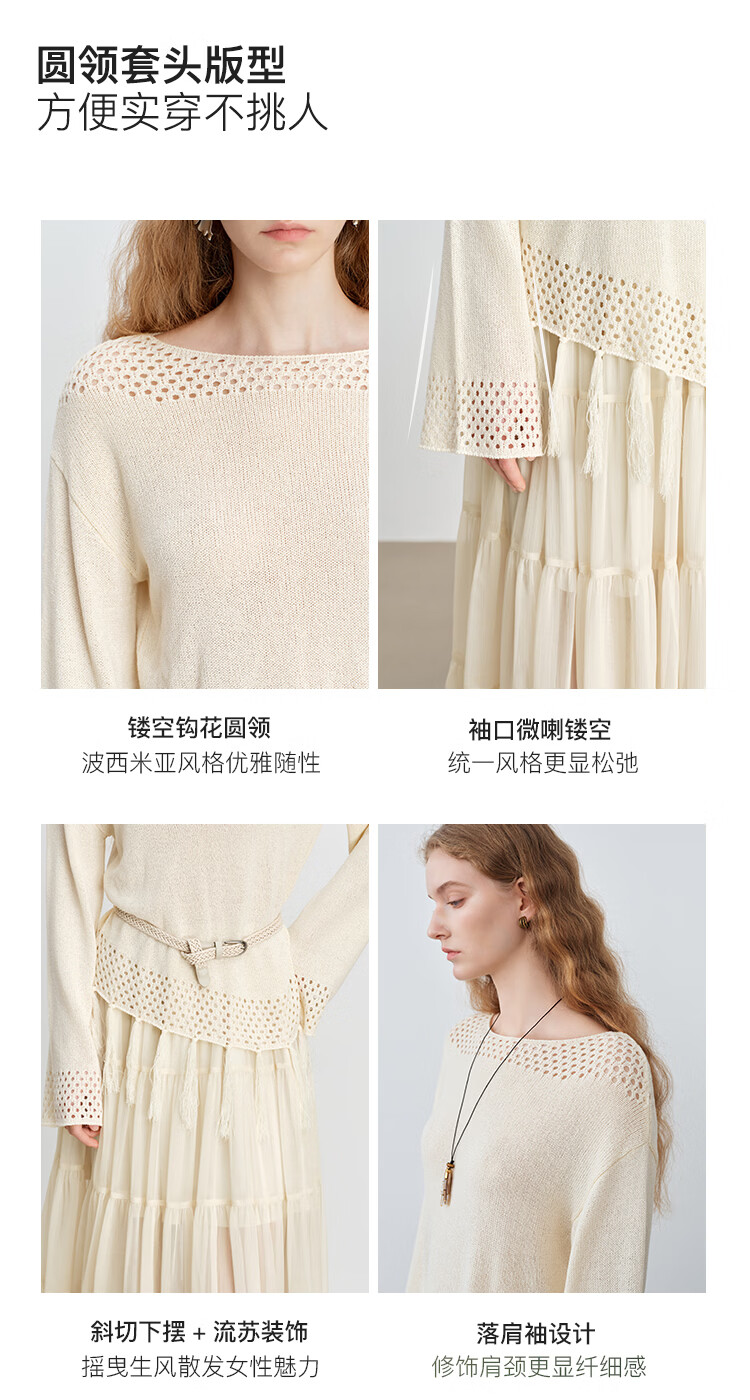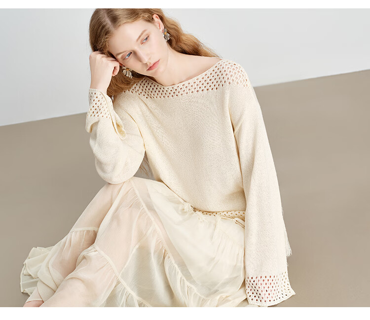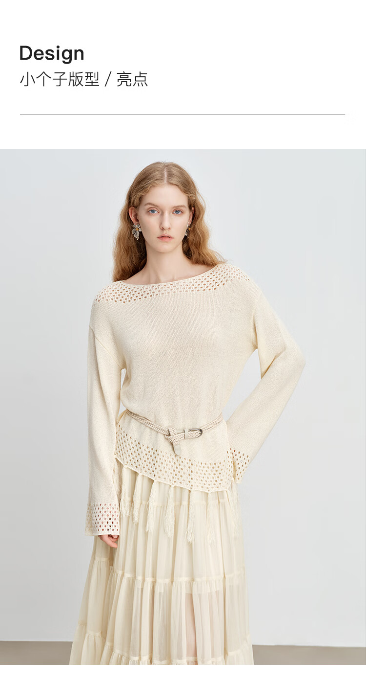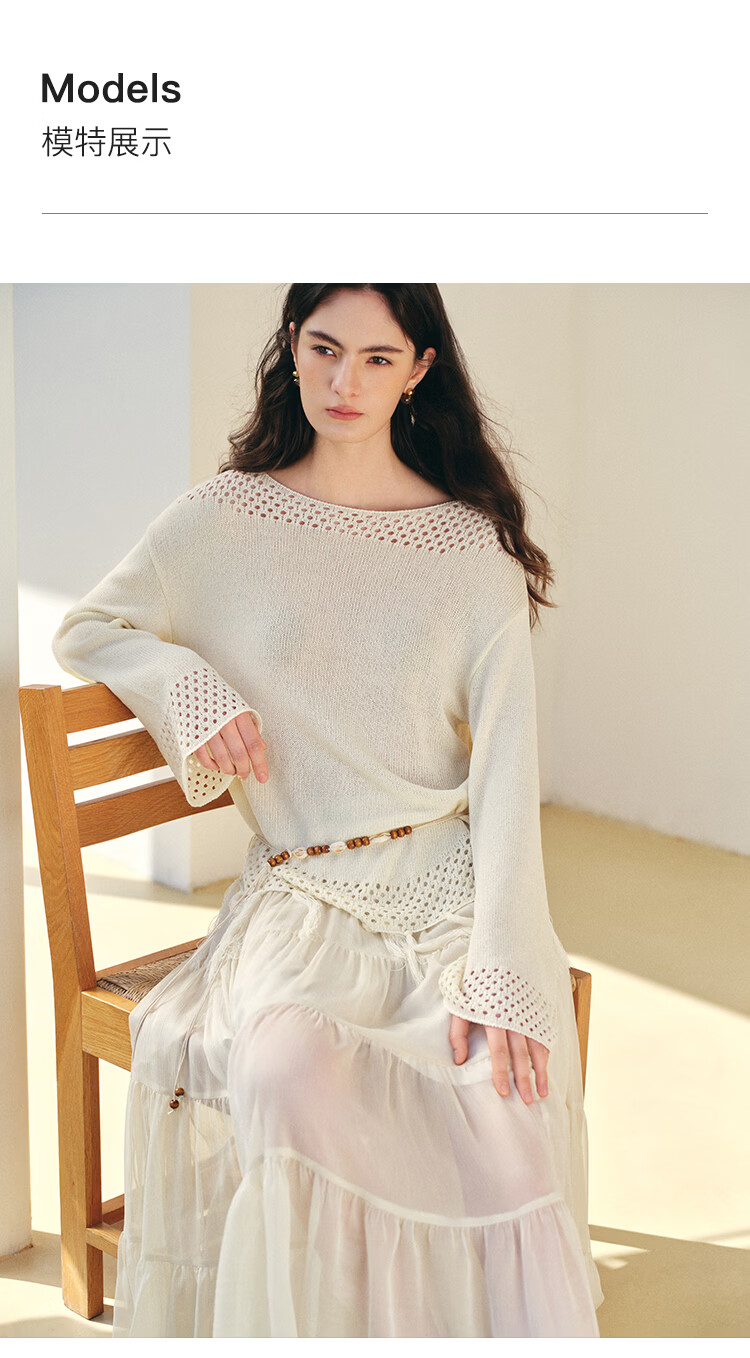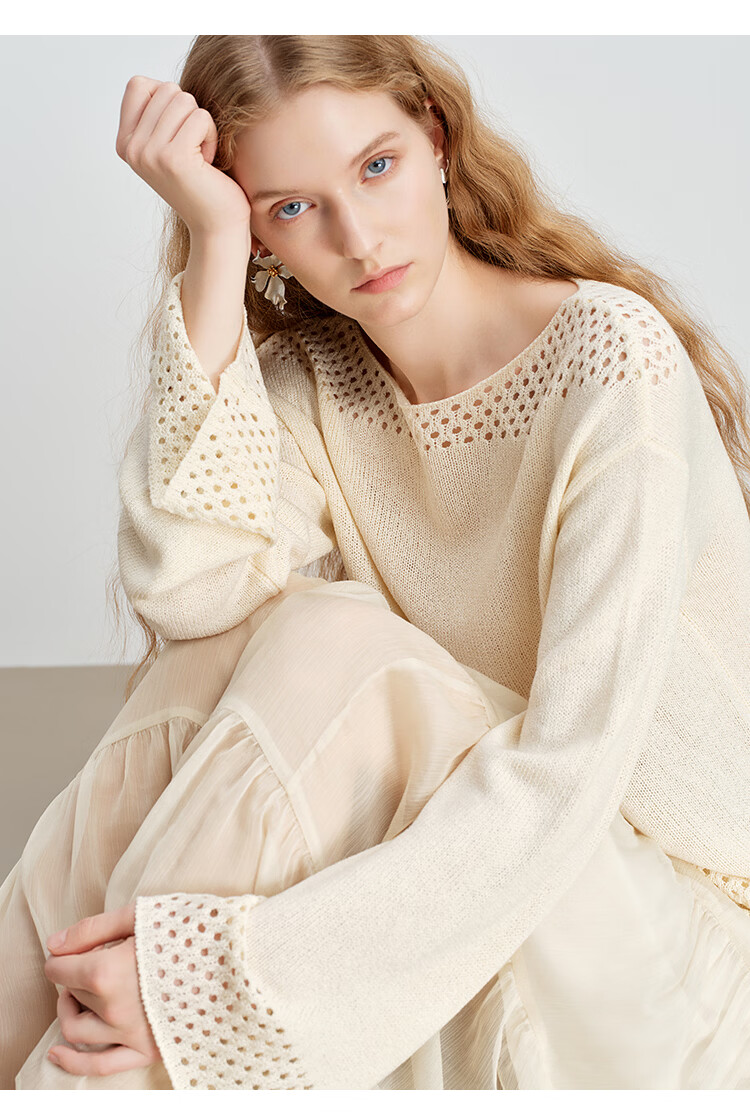 自巧小个子波西米亚镂空圆领钩花针织衫微喇袖上衣女2026春季新品 巧米色 均码 JM