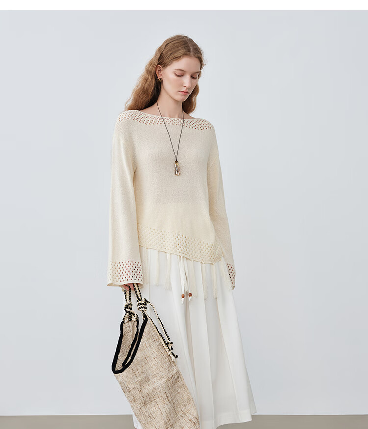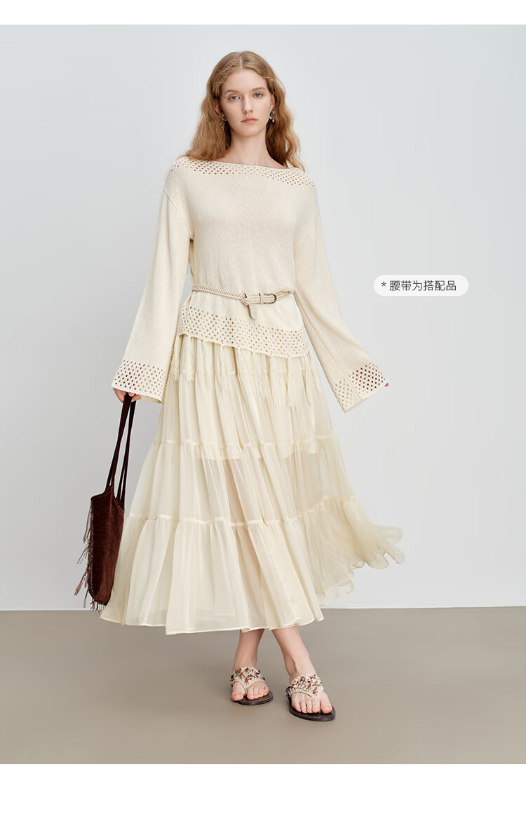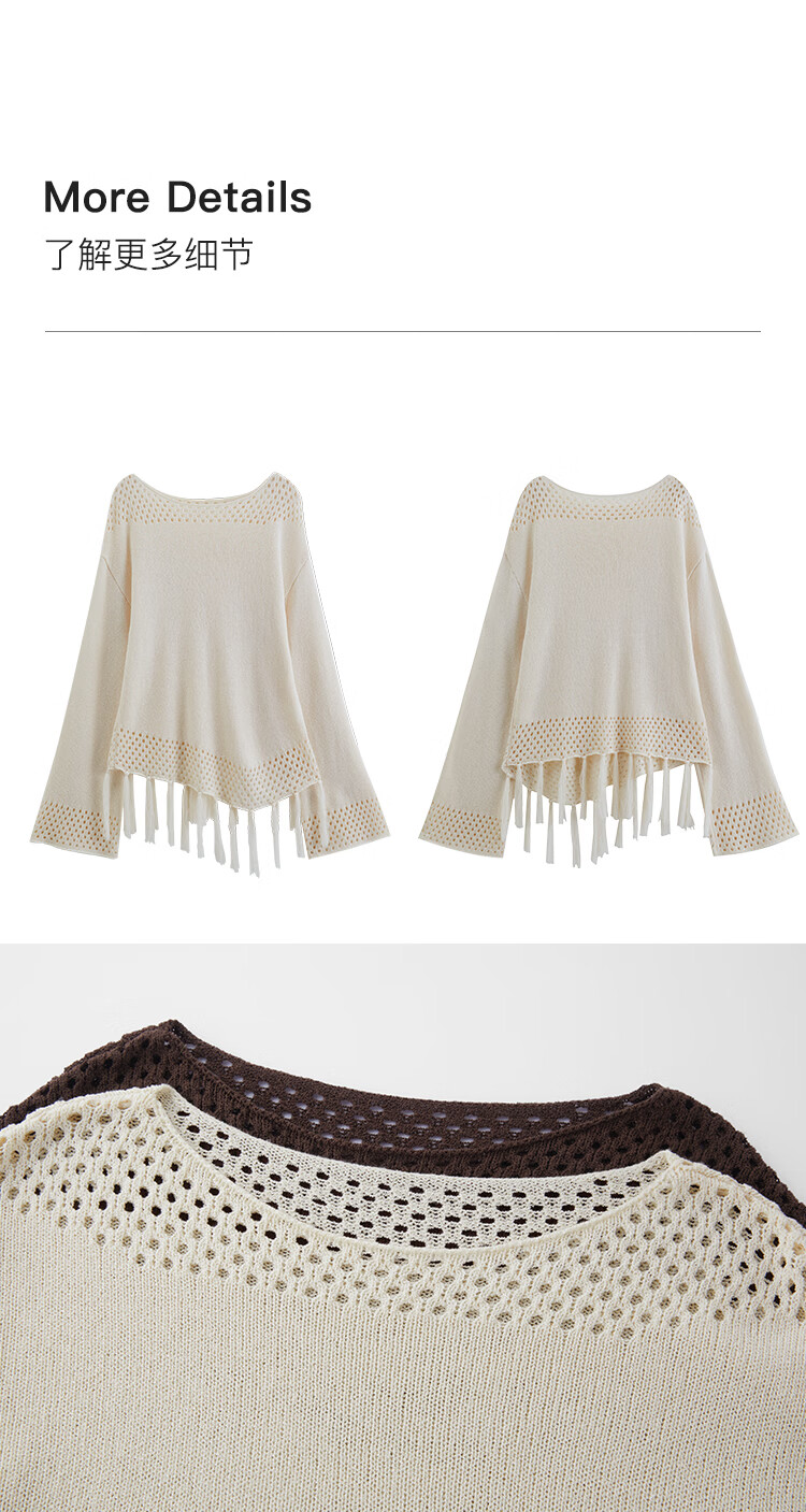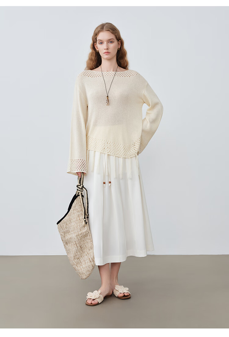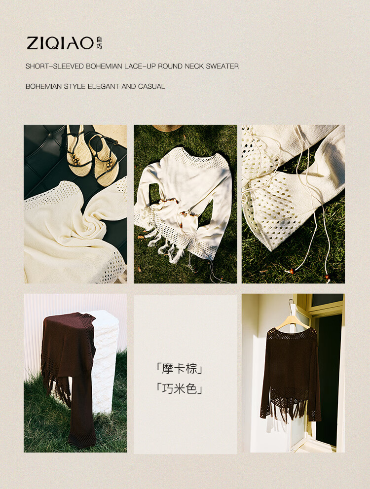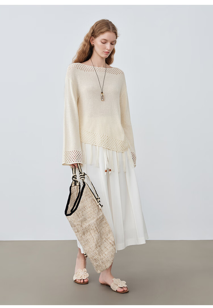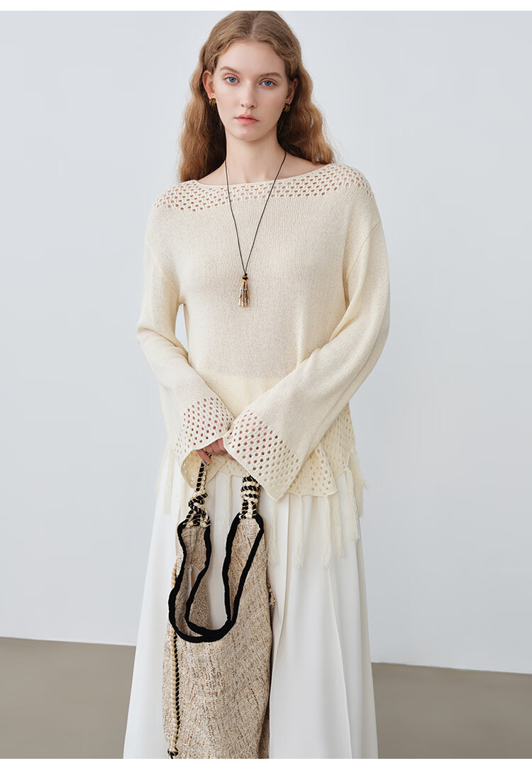 自巧小个子波西米亚镂空圆领钩花针织衫微喇袖上衣女2026春季新品 巧米色 均码 JM