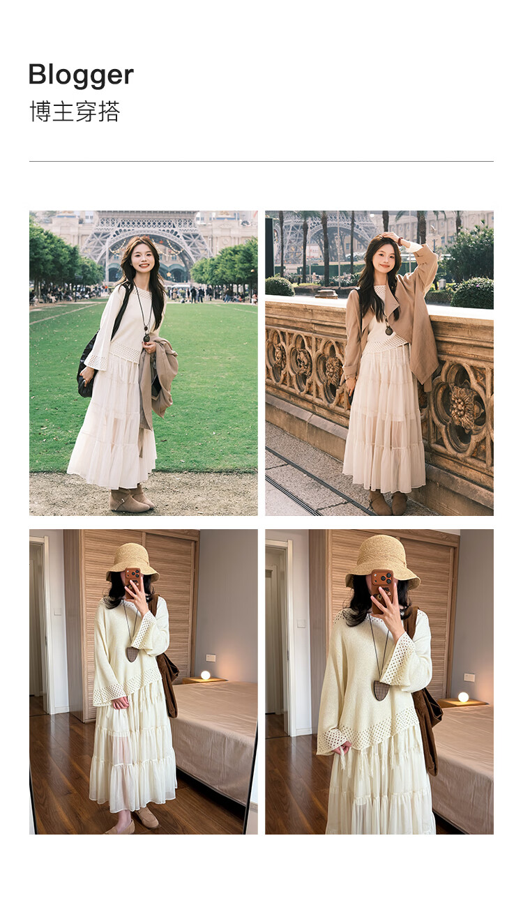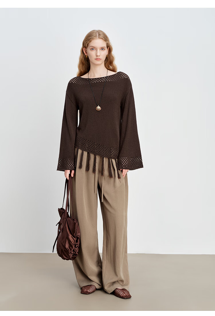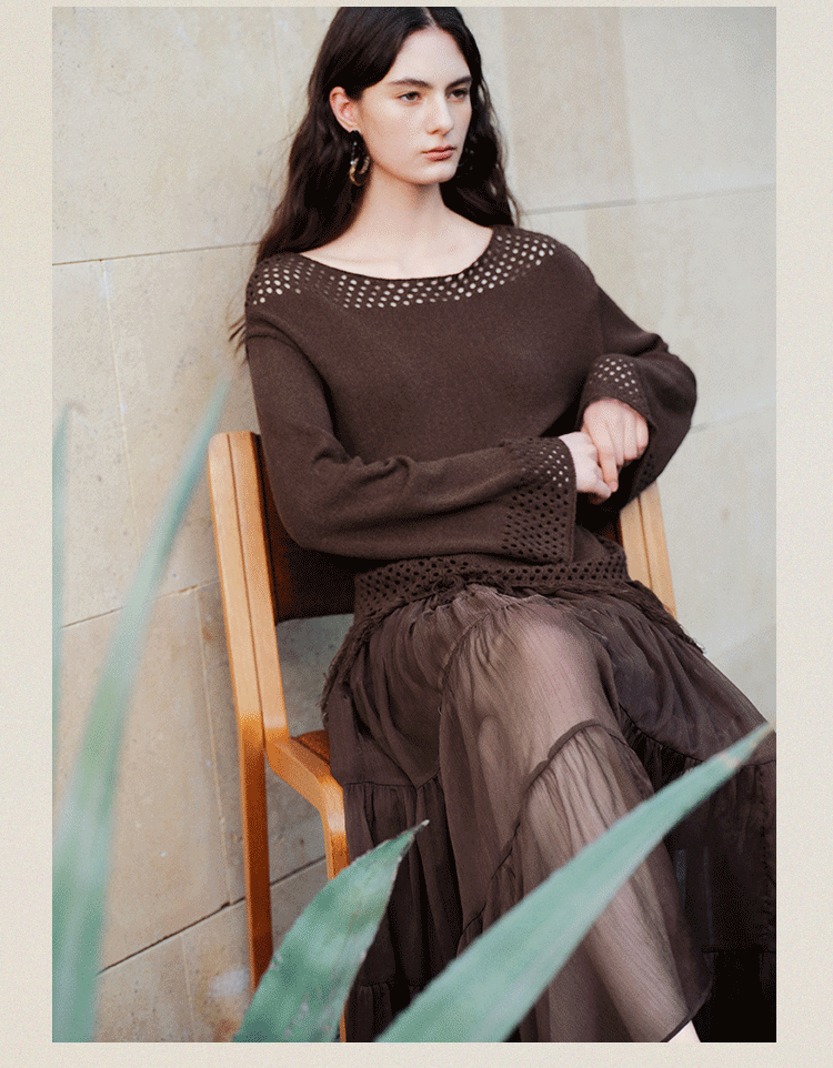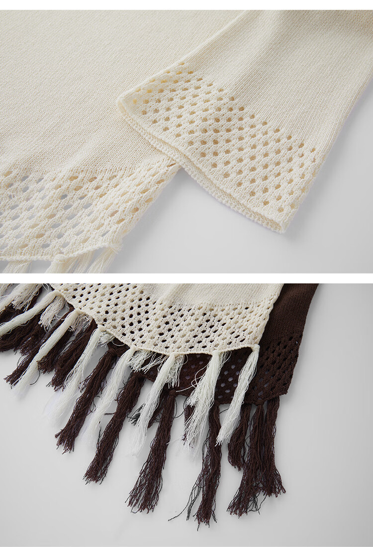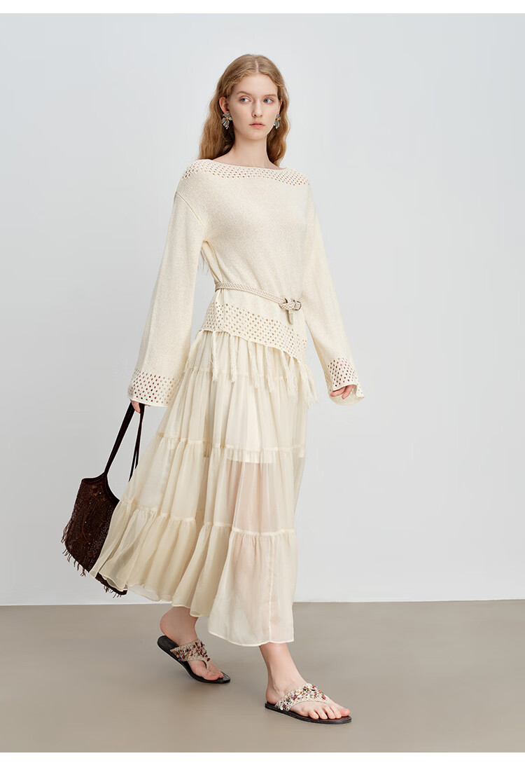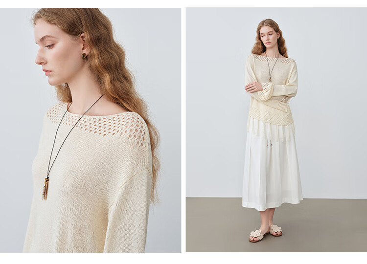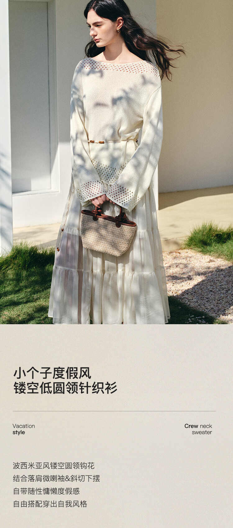 自巧小个子波西米亚镂空圆领钩花针织衫微喇袖上衣女2026春季新品 巧米色 均码 JM