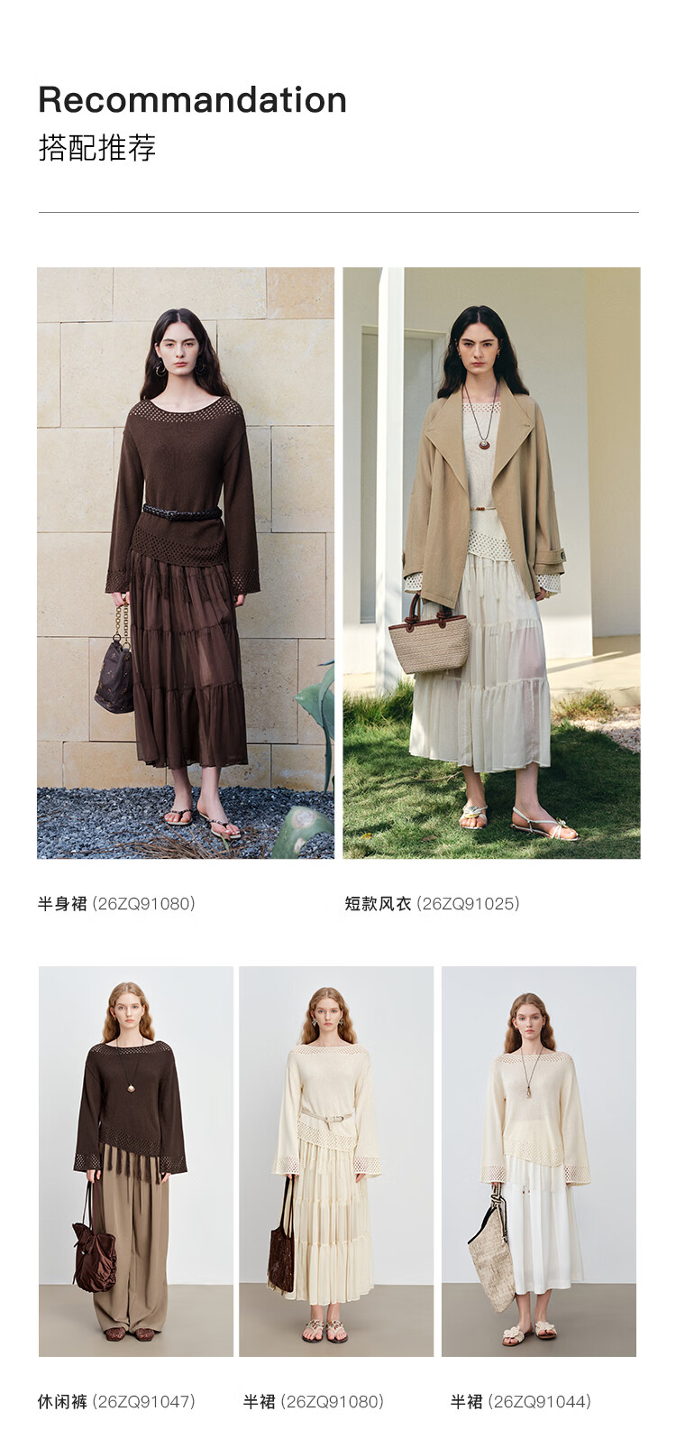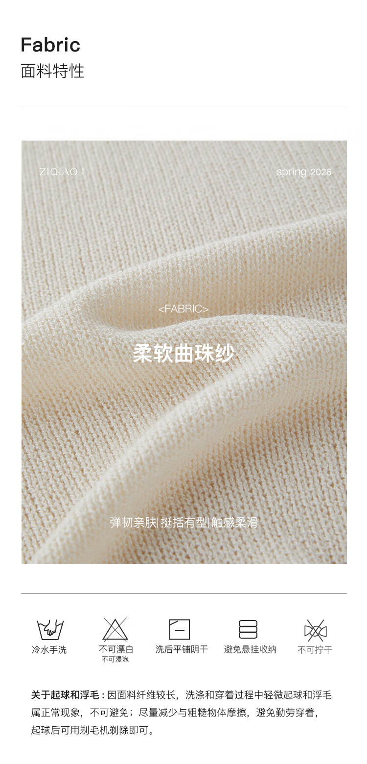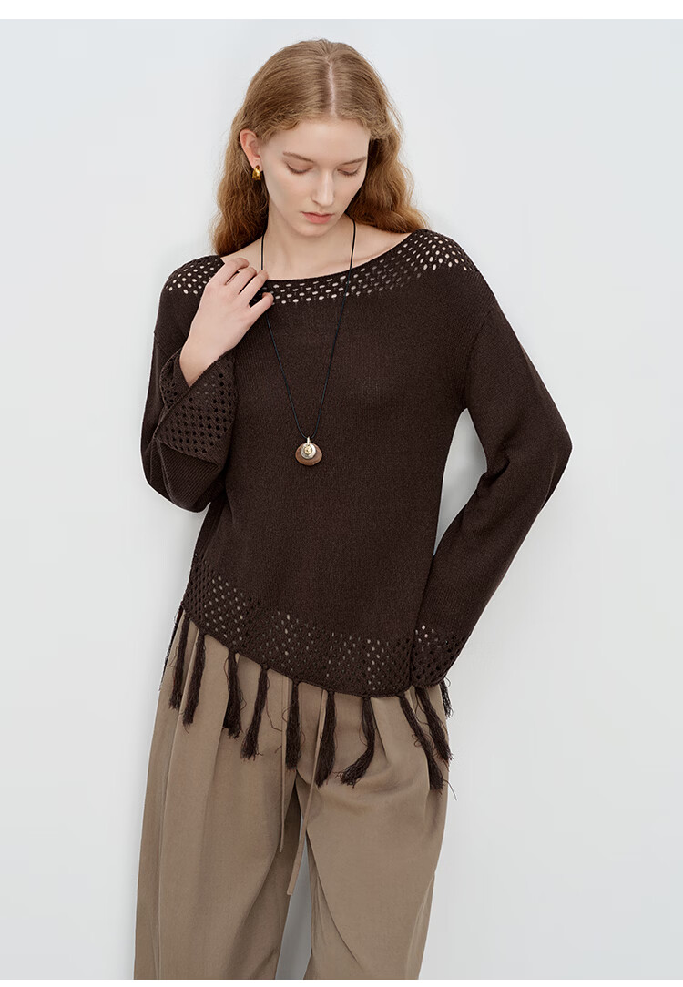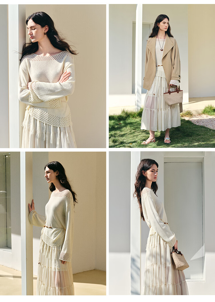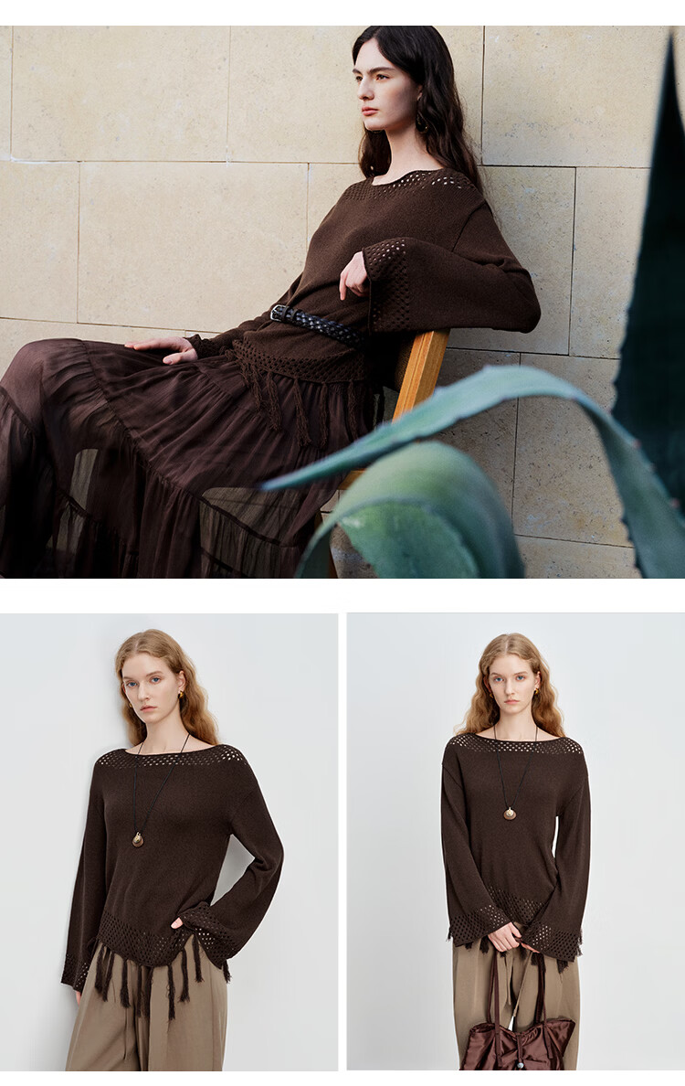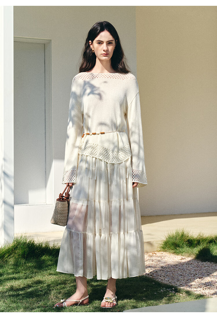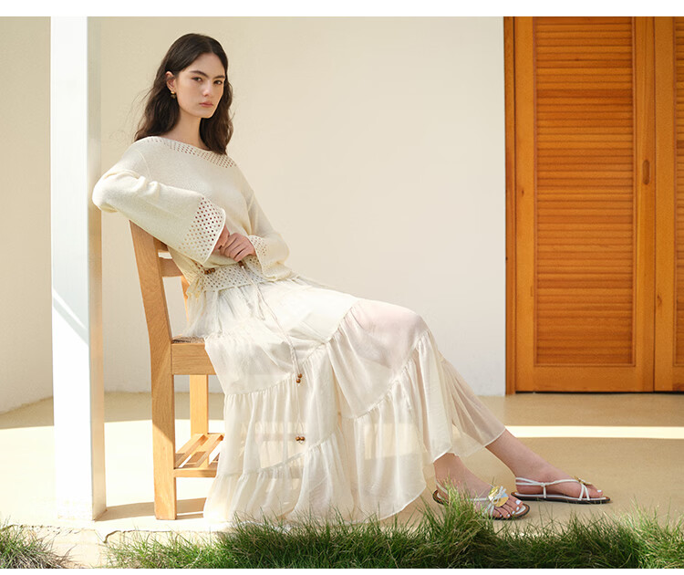 自巧小个子波西米亚镂空圆领钩花针织衫微喇袖上衣女2026春季新品 巧米色 均码 JM