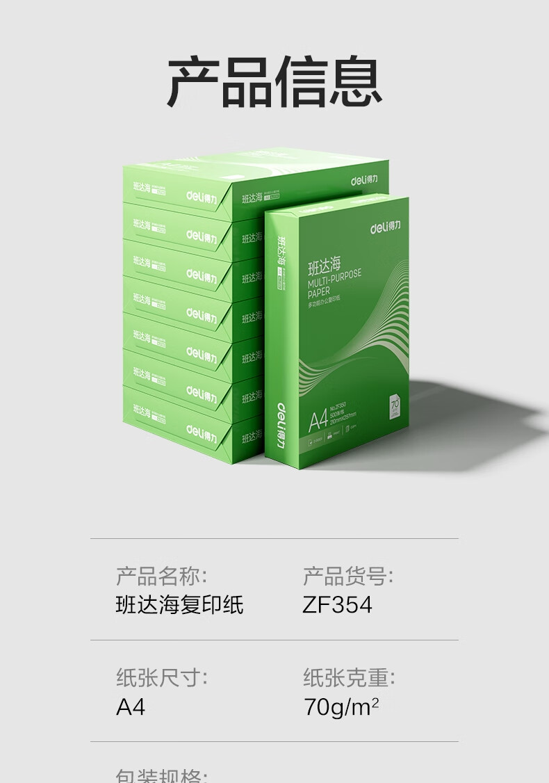 得力(deli)班达海A4打印纸 70g克500张*8包一箱 双面复印纸 高性价比草稿纸 整箱4000张ZF354