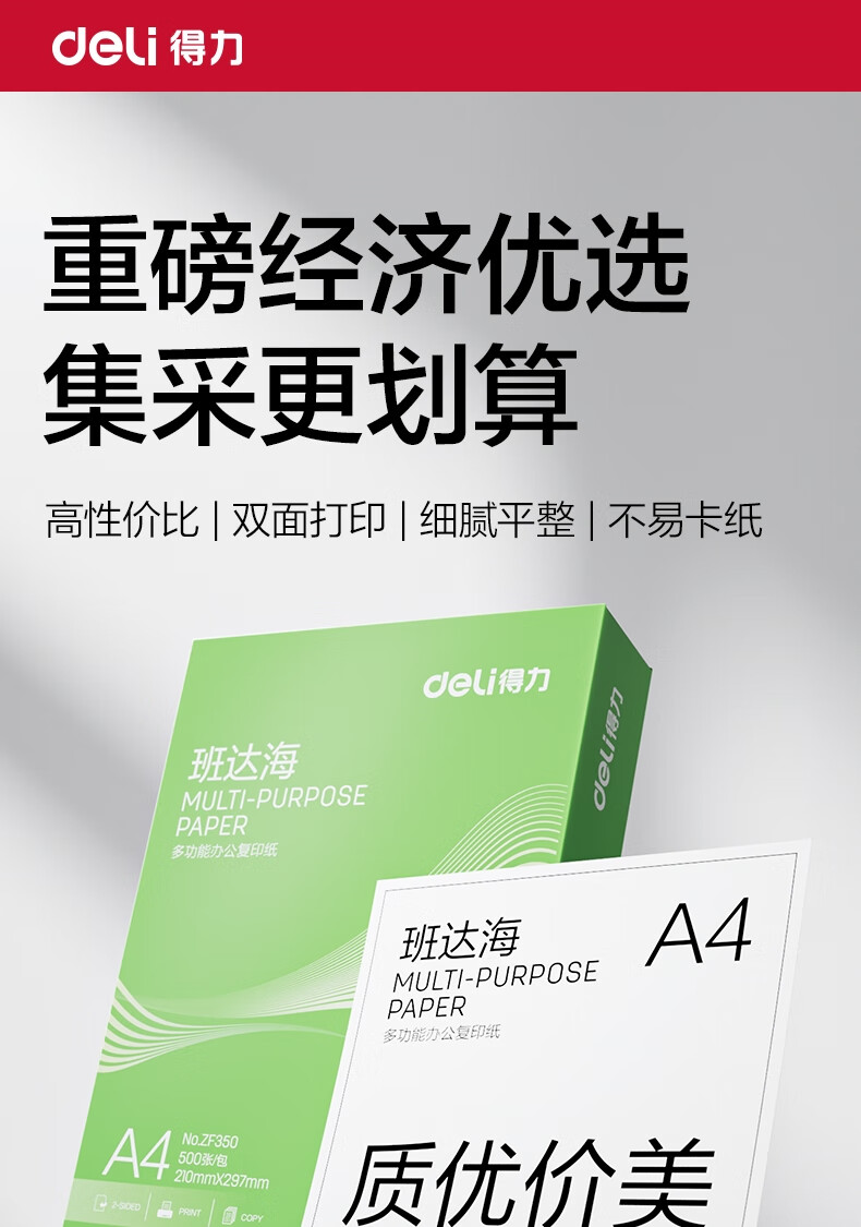 得力(deli)白令海A4打印纸 80g500张单包复印纸 双面加厚 高性价比草稿纸 打印作业7756【经济热销】