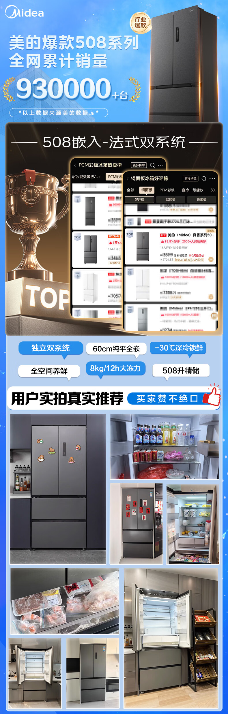 美的(Midea)508嵌入系列508升法式多门冰箱双系统超薄零嵌入一级能效抗菌净味大容量BCD-508WUFPZM(E)国家补贴