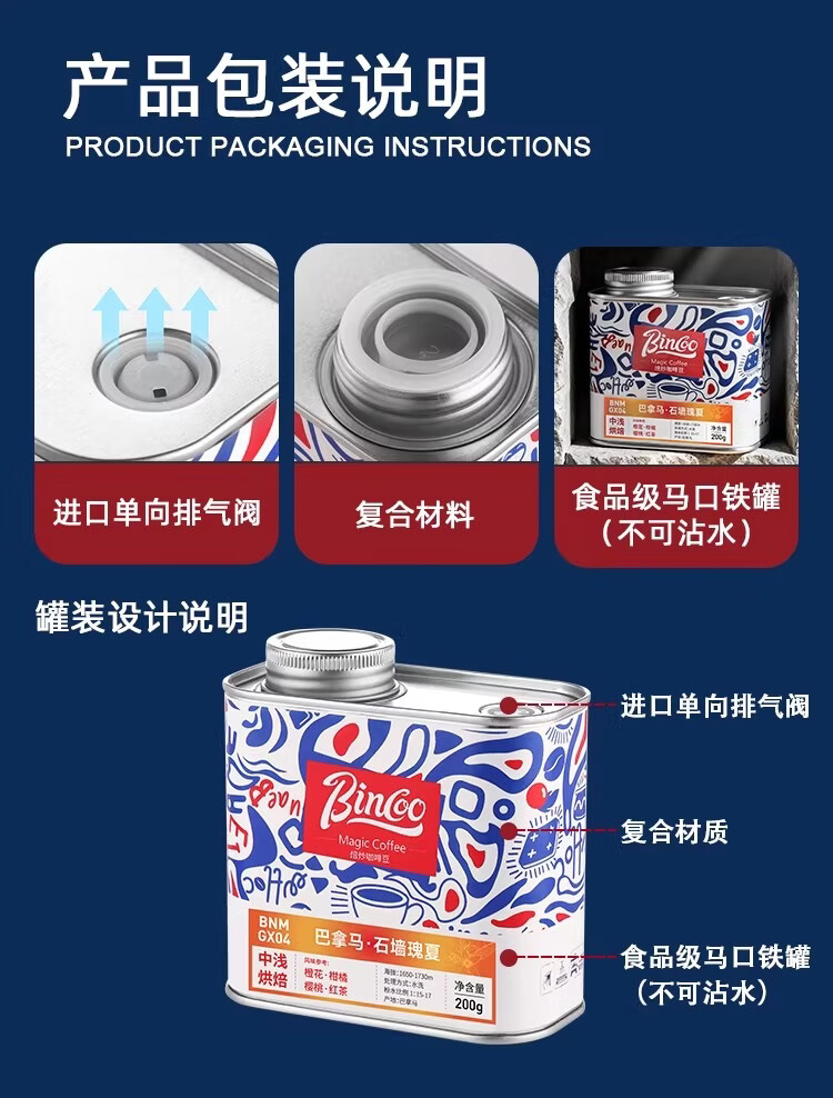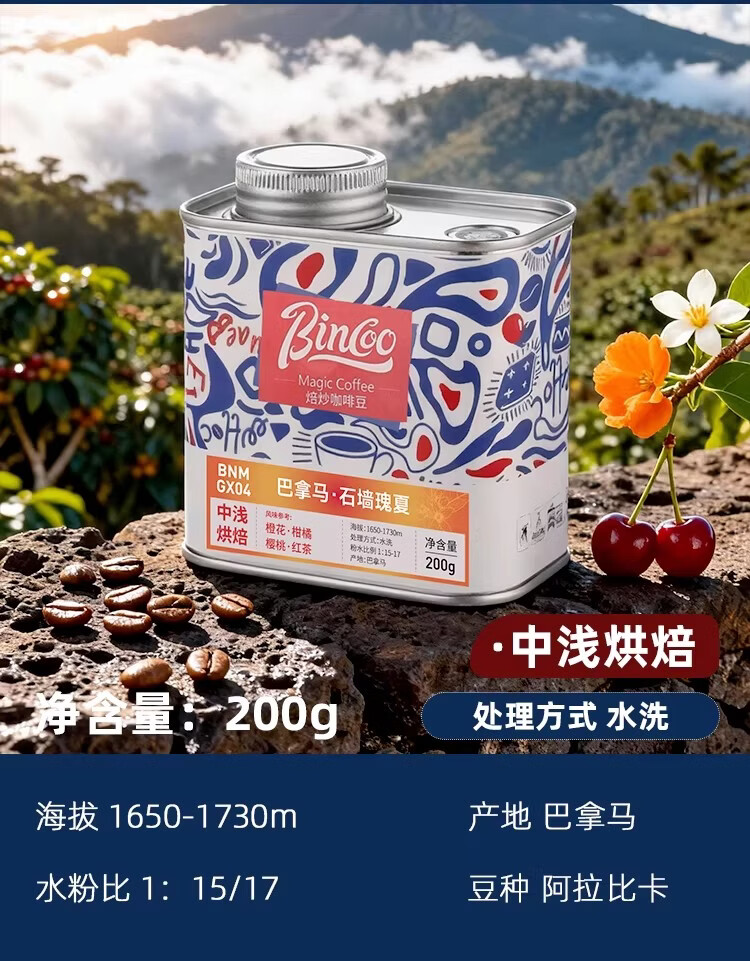 Bincoo石墙瑰夏手冲咖啡豆滴滤式美式咖啡中浅烘培巴拿马石墙庄园 100g罐装 中浅烘焙