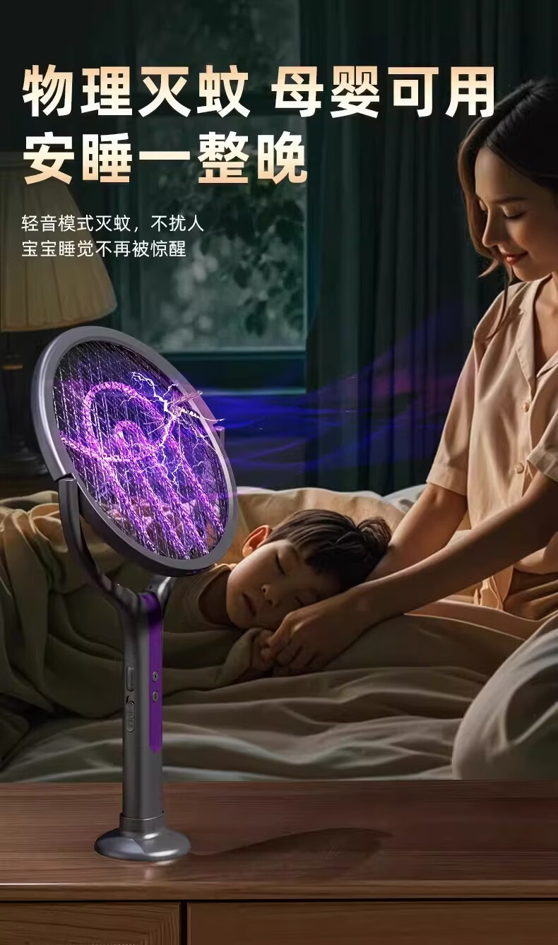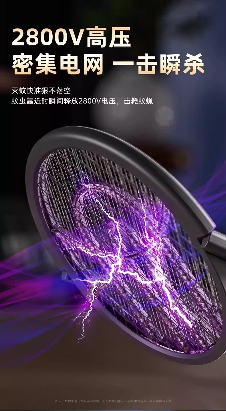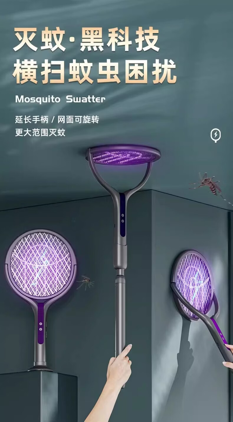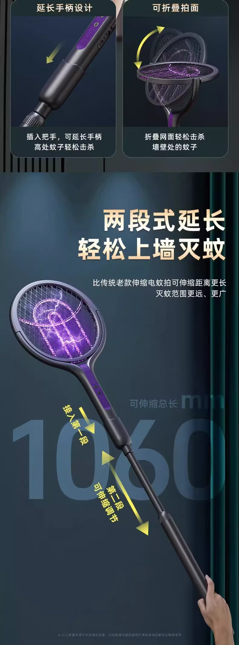 ZYUO日本电蚊拍充电式家用二合一自动诱蚊可伸缩强力密苍蝇拍驱蚊神器 【基础手柄款】锂电池+紫光诱蚊灯+90°旋转折叠