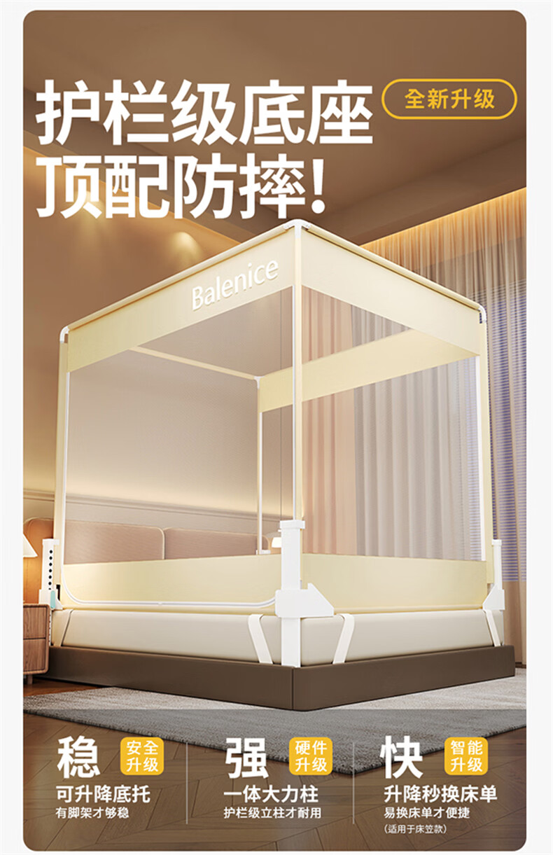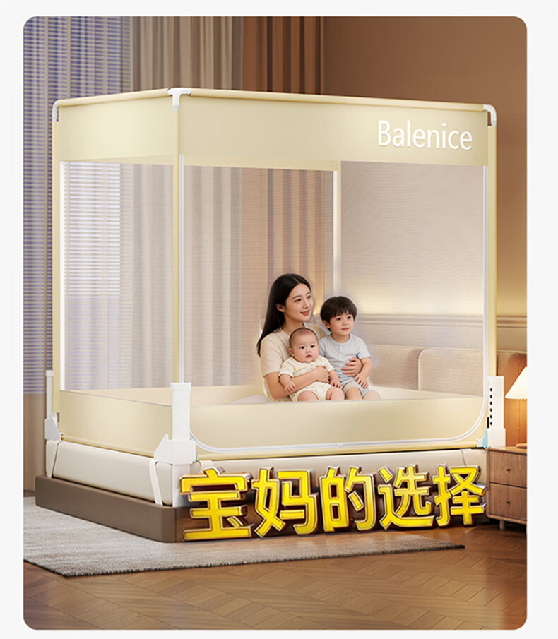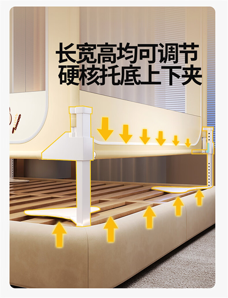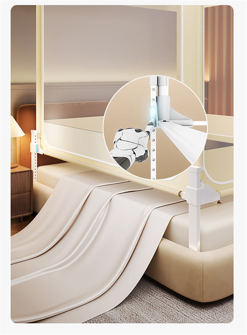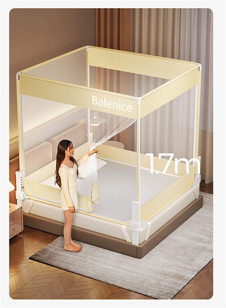 无印良品婴儿防摔蚊帐1.8x2米家用一体式免安装儿童防掉床围栏蚊帐二合一 光年-黄【围栏支架+防尘顶+风扇杆】 1.8m床-宽180x长200x高170cm