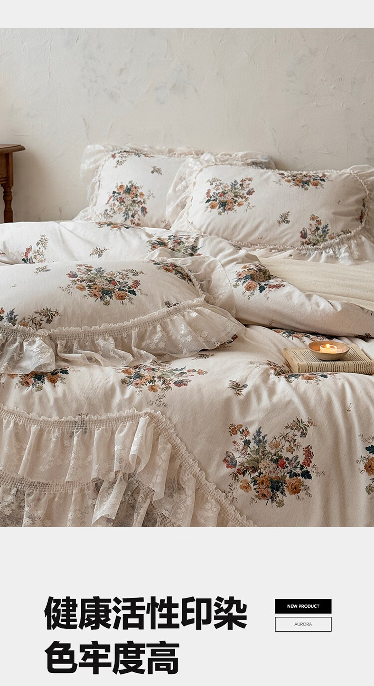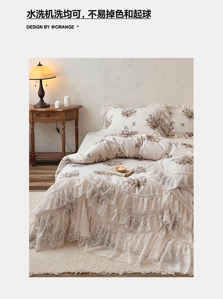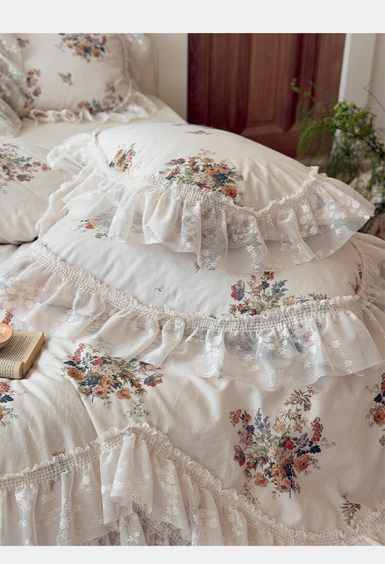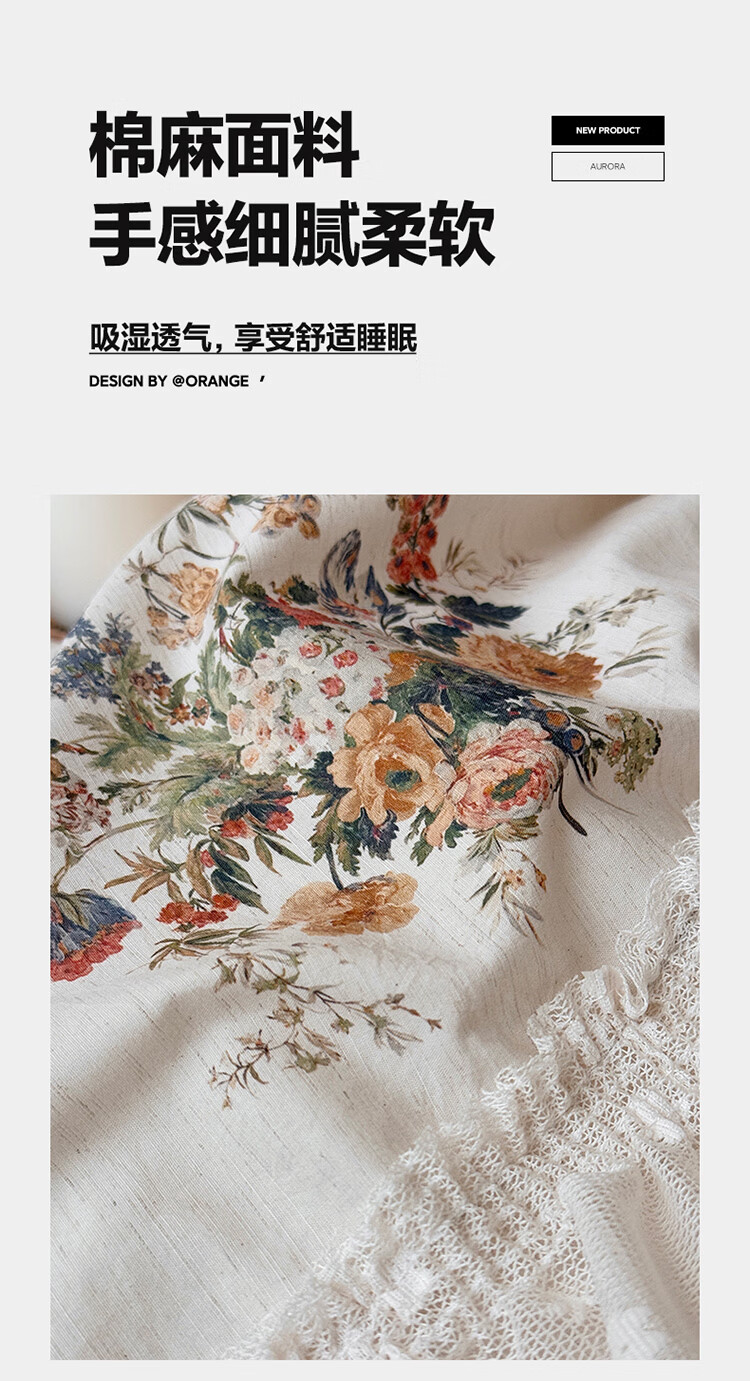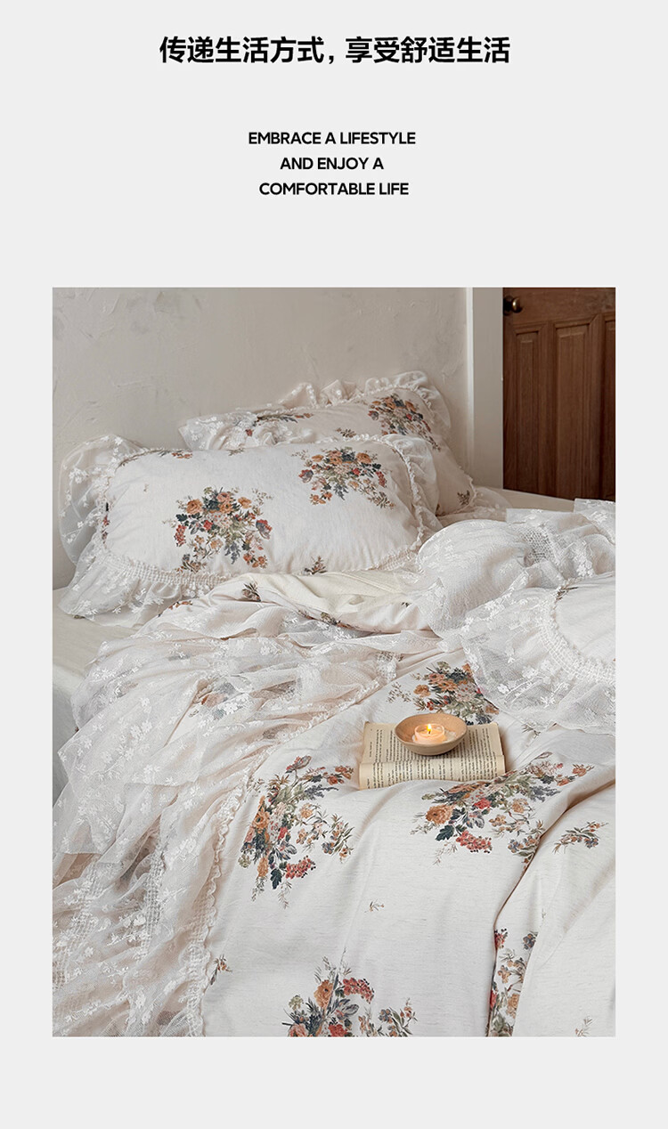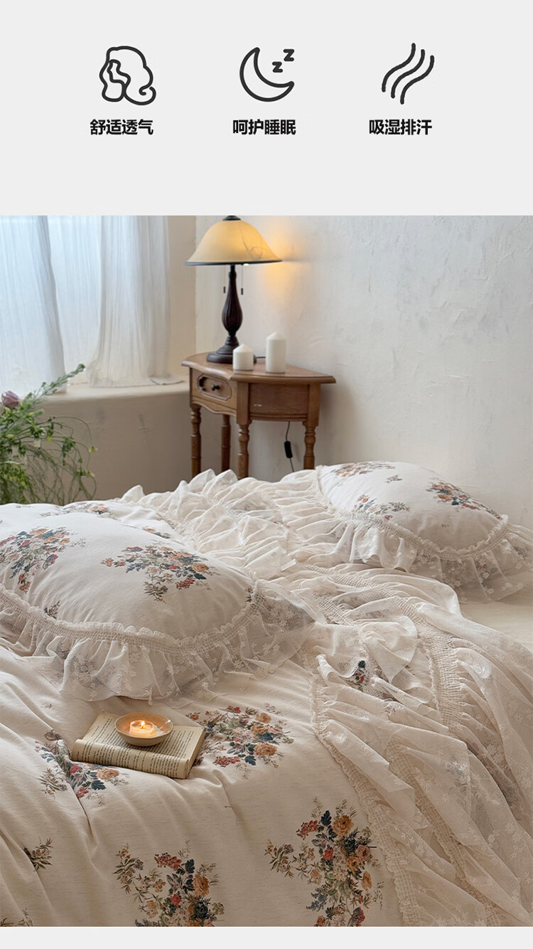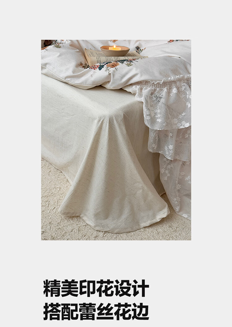 ROLAND LIVE公主风棉麻印花四件套蕾丝花边少女心被套床单四季通用床上用品 YB 棉麻四件套- 一涟 1.5米床 床单款 【被套200*230cm】