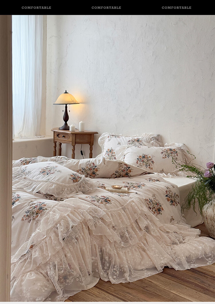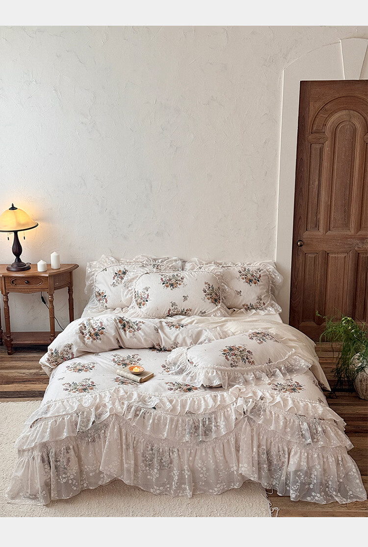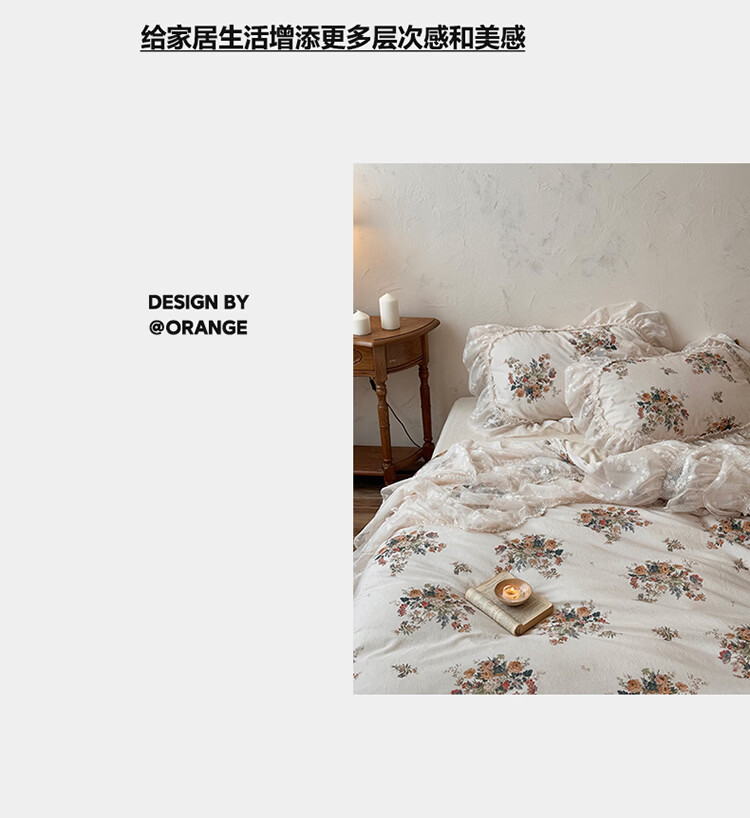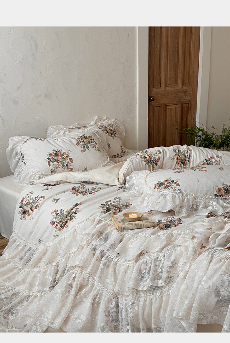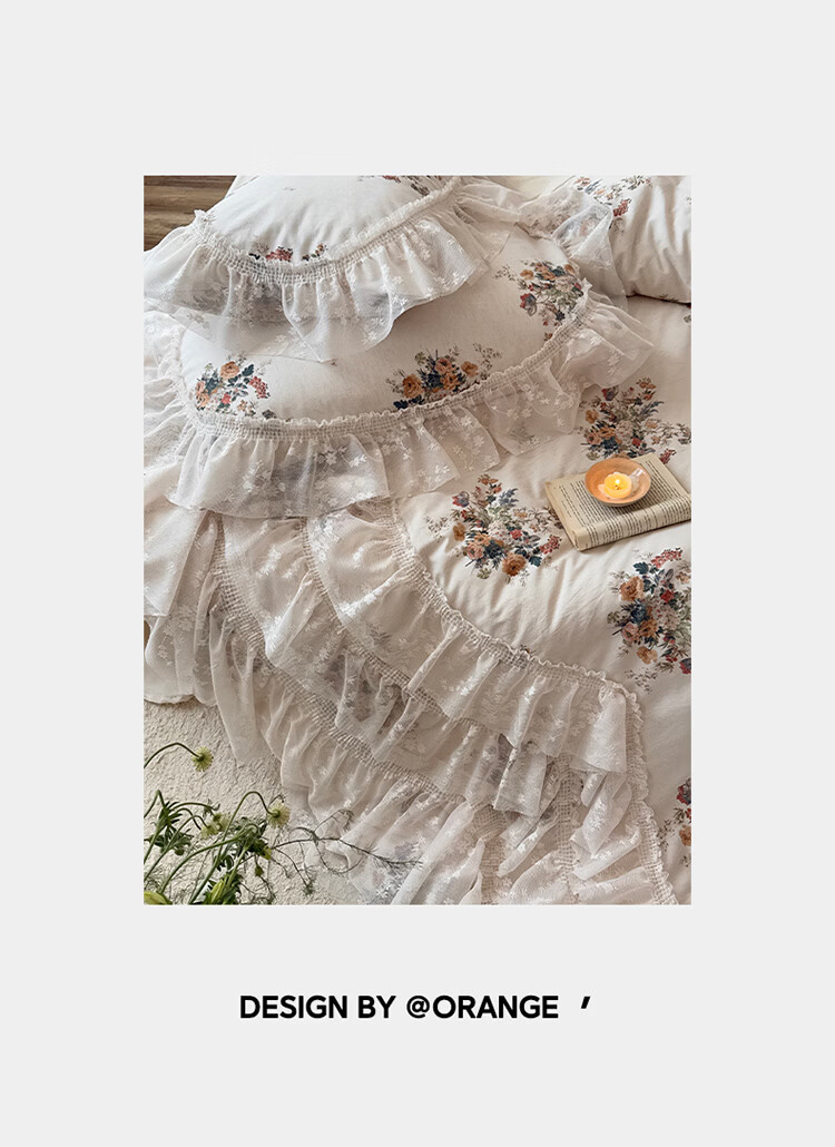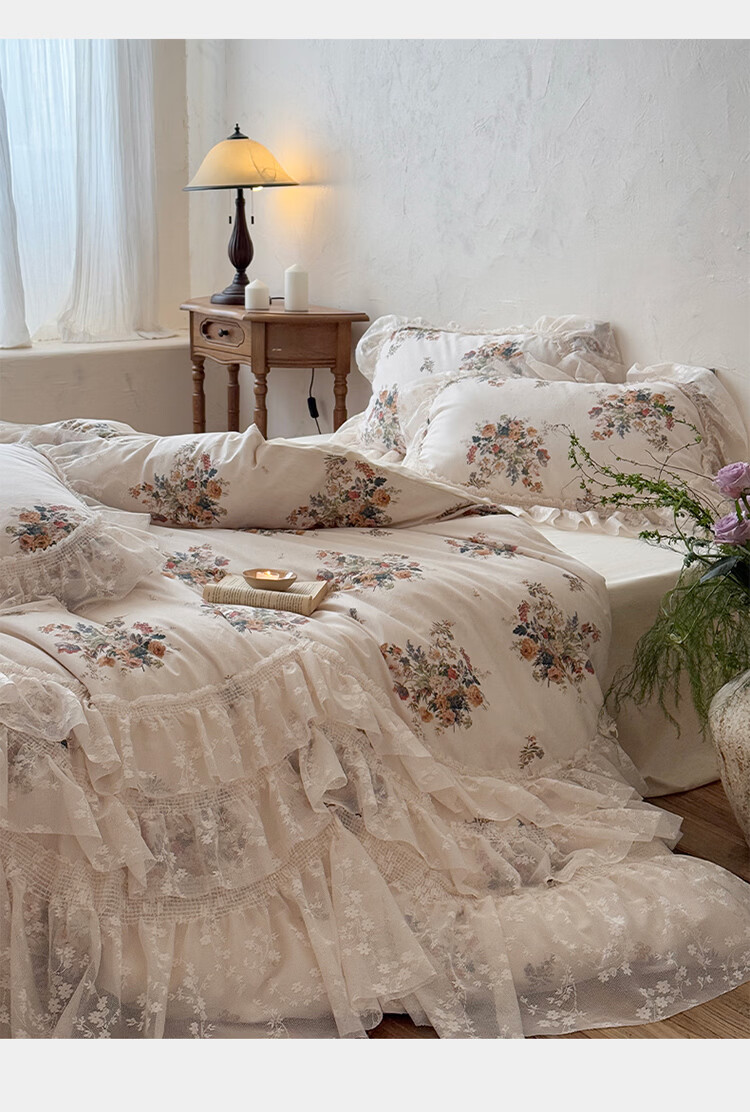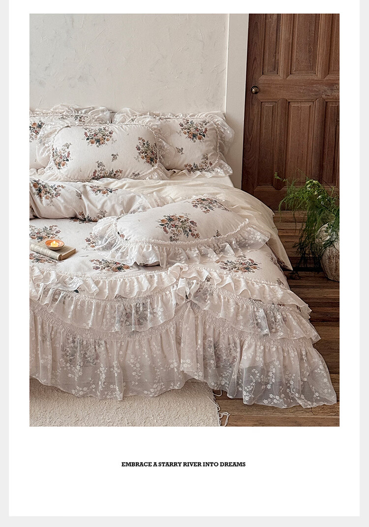 ROLAND LIVE公主风棉麻印花四件套蕾丝花边少女心被套床单四季通用床上用品 YB 棉麻四件套- 一涟 1.5米床 床单款 【被套200*230cm】