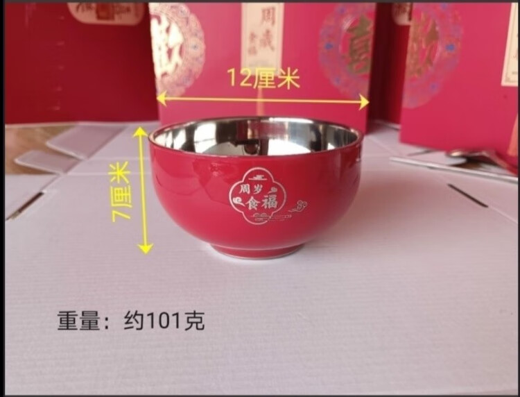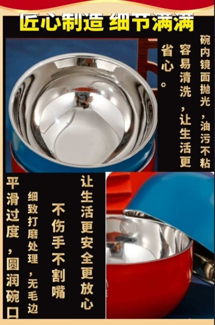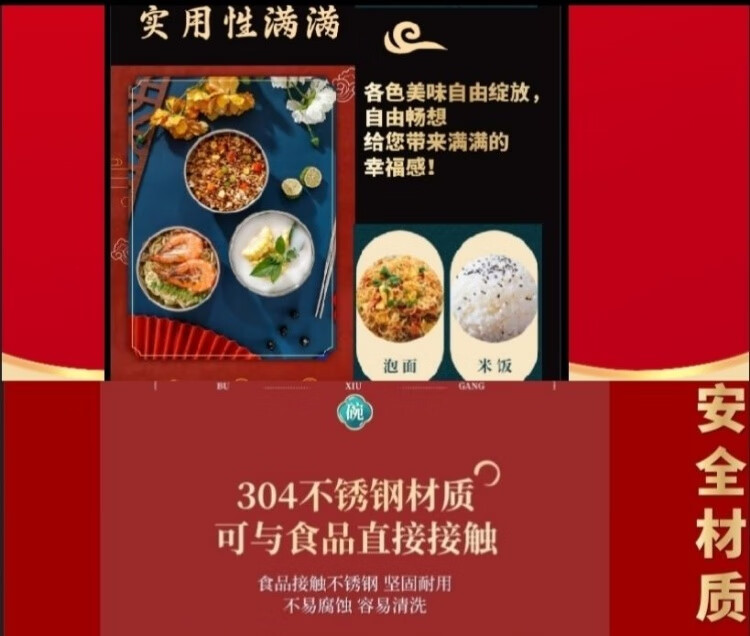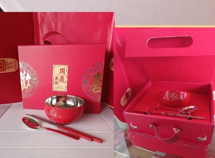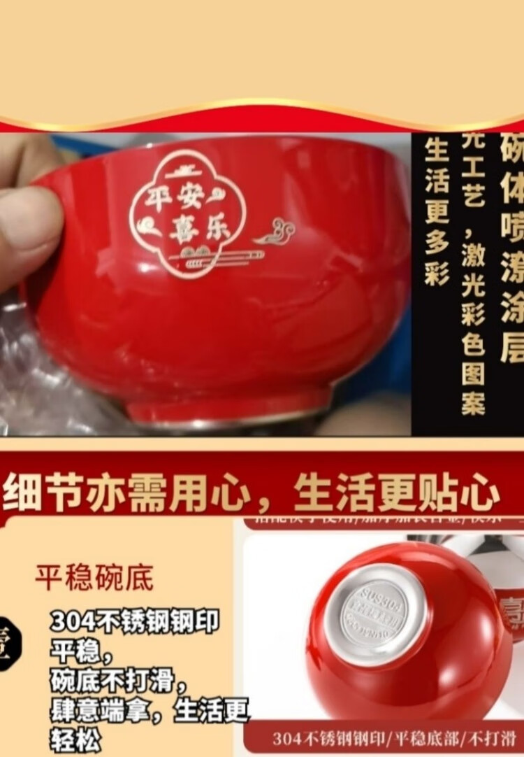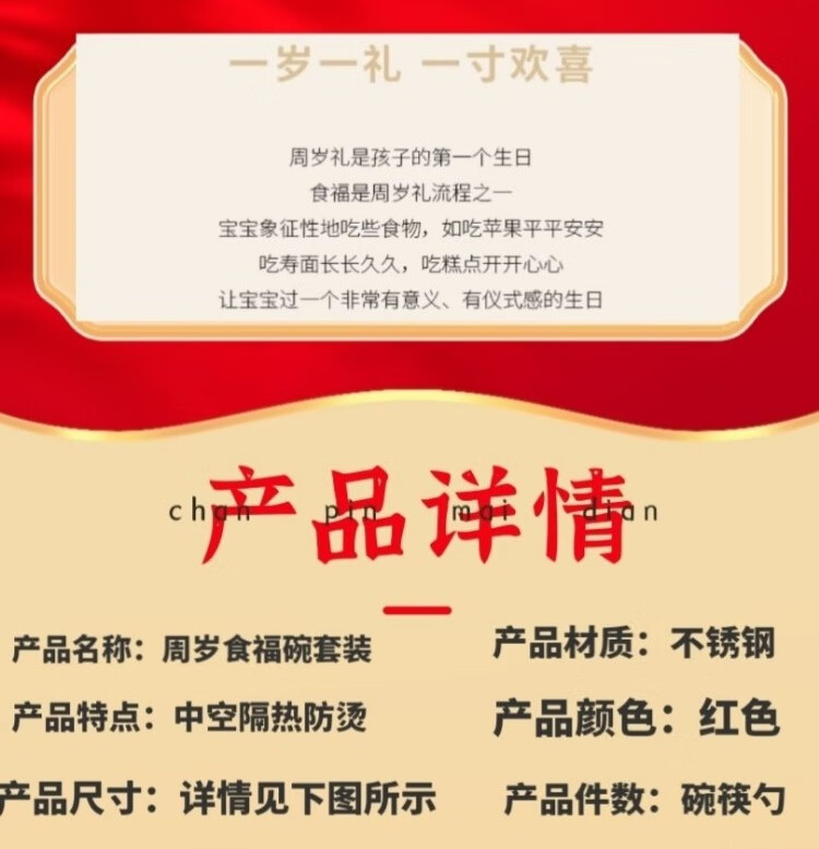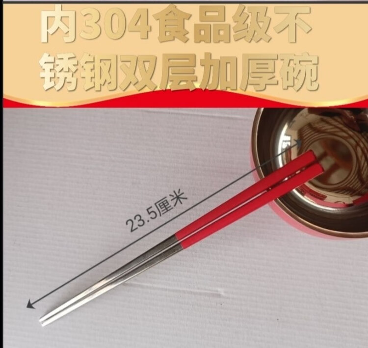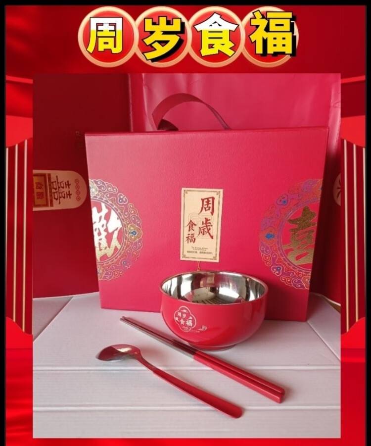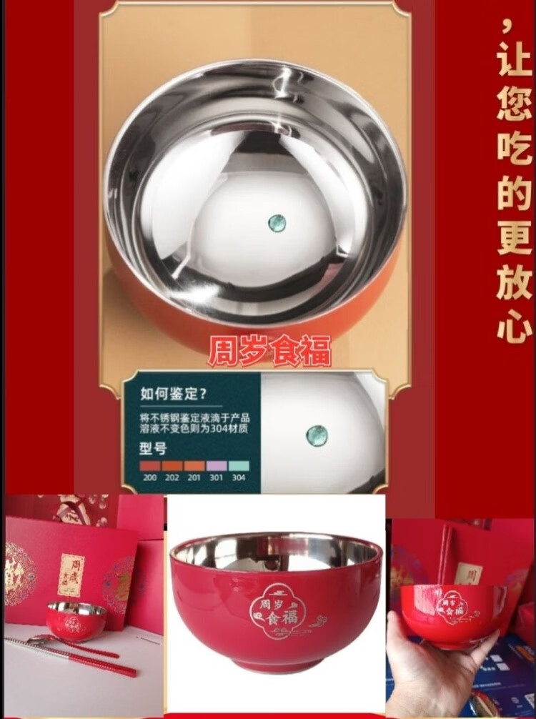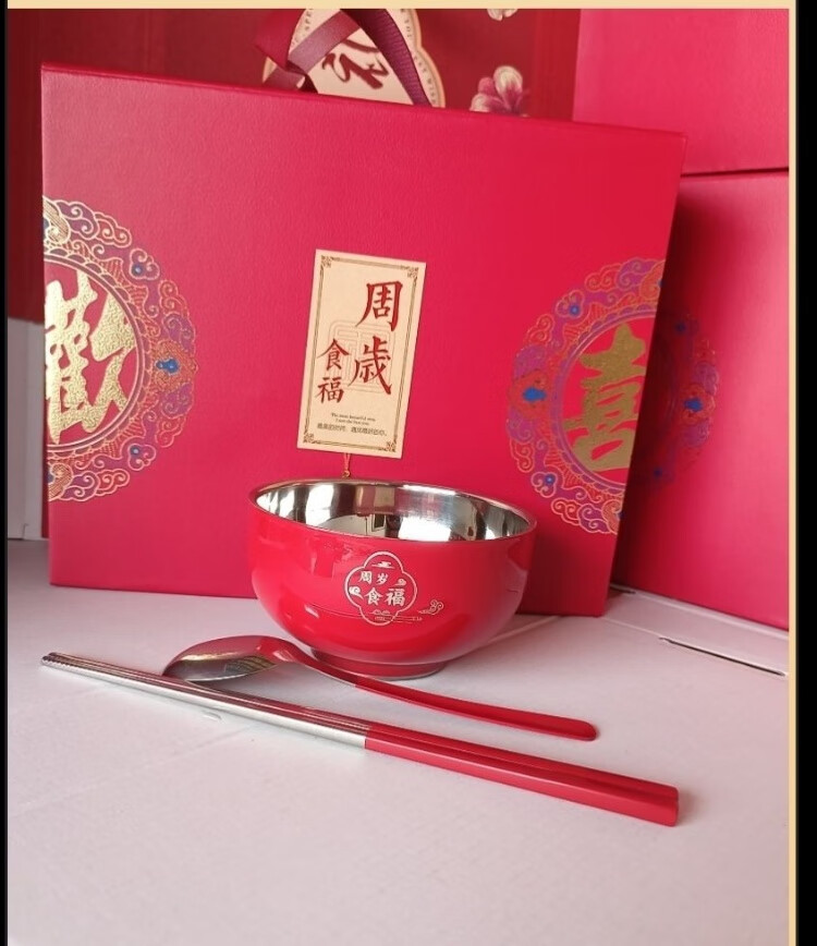 认干亲周岁食福生日礼物304不锈钢碗家用食品级双层汤碗防摔防烫 家添萌宝礼盒(平安喜乐碗筷勺各1)三件套 抗菌304食品级不锈钢
