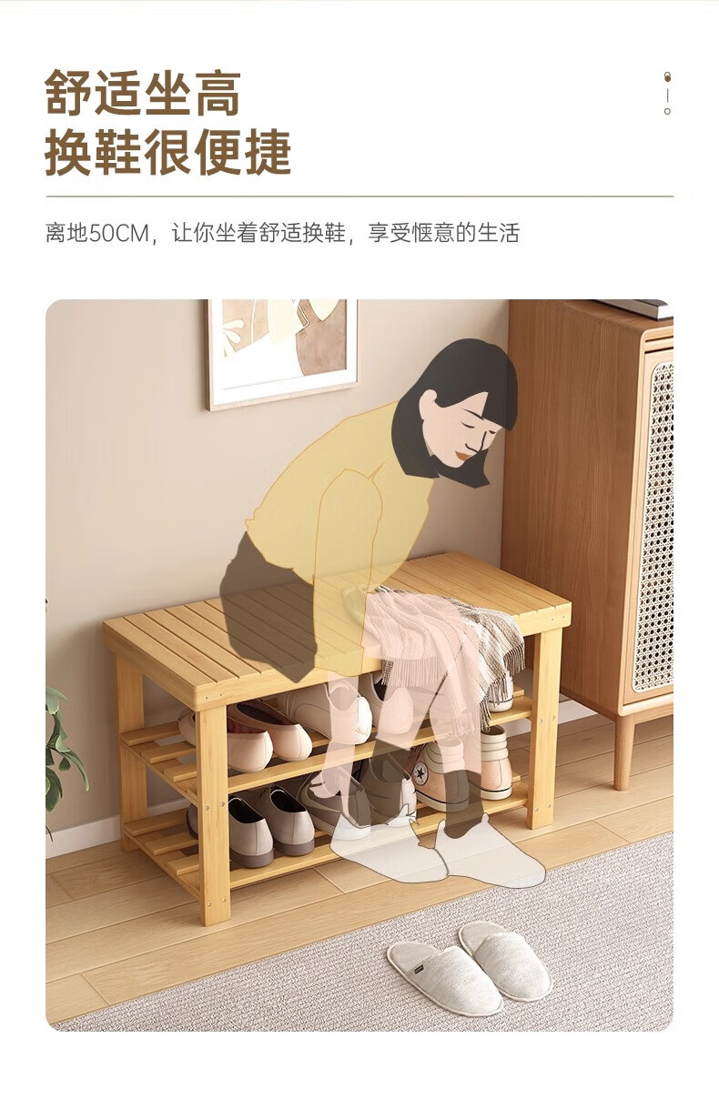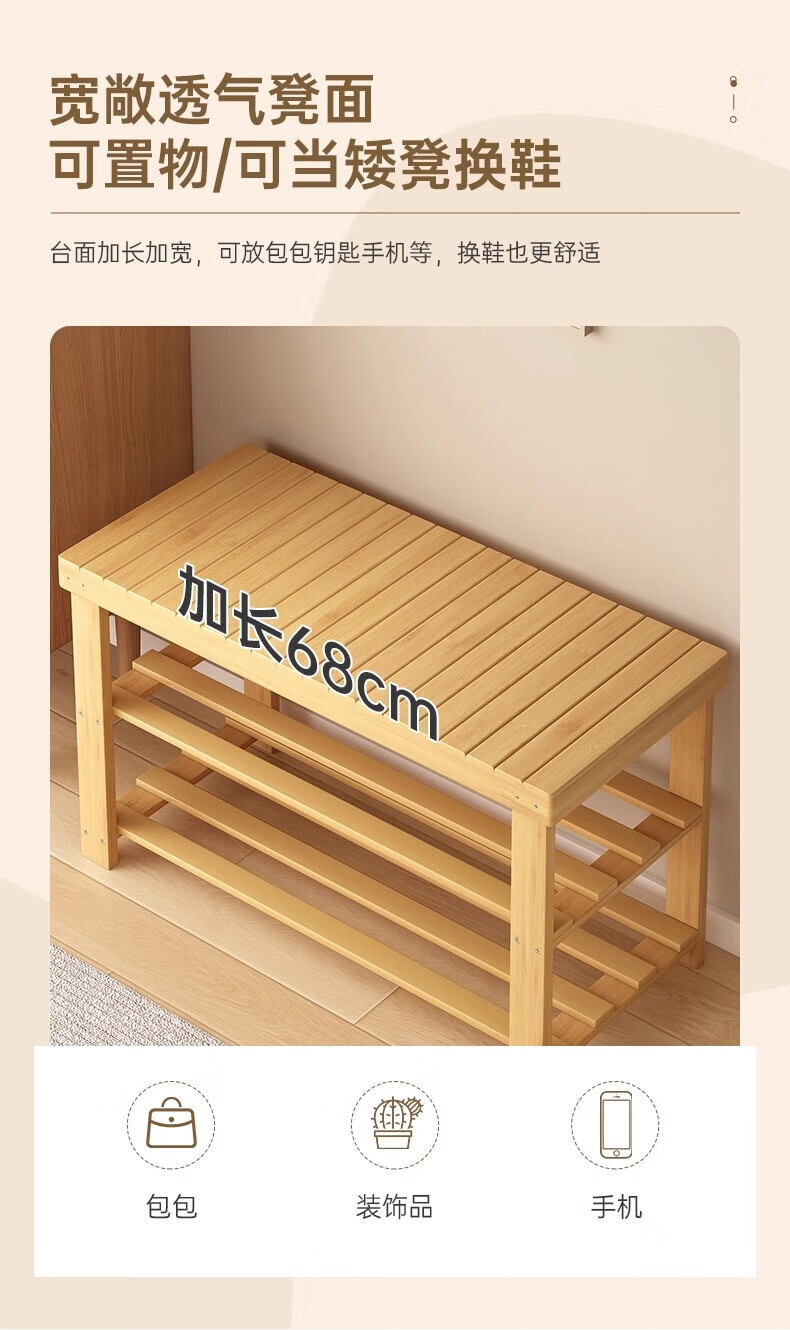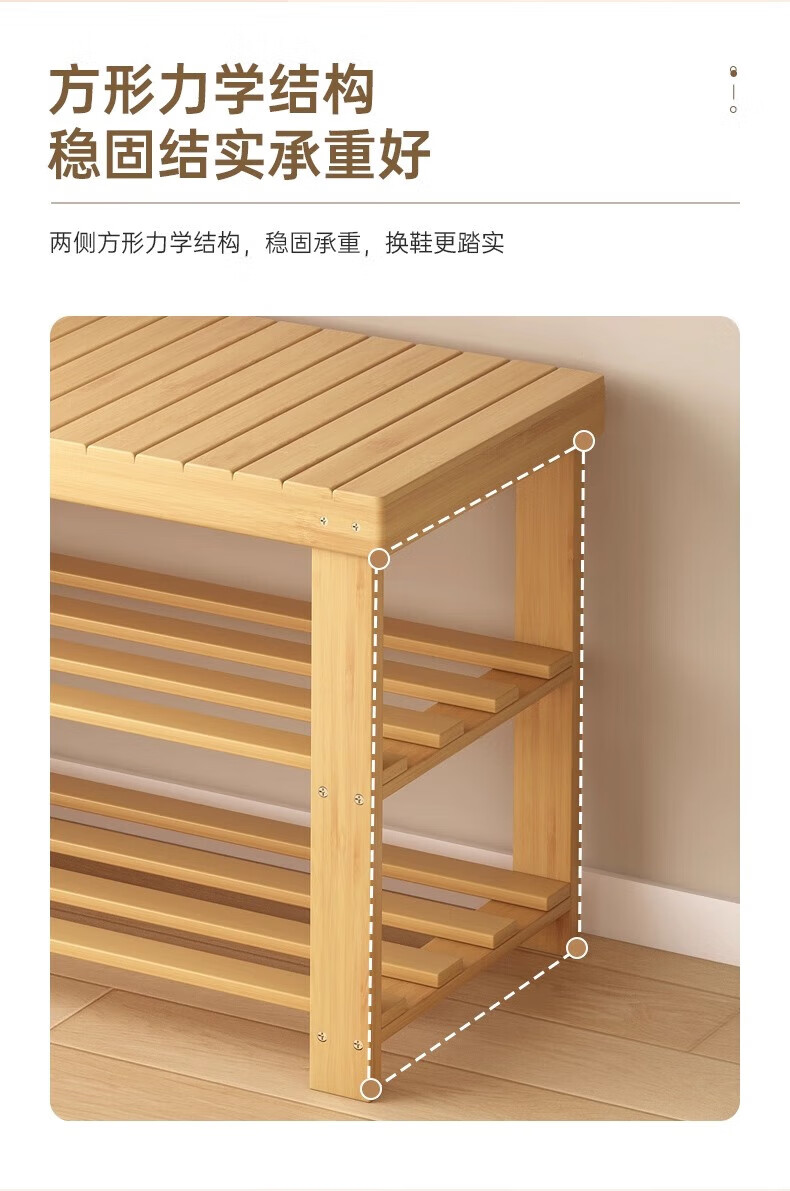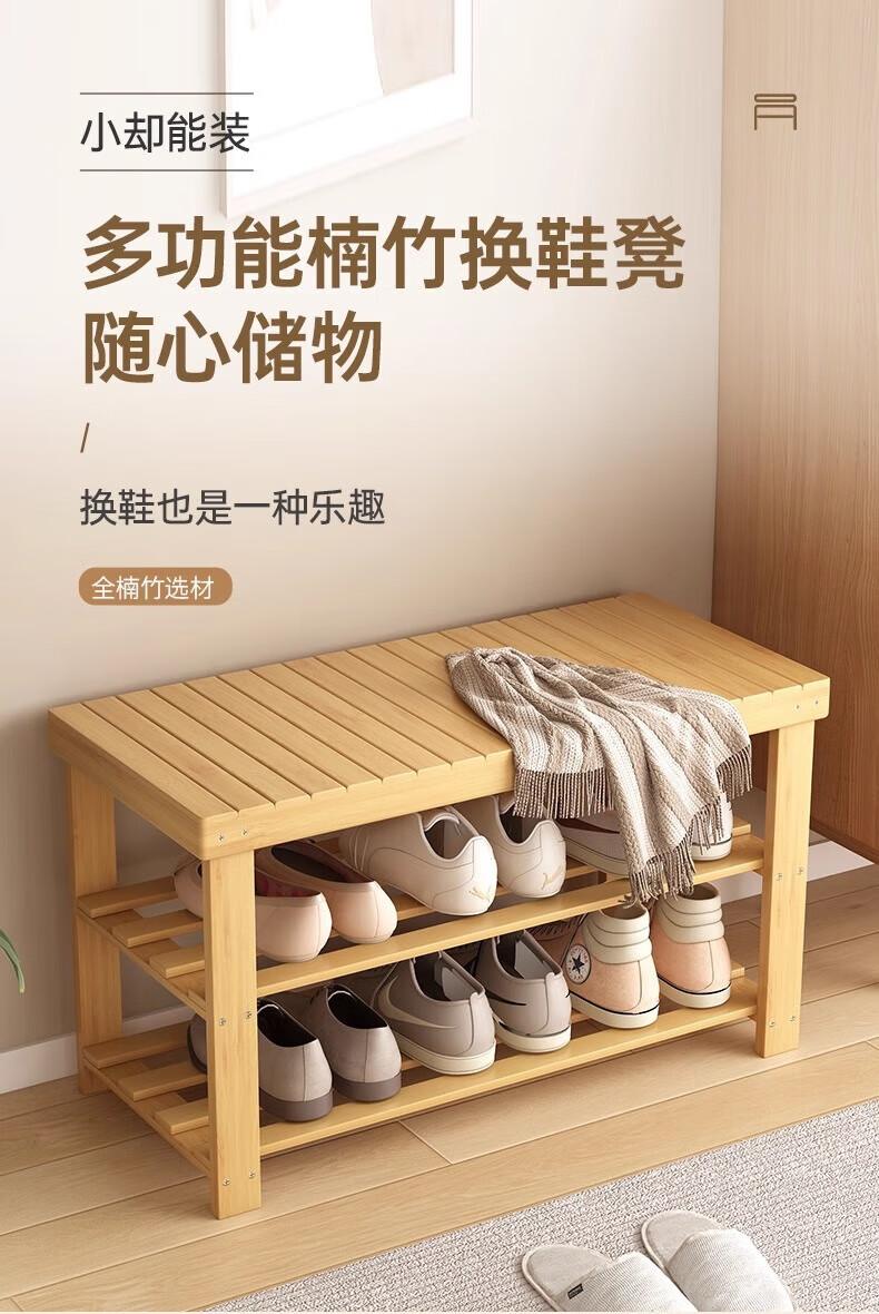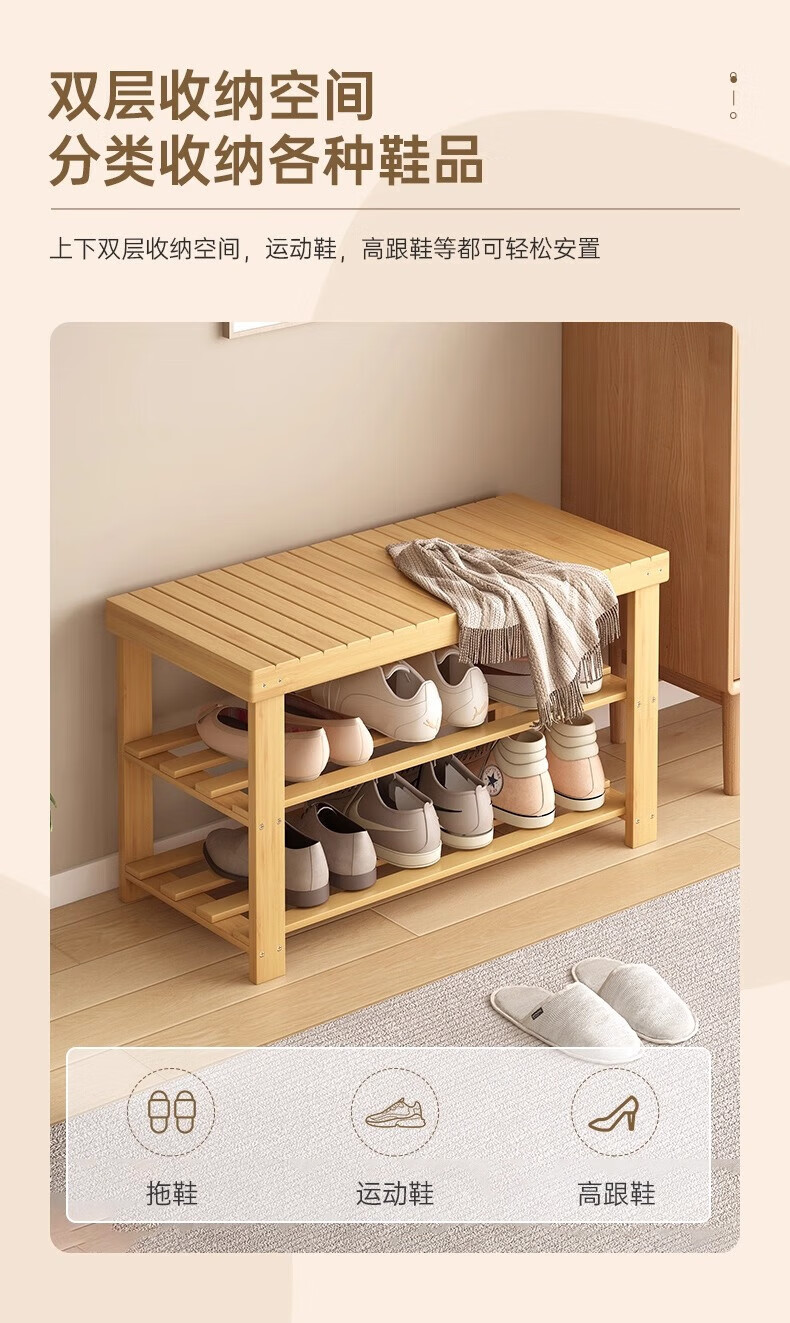 馨婺家换鞋凳家用长条竹制鞋架门口入户玄关可坐穿鞋鞋柜一体简约换鞋柜 原木色-2层【加厚加粗】
