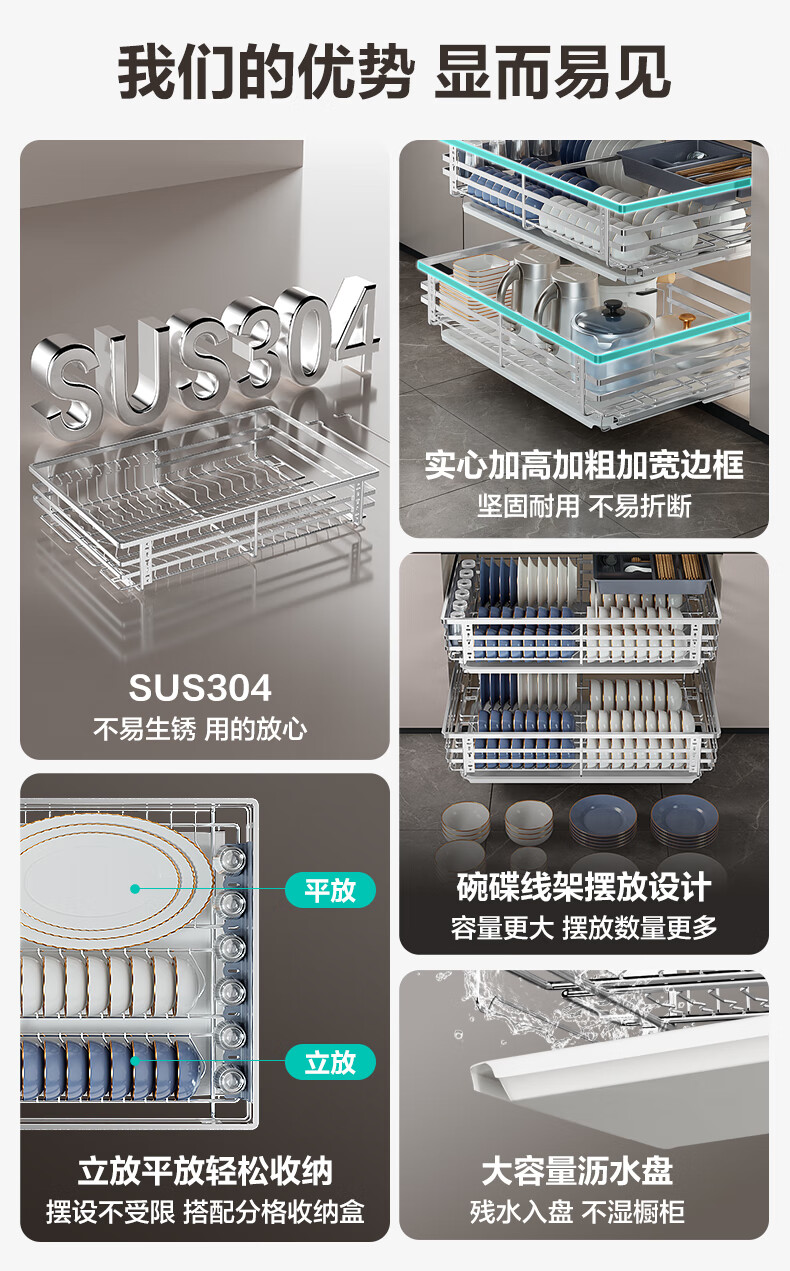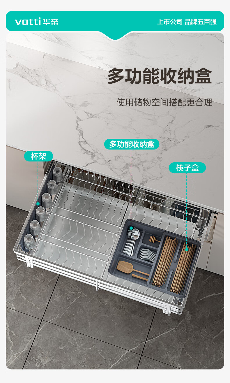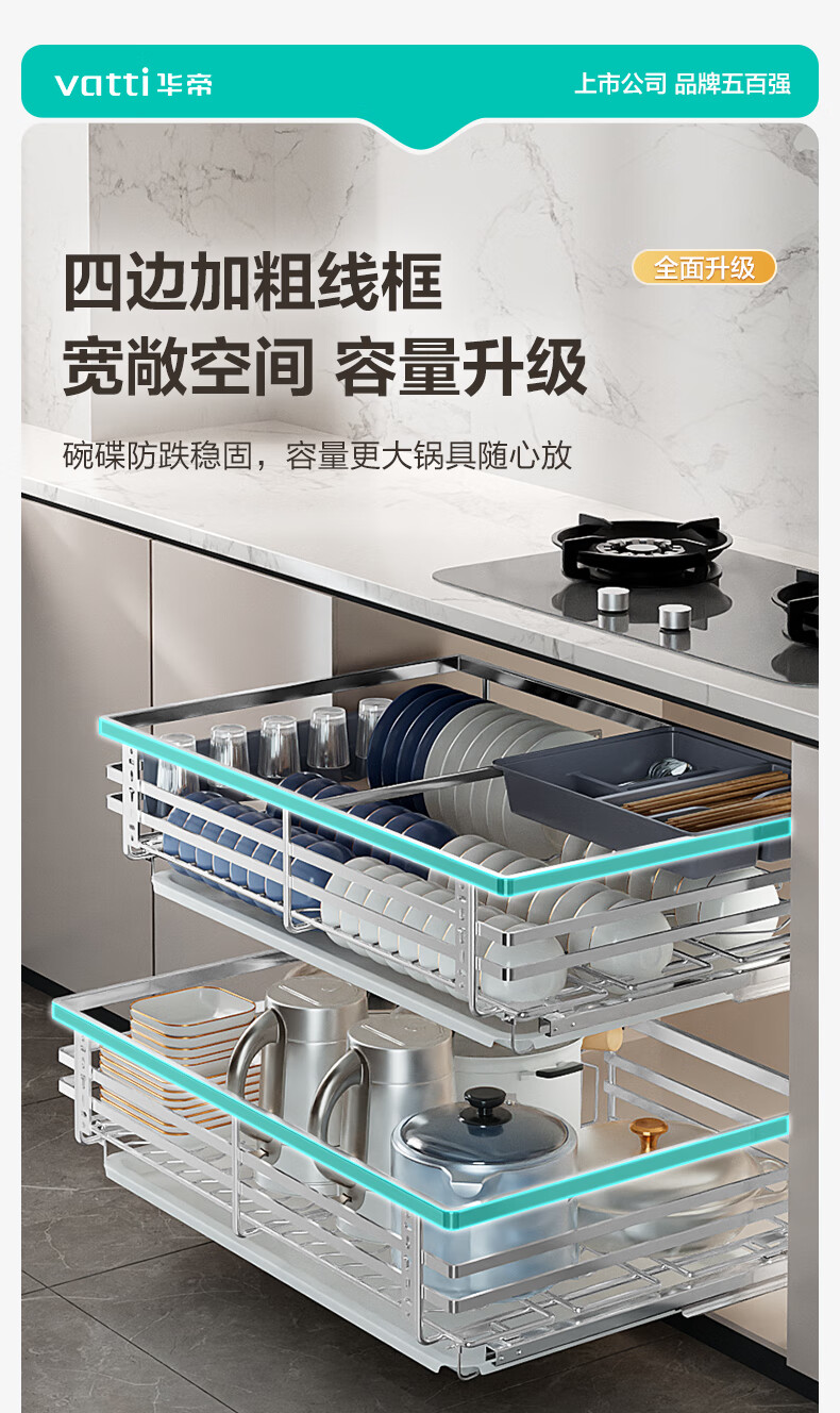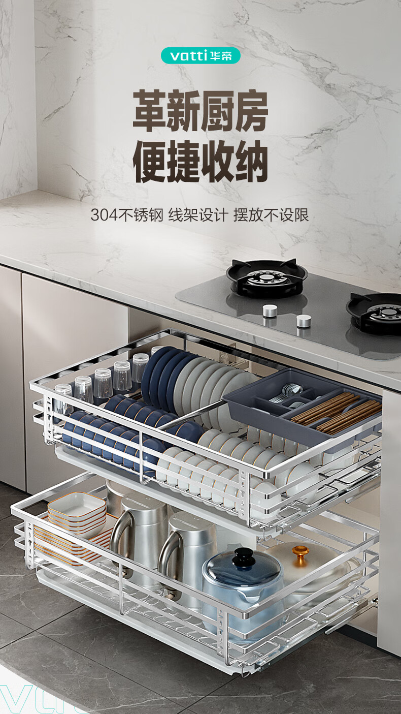 华帝(VATTI)橱柜拉篮厨房碗篮抽屉式碗碟架调味调料碗柜拉篮收纳架304不锈钢 【304不锈钢】600柜 大容量接水盘碗碟篮+平篮套装