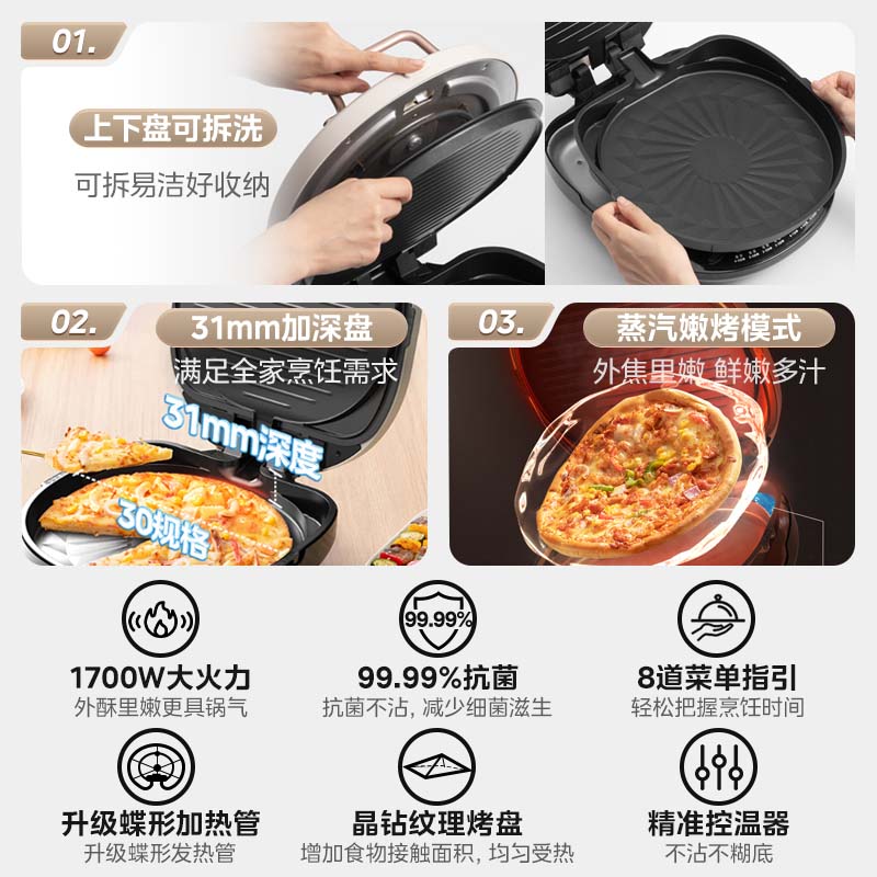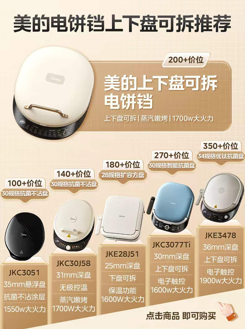 美的(Midea)电饼铛家庭用双面加热上下盘可拆洗煎饼铛煎烤机烙饼锅早餐机加深烤盘大火力大尺寸电饼档JKC3078