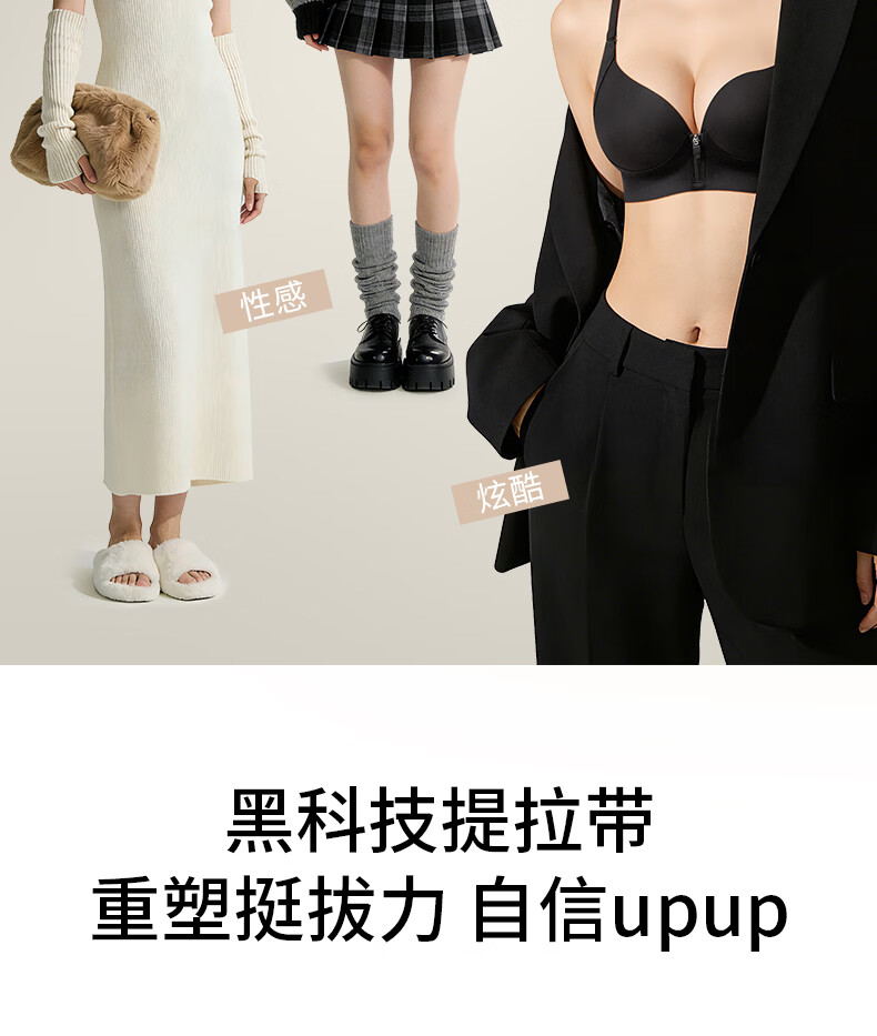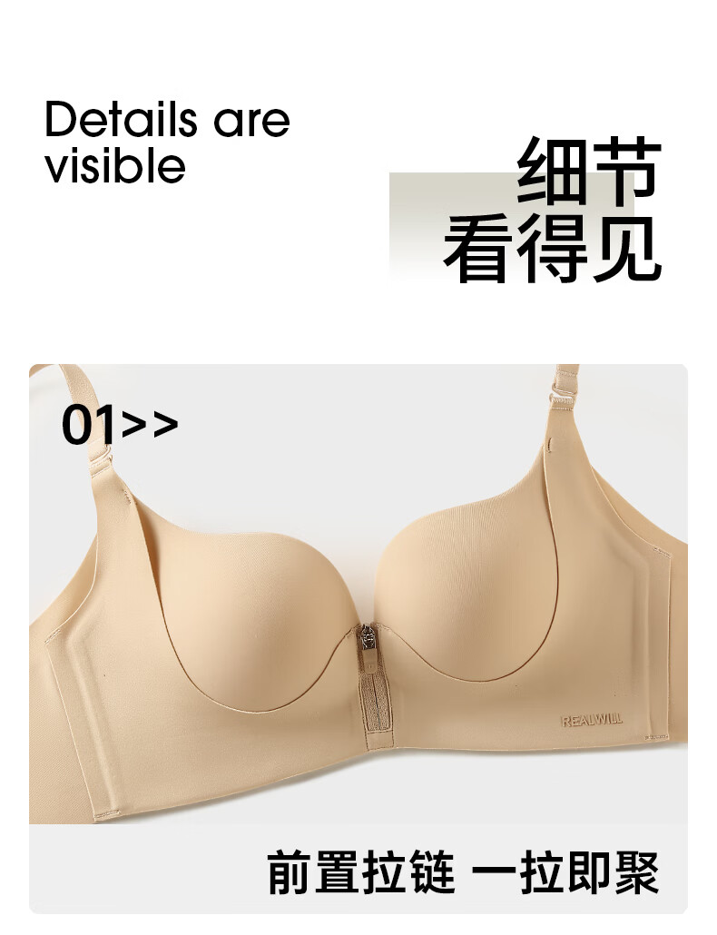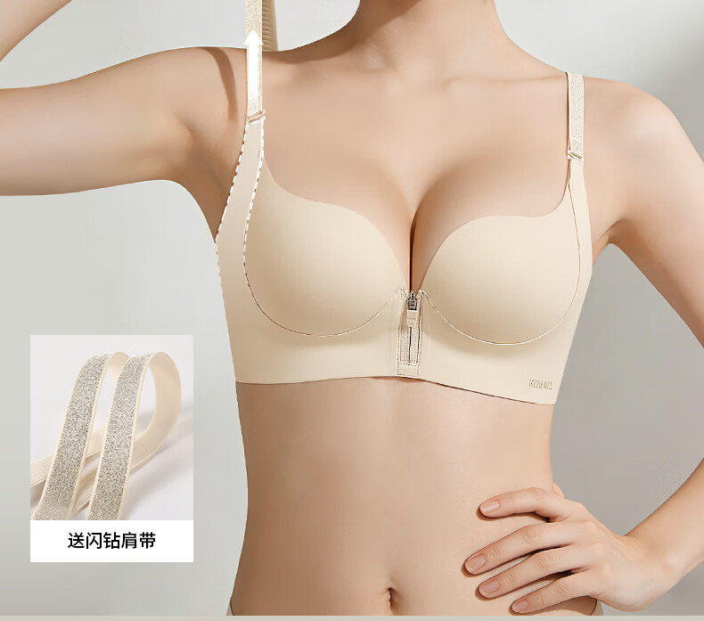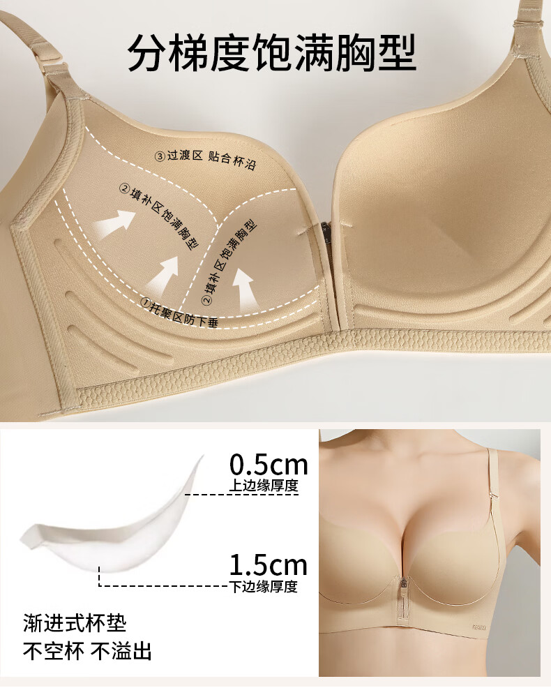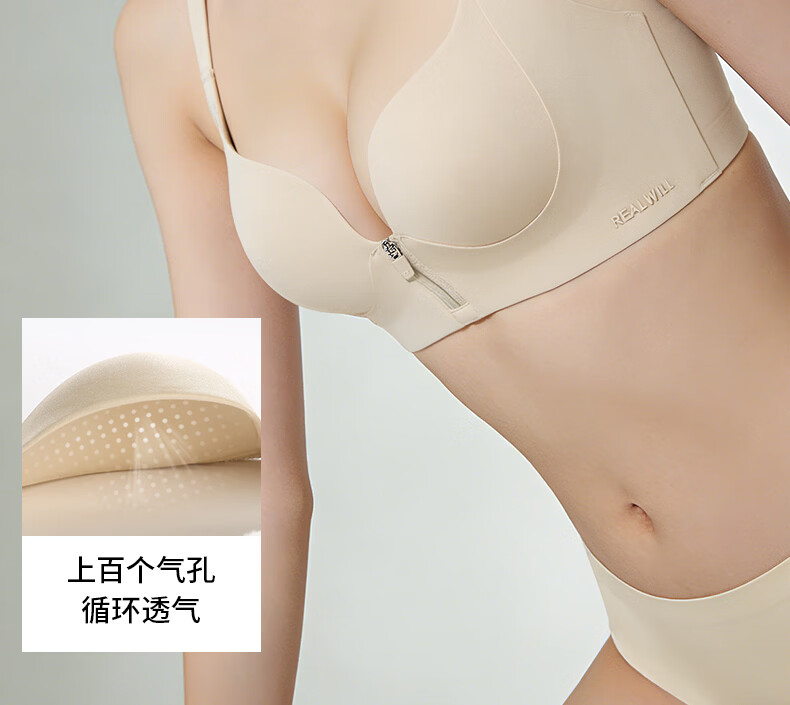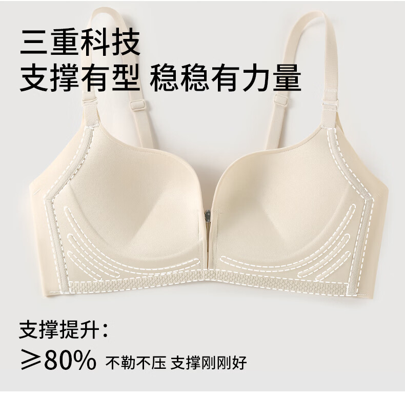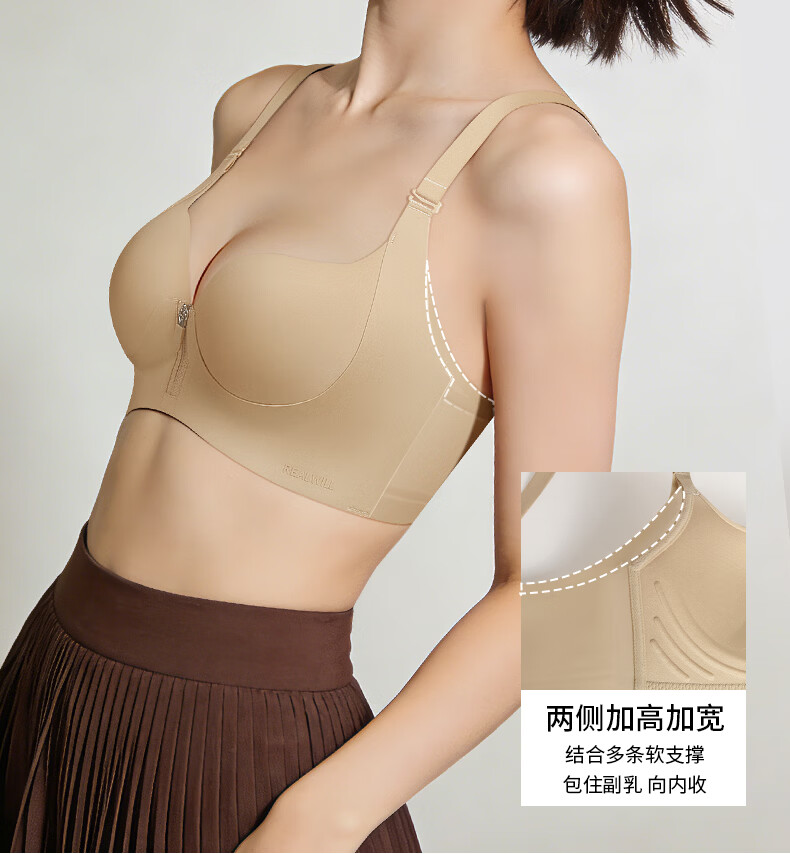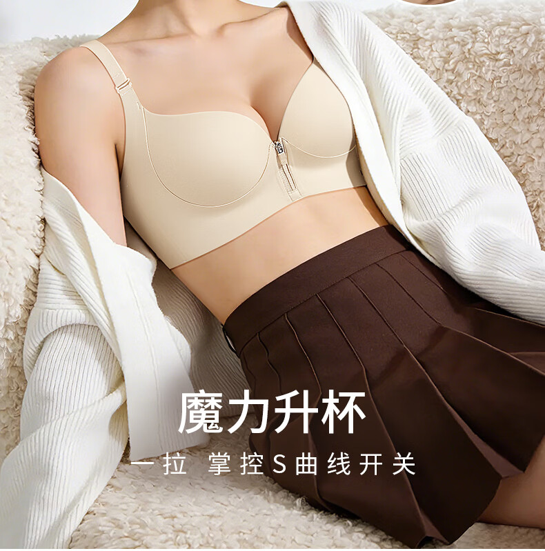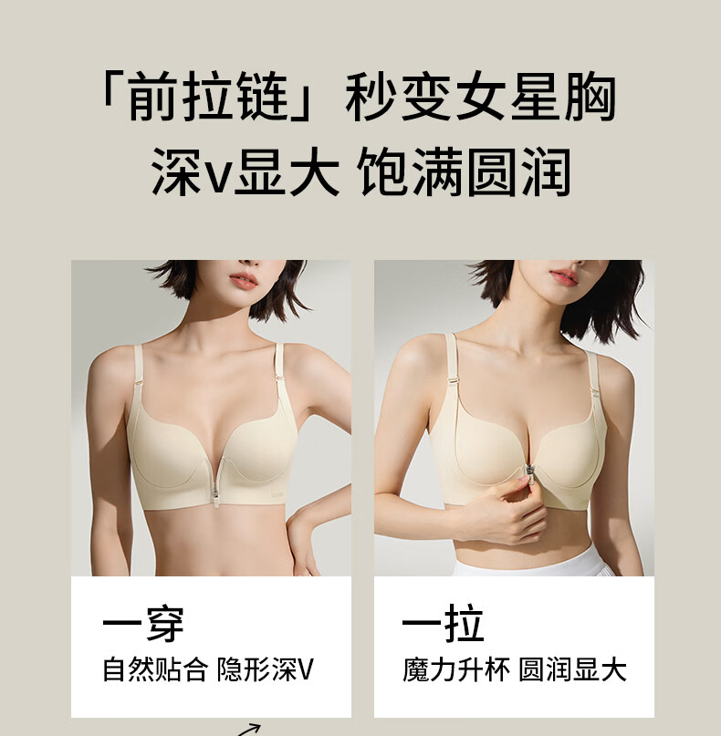 润微内衣女一拉聚前拉链升杯小胸聚拢显大圆润隐形平胸专用文胸罩 燕麦奶 L (适合80AB)