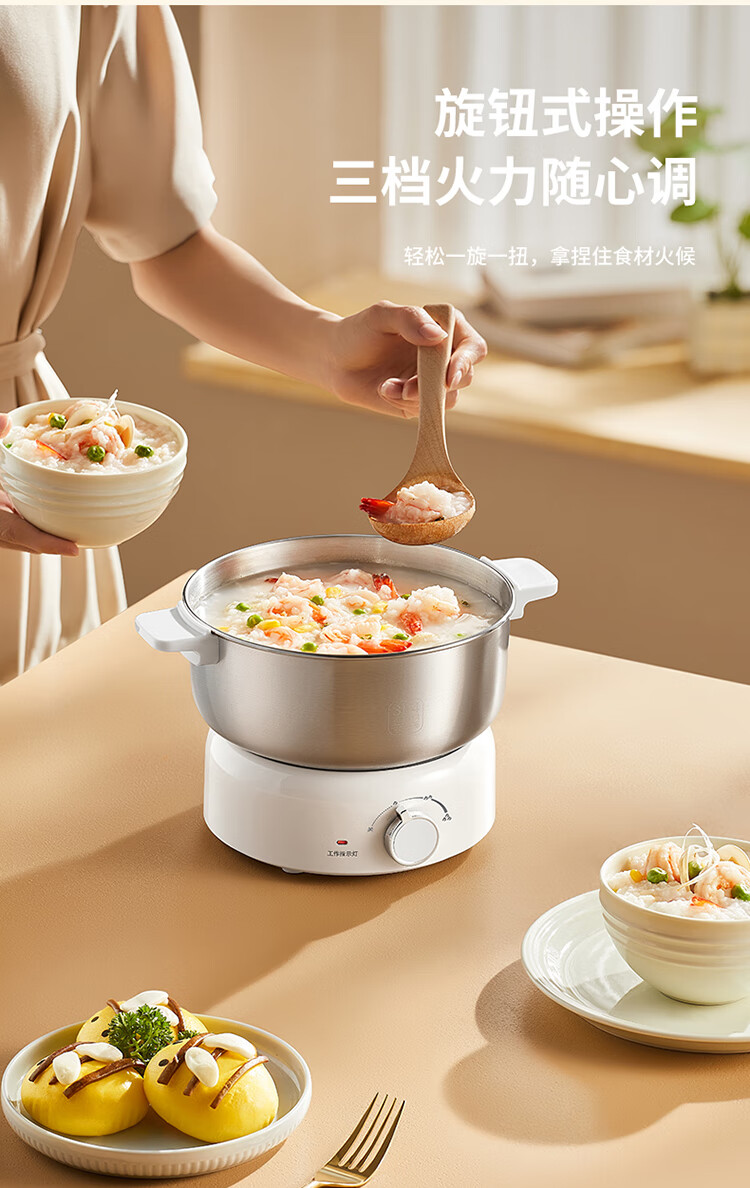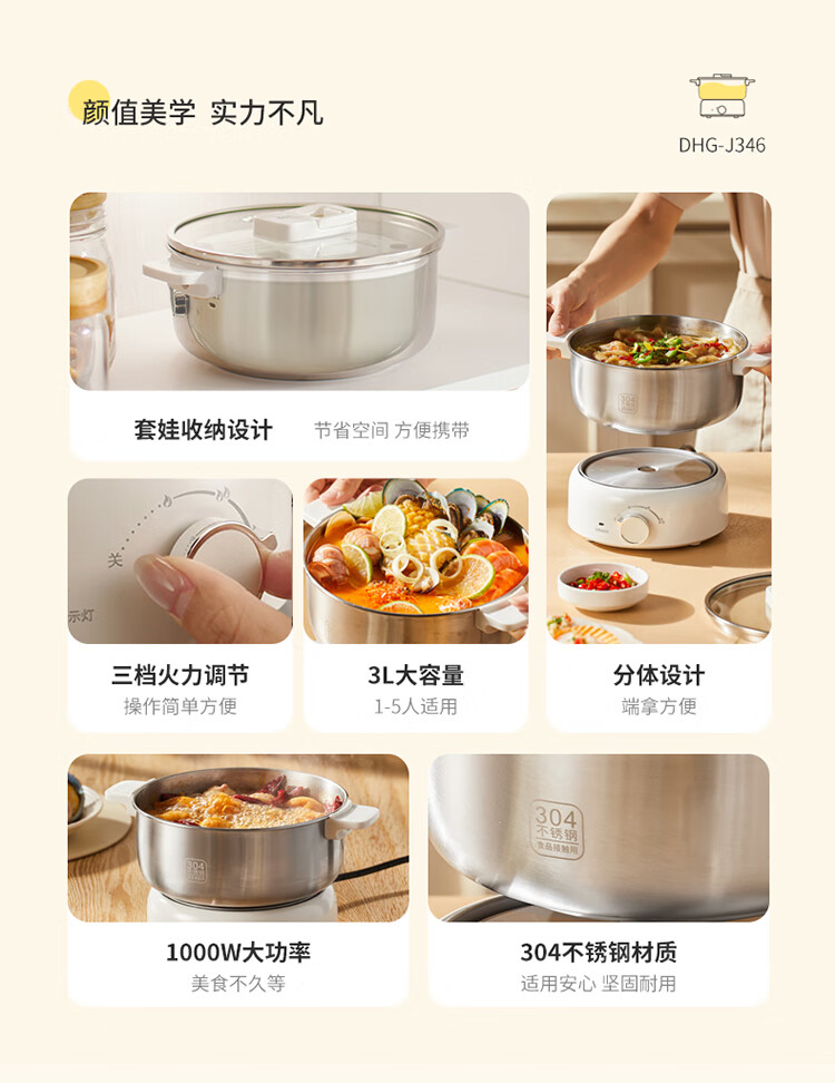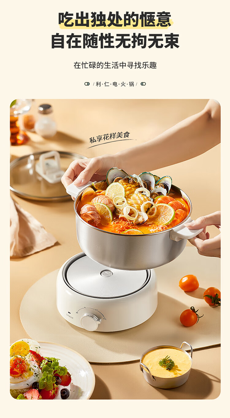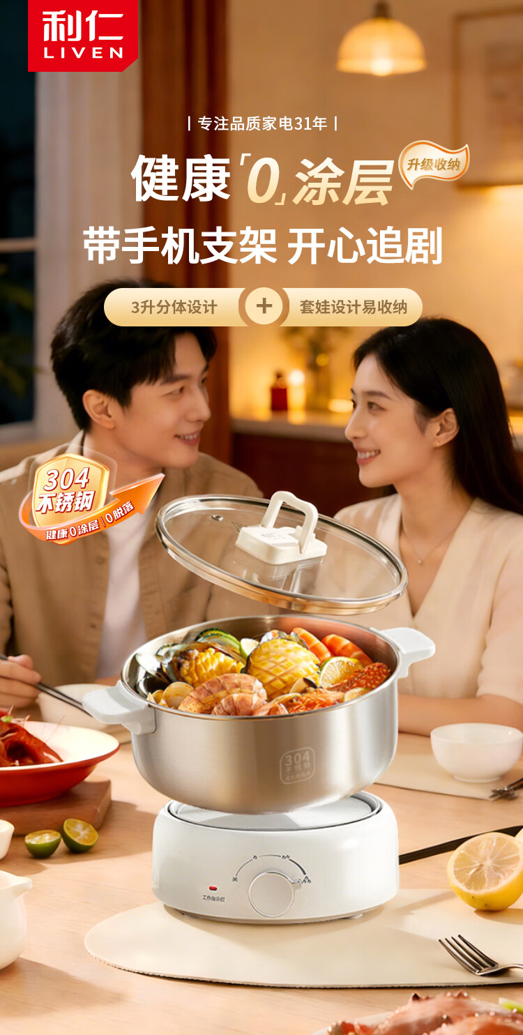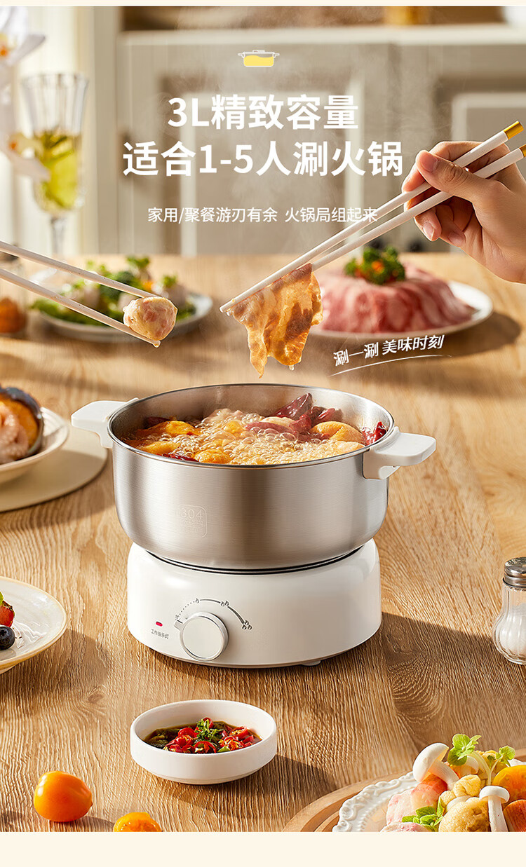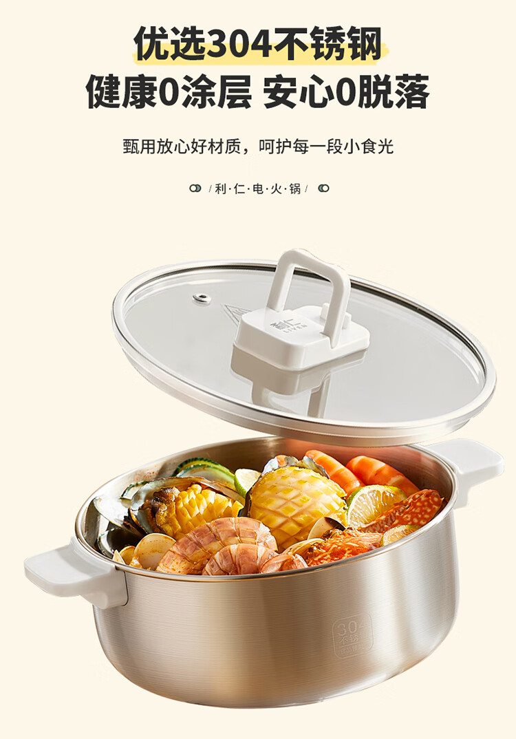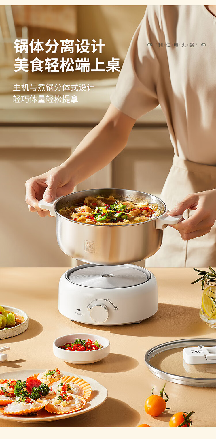 利仁(Liven)小钢人304不锈钢电火锅小型2-3人用电煮锅分体式0涂层3升小电锅旅行锅火锅专用锅电热锅DHG-J346