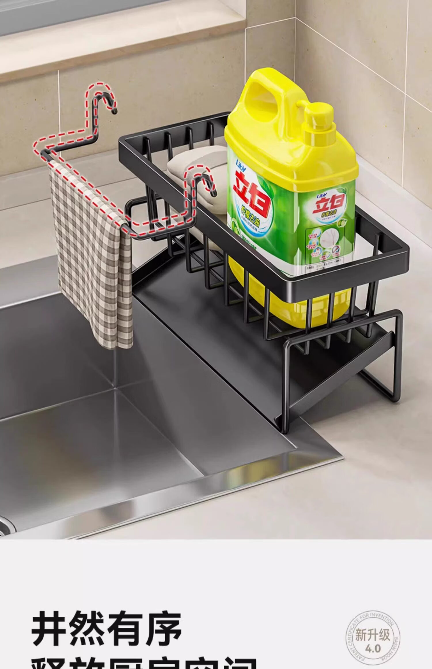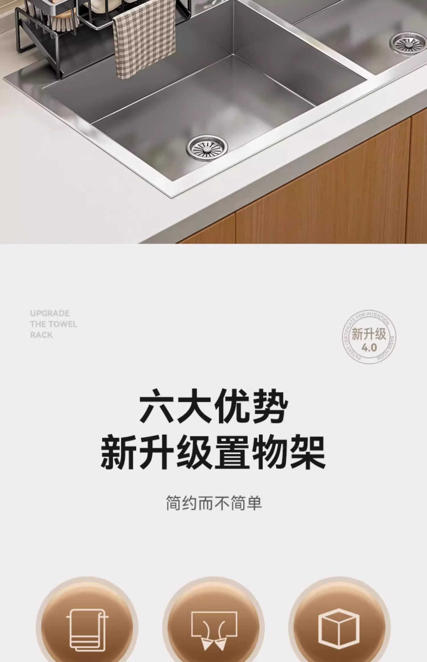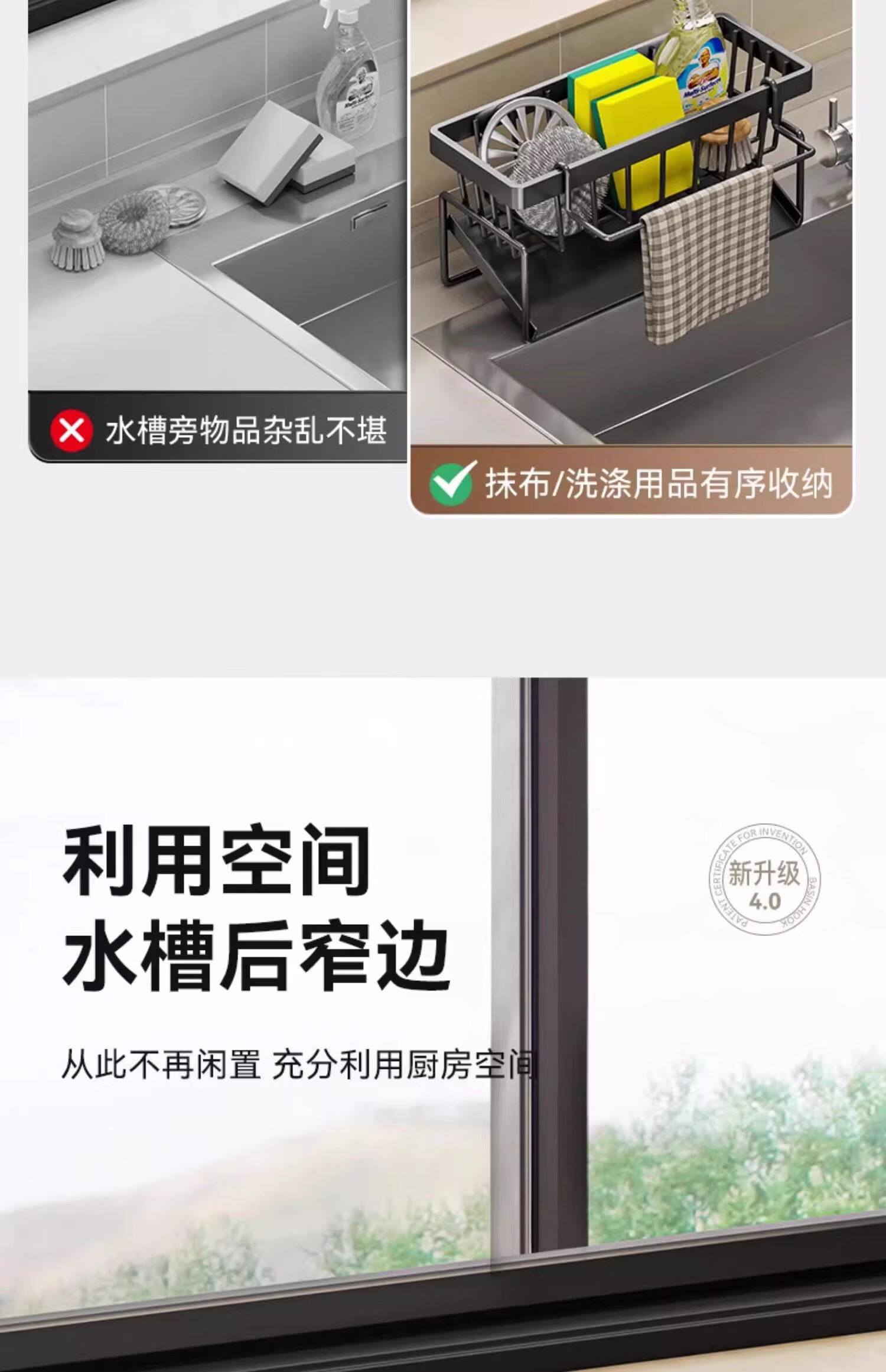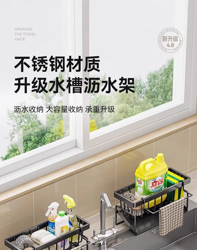 吱凡日本厨房沥水架水槽边置物架抹布架水龙头洗碗水槽用品收纳架神器 【304不锈钢】电镀款岩石灰+抹布杆
