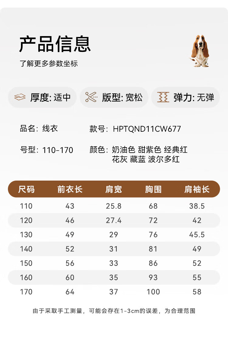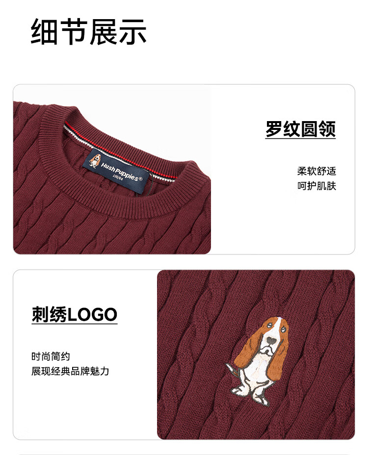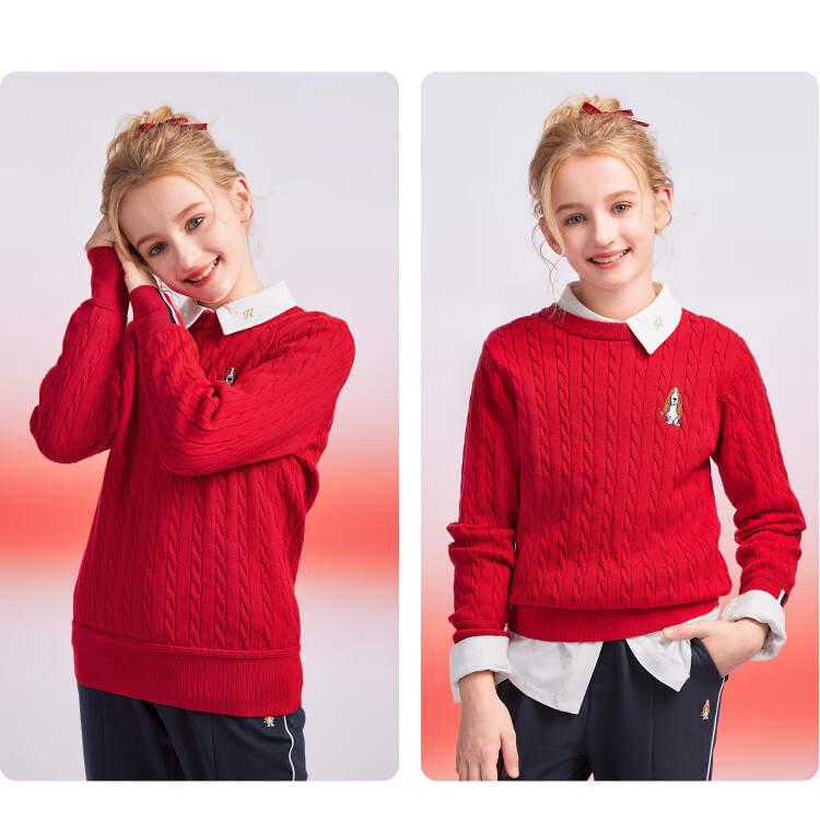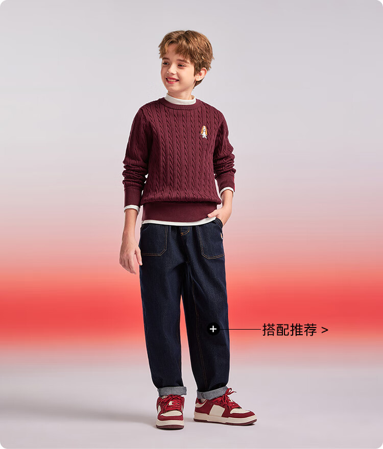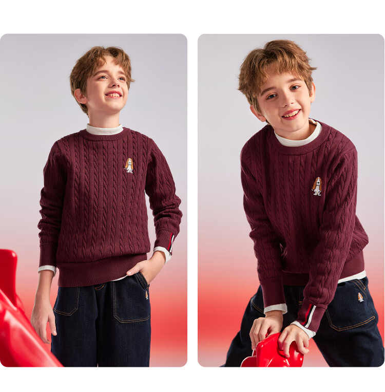 暇步士(Hush Puppies)【青少款】童装儿童男女大童秋季款简约经典肌理绞花舒适线衣 波尔多红 130 cm