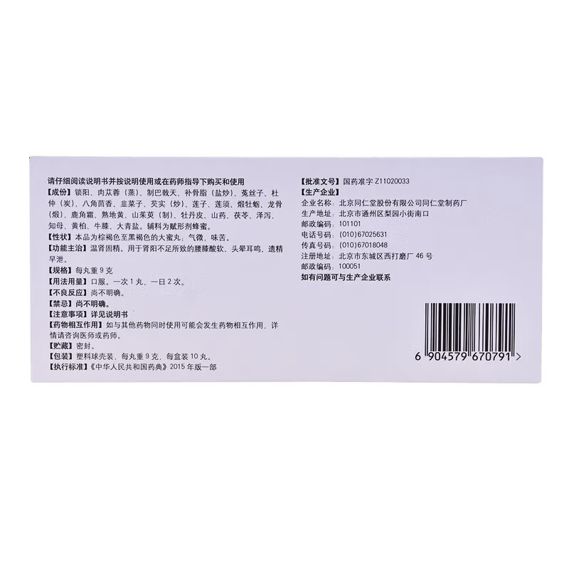 北京同仁堂 锁阳固精丸9g*10丸/盒(大蜜丸) 温肾固精 用于肾阳不足所致的腰膝酸软、头晕耳鸣、遗精早泄