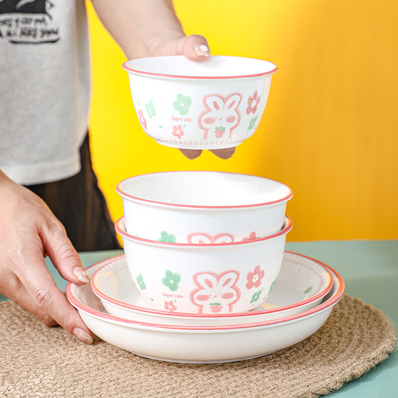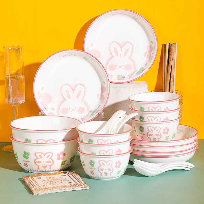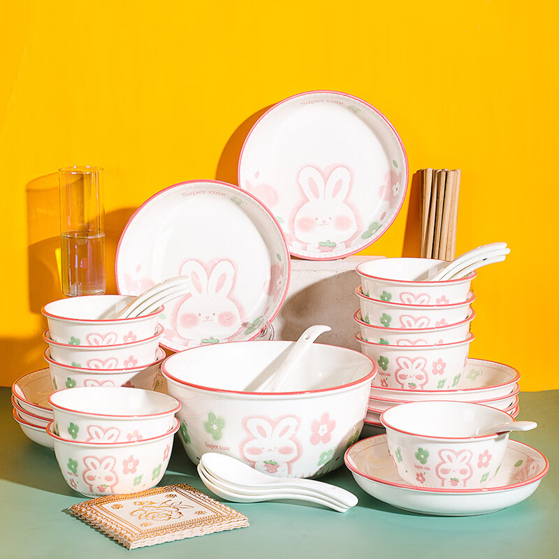 溥畔24人碗碟套装家用陶瓷餐具创意个性粉萌兔碗盘情侣套装碗筷组合 烟雨谣2碗[4.5英寸米饭碗]