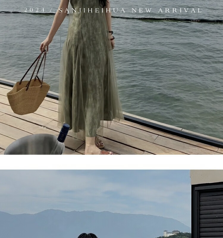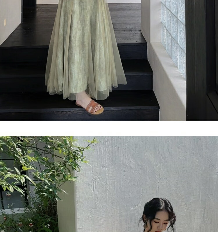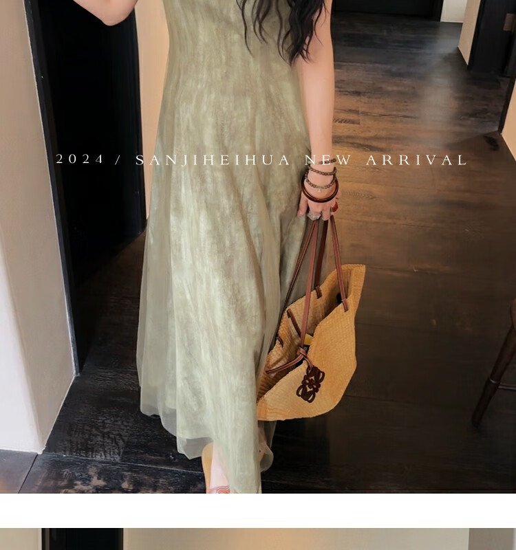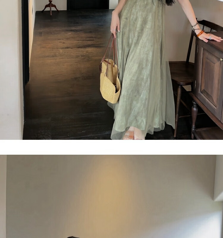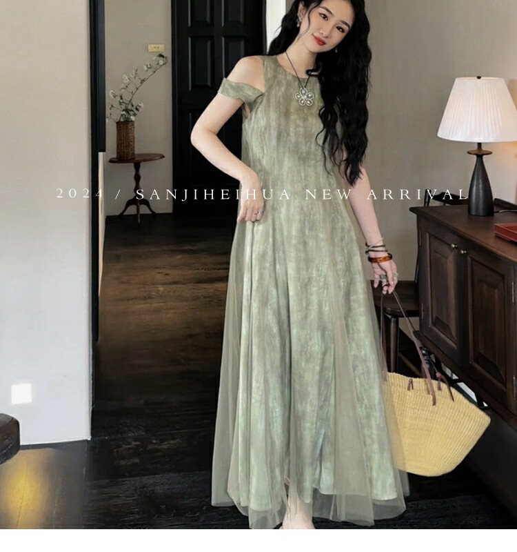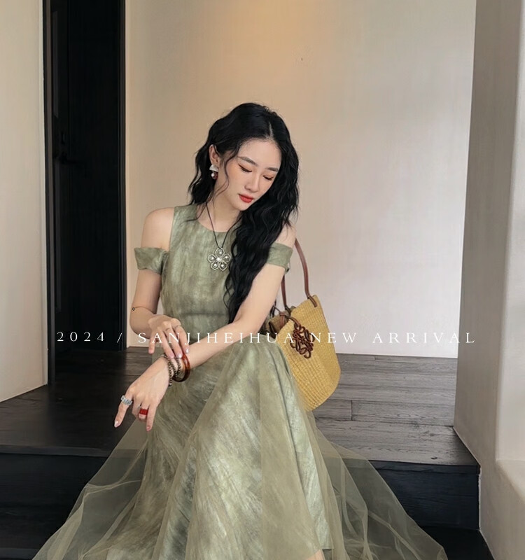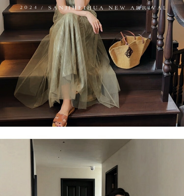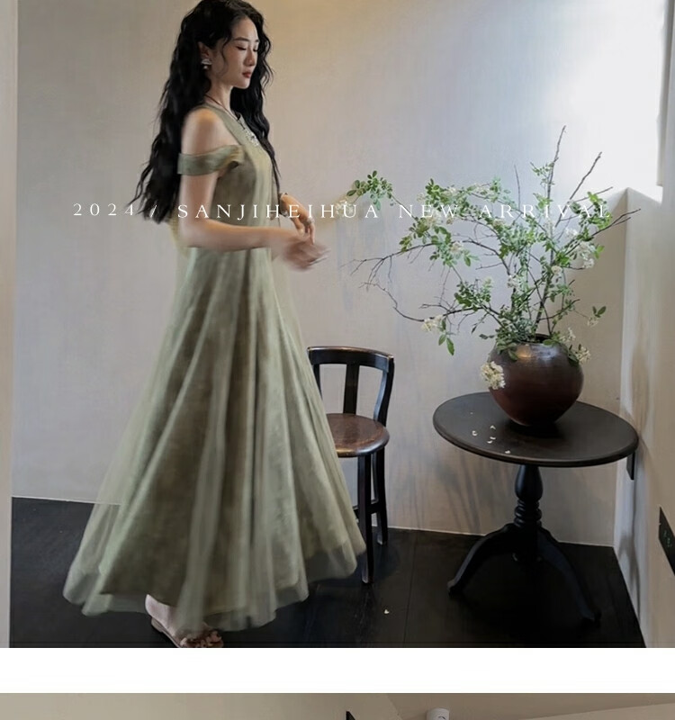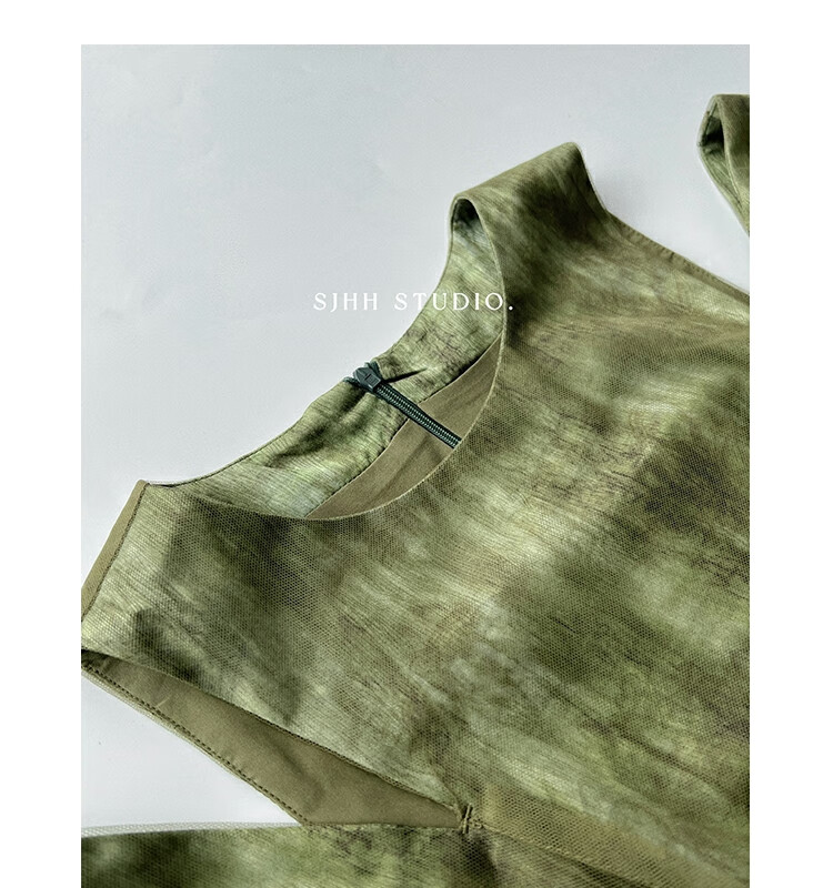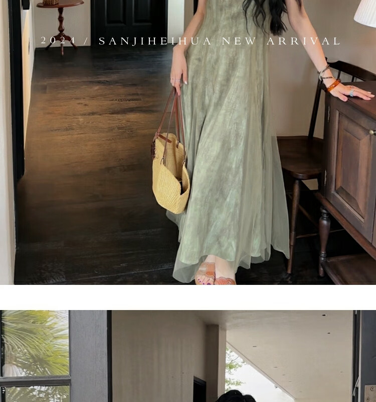 三吉黑花鹦鹉梨严选【烟雨客】夏季新款女设计款简约拼纱裙气质高级感小 豆绿 现货 M