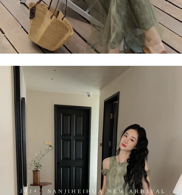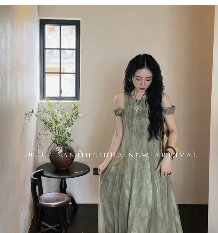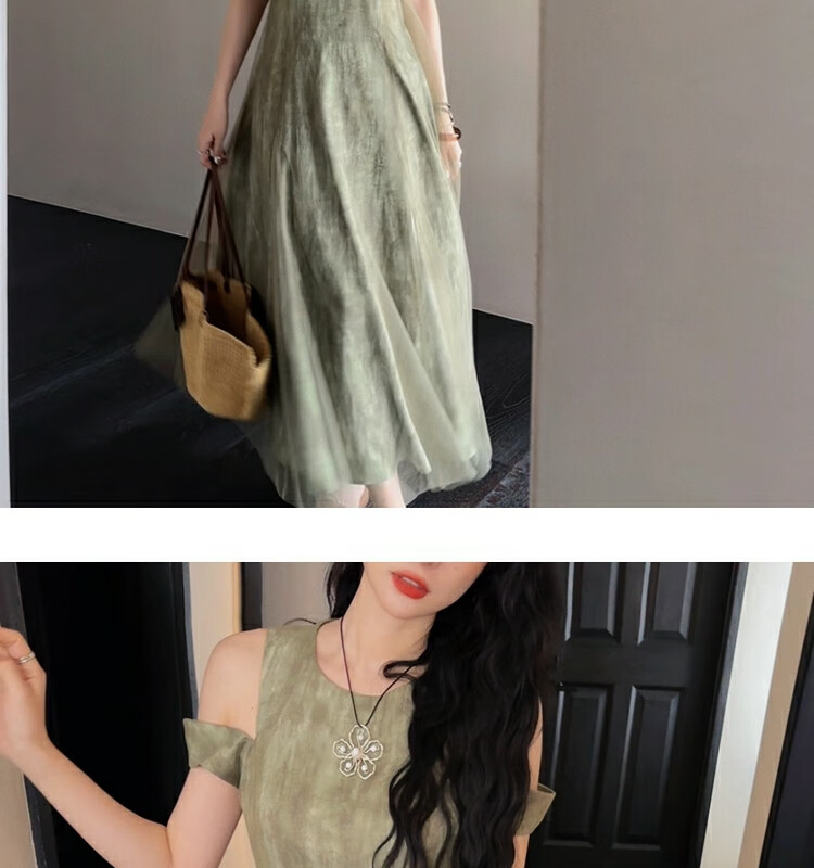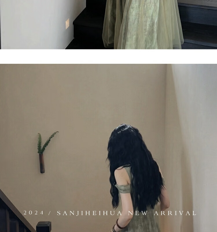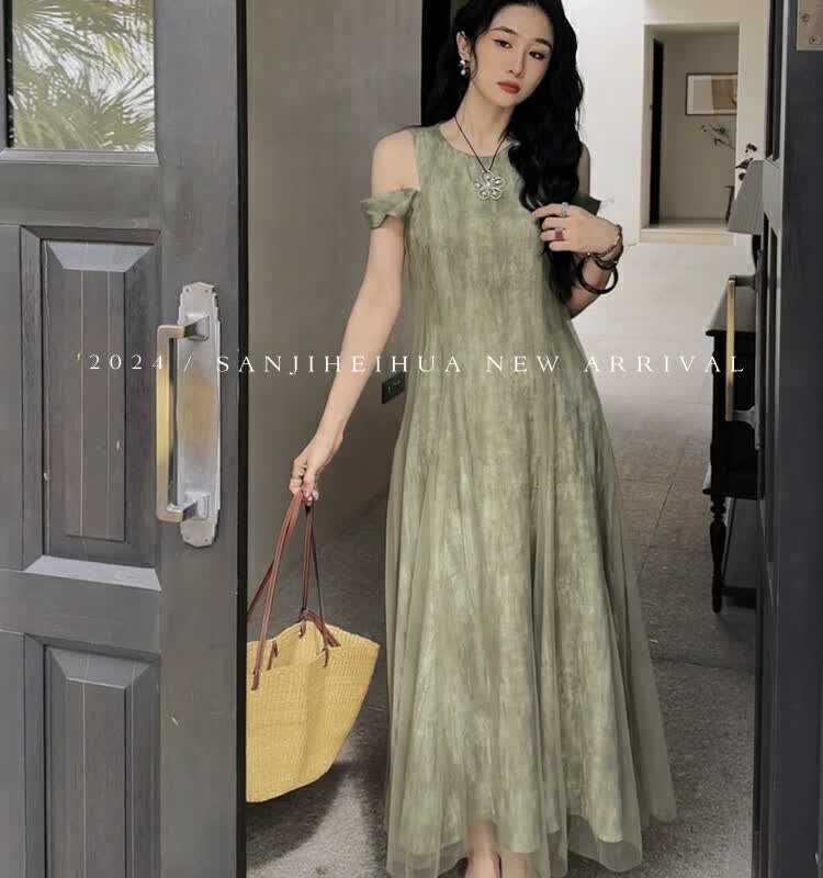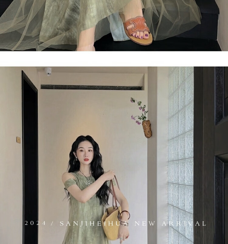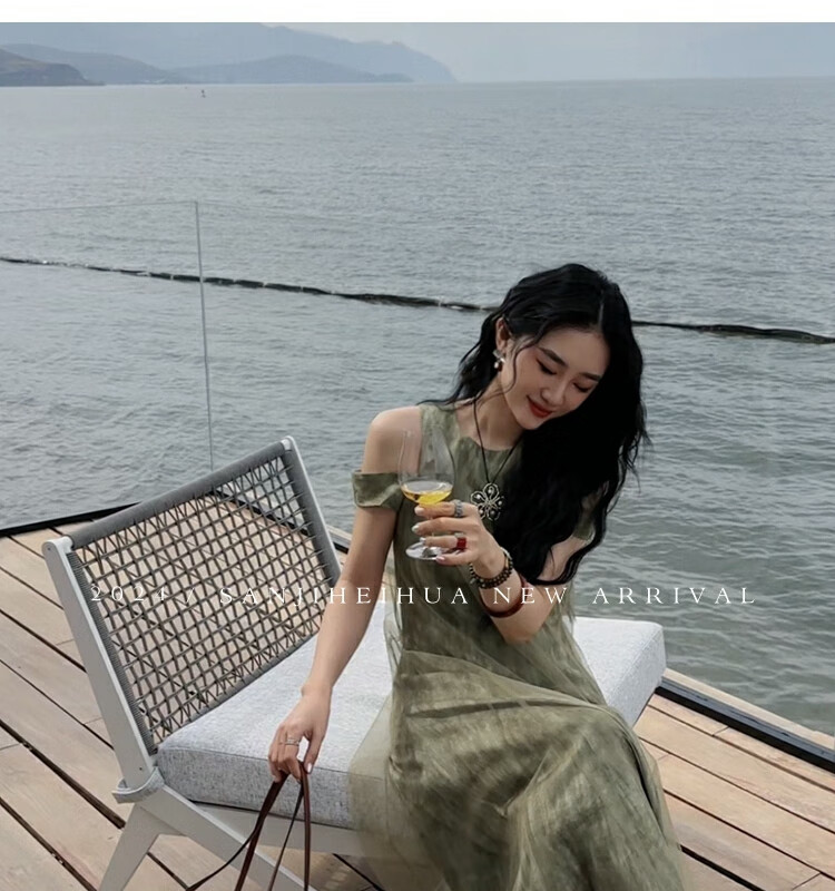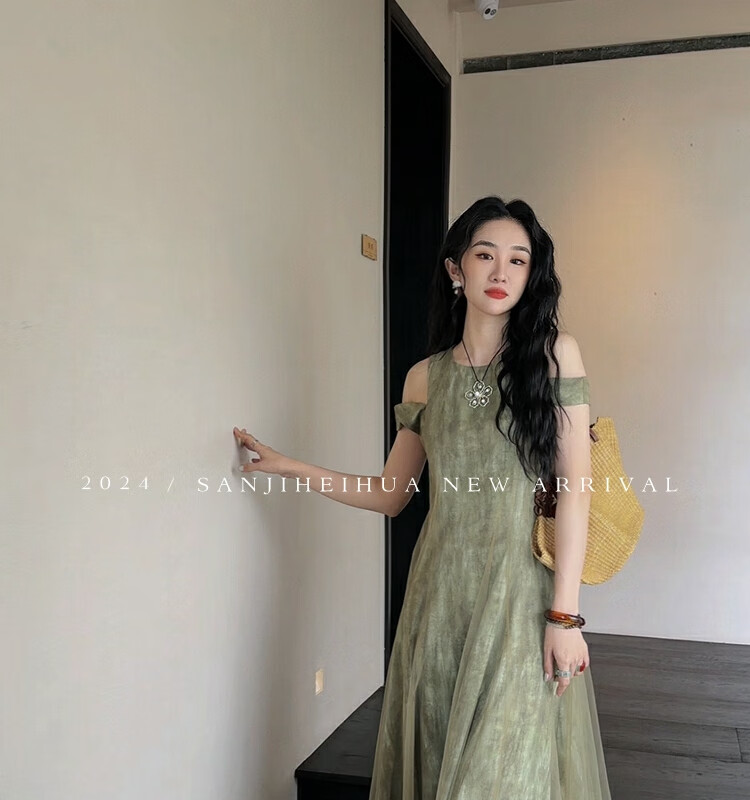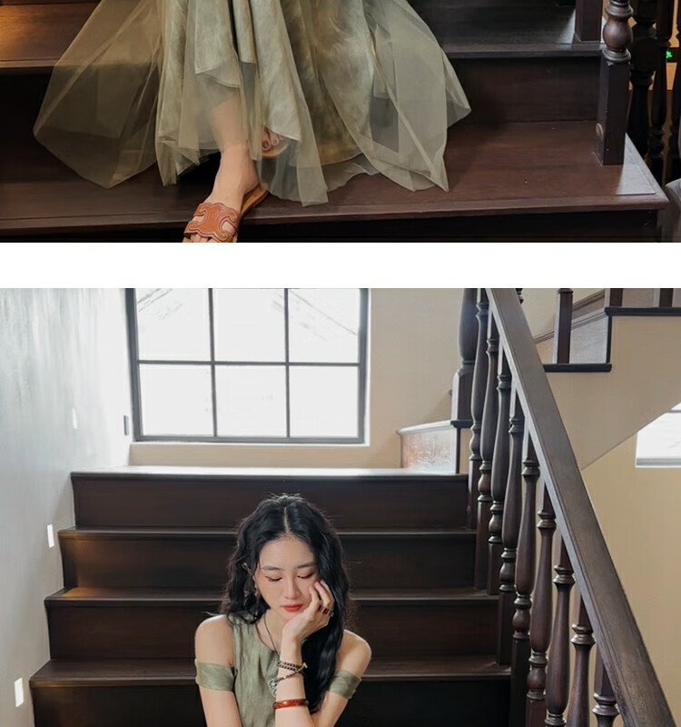 三吉黑花鹦鹉梨严选【烟雨客】夏季新款女设计款简约拼纱裙气质高级感小 豆绿 现货 M