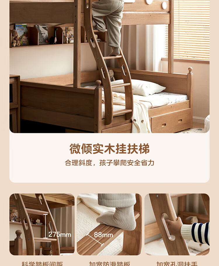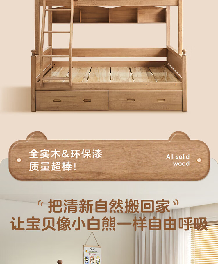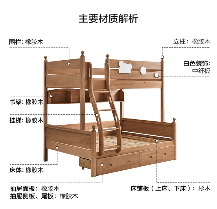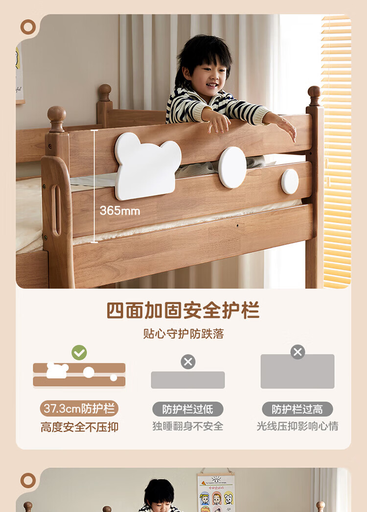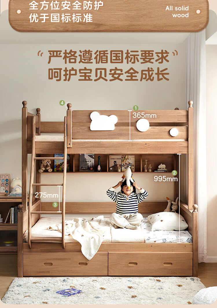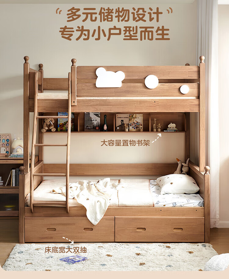 全友家居儿童上下铺全实木双层高低床带护栏男孩女孩小户型收纳储物床 橡胶木|上下床 1.2x1.9米