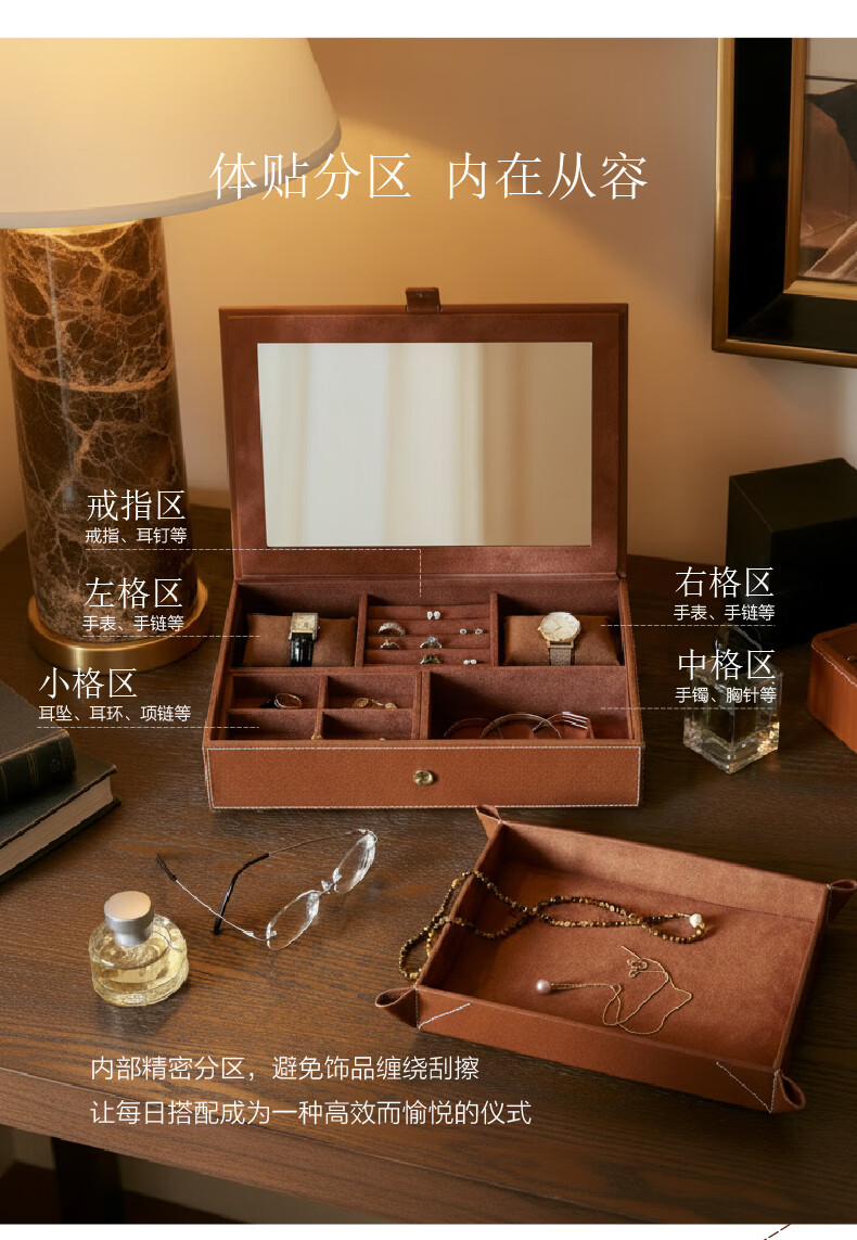 梵瀚木质首饰收纳盒轻奢高档饰品收纳盒新婚礼物可旋转大容量珠宝盒 莱茵旋转 五层 灰绒布 礼盒装