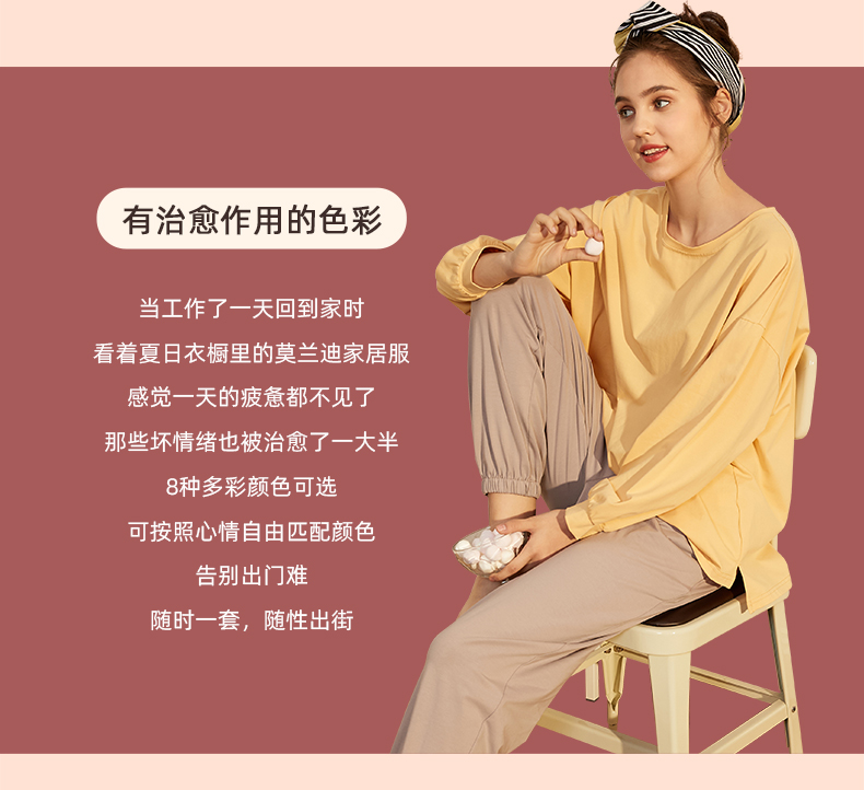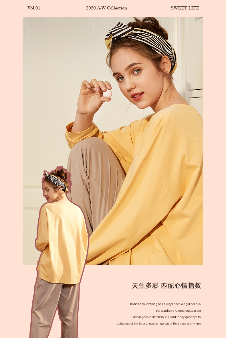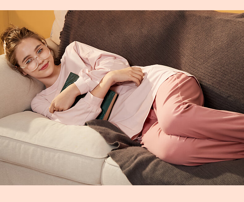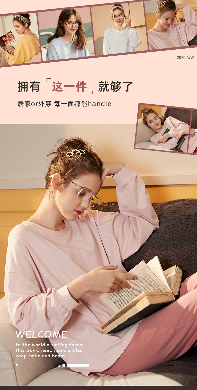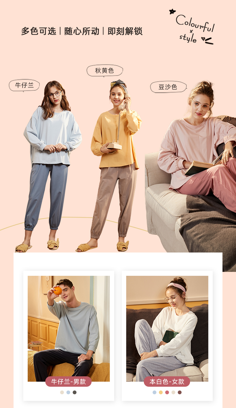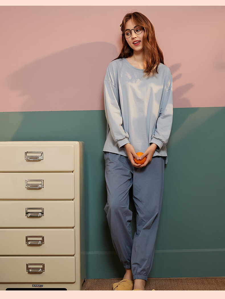 安之伴睡衣女纯棉春秋季素色可外穿女士套头长袖睡衣宽松家居服套装薄款 牛仔兰-女 L