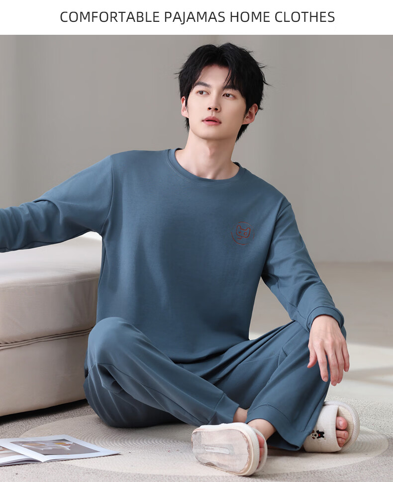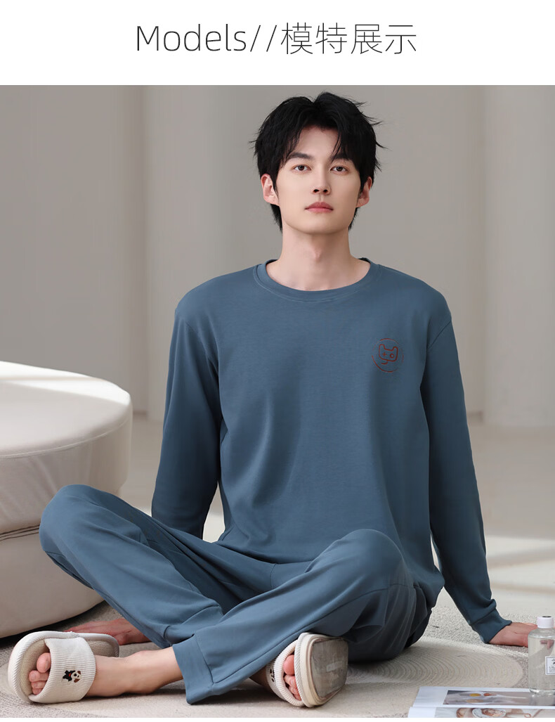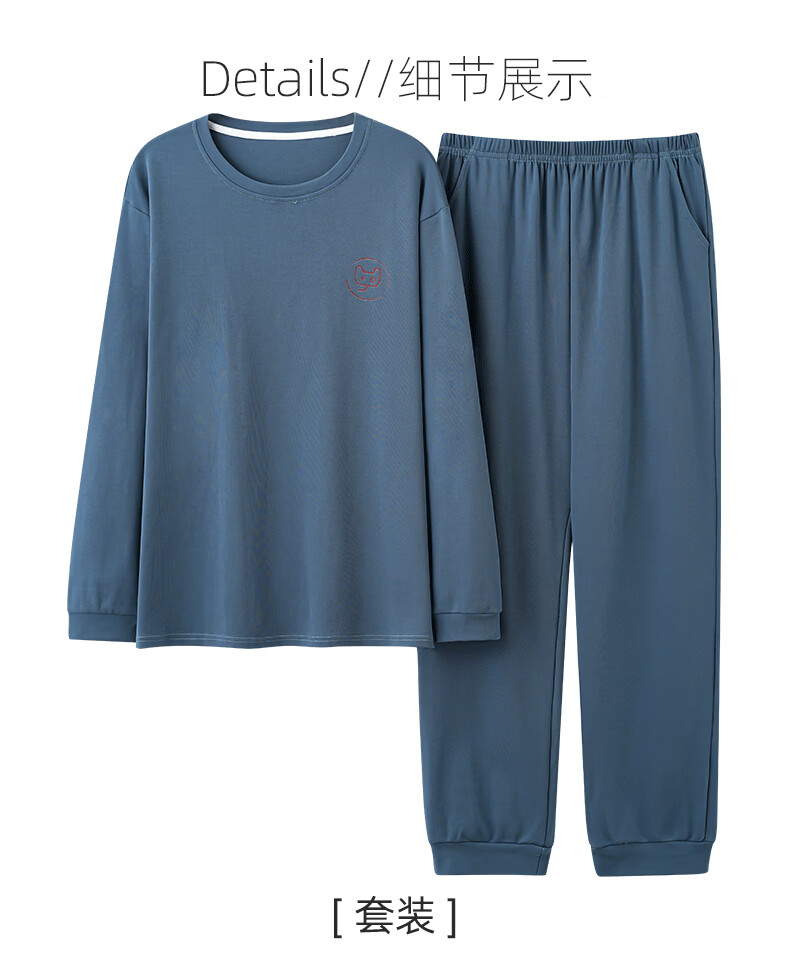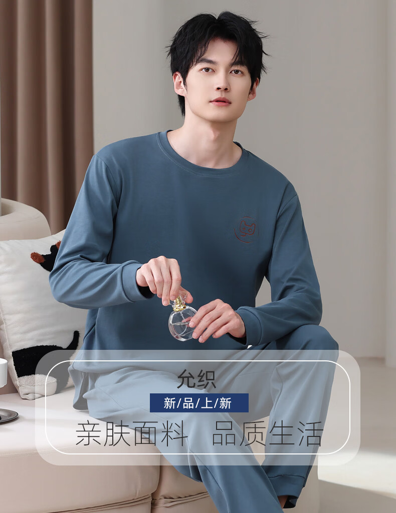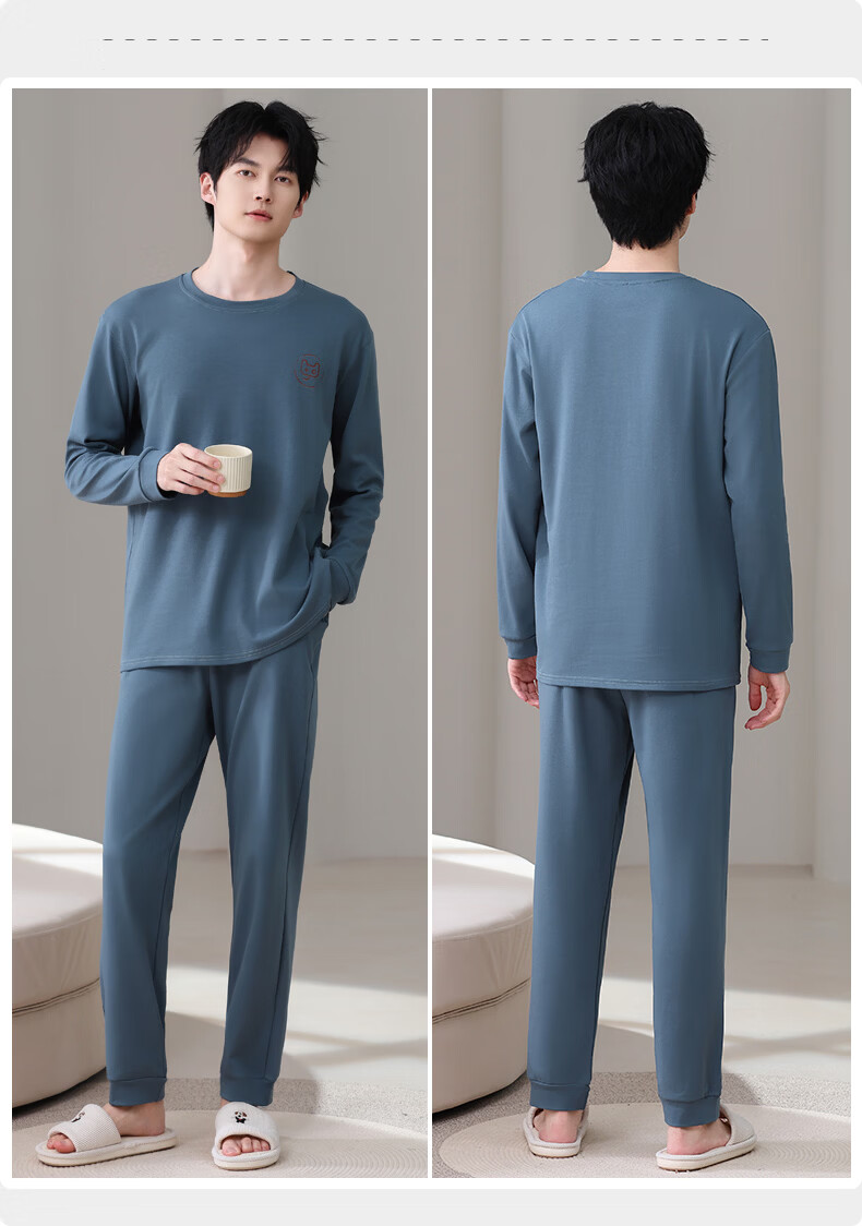 允织莱卡纯棉睡衣男春秋长袖青少年2026新款套头可外穿大码家居服套装 8606-海蓝 L (170) :建议100-135斤穿着